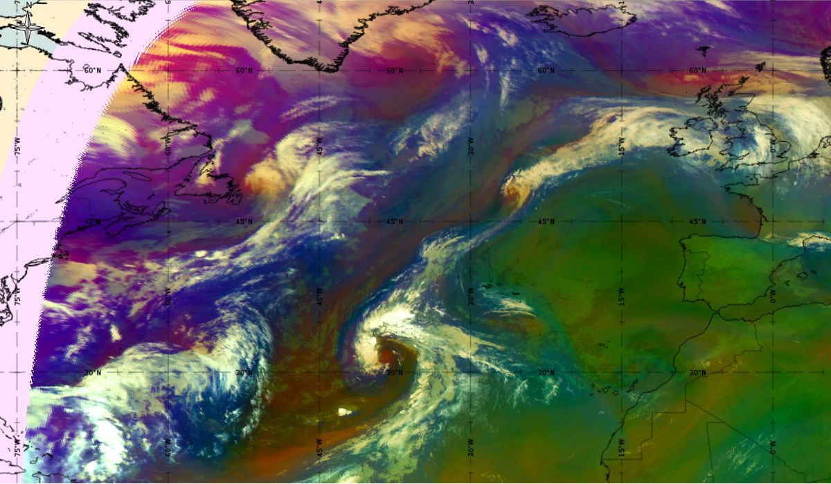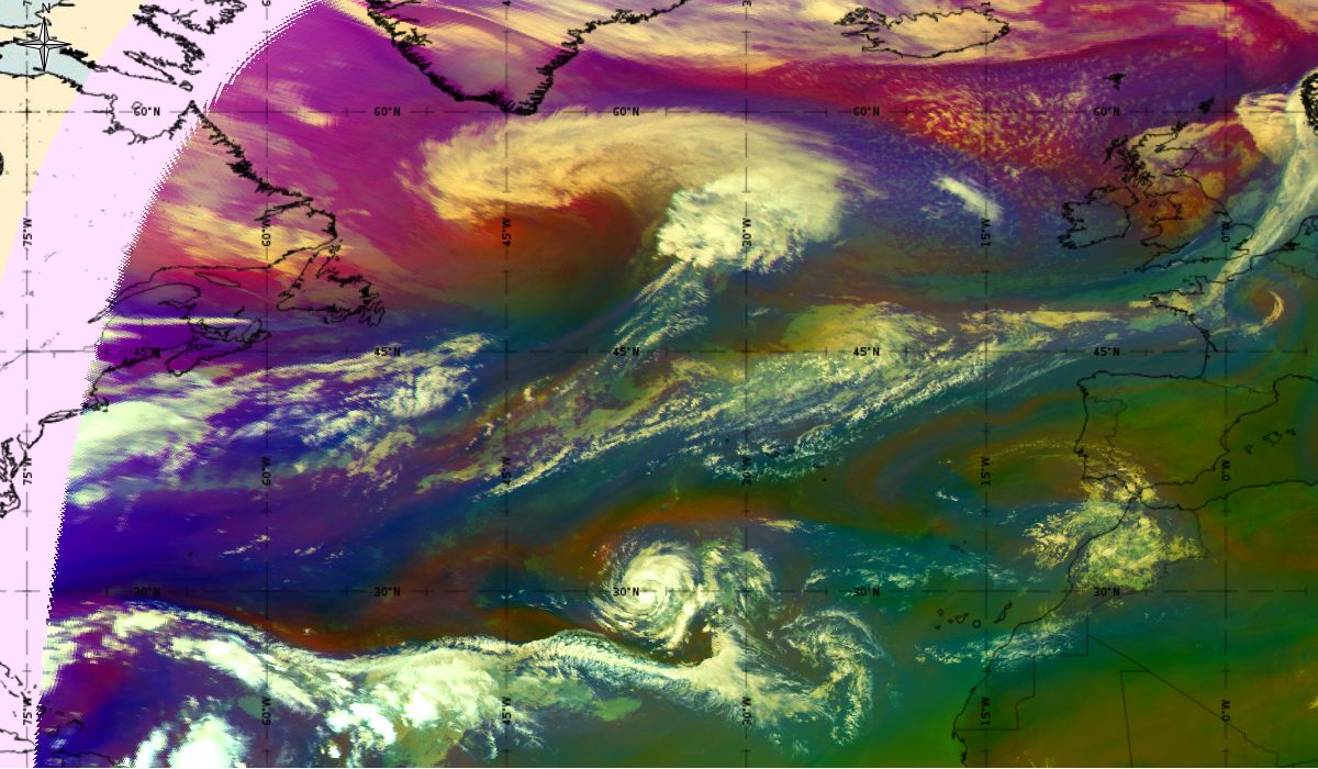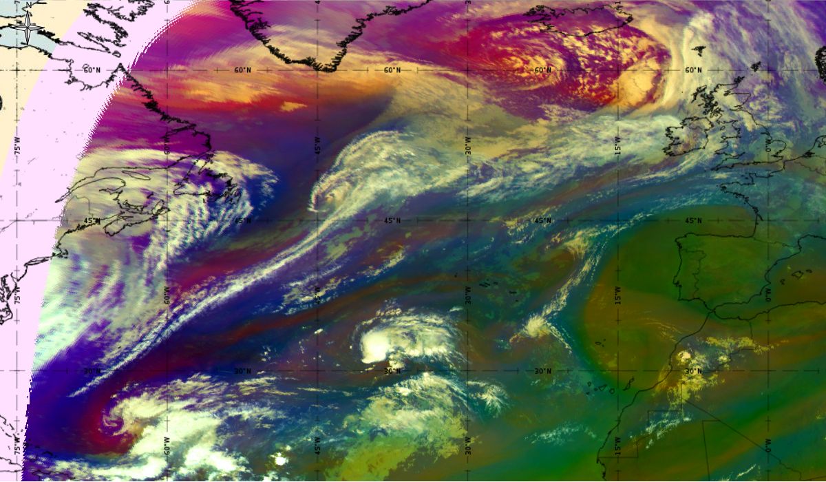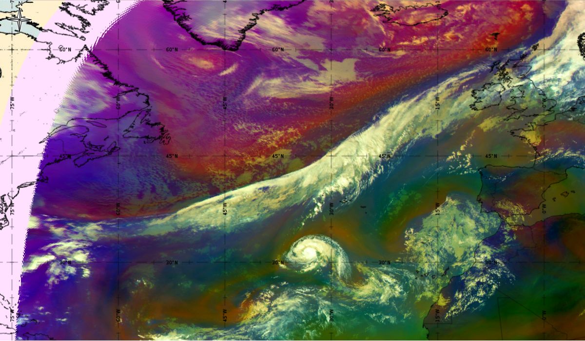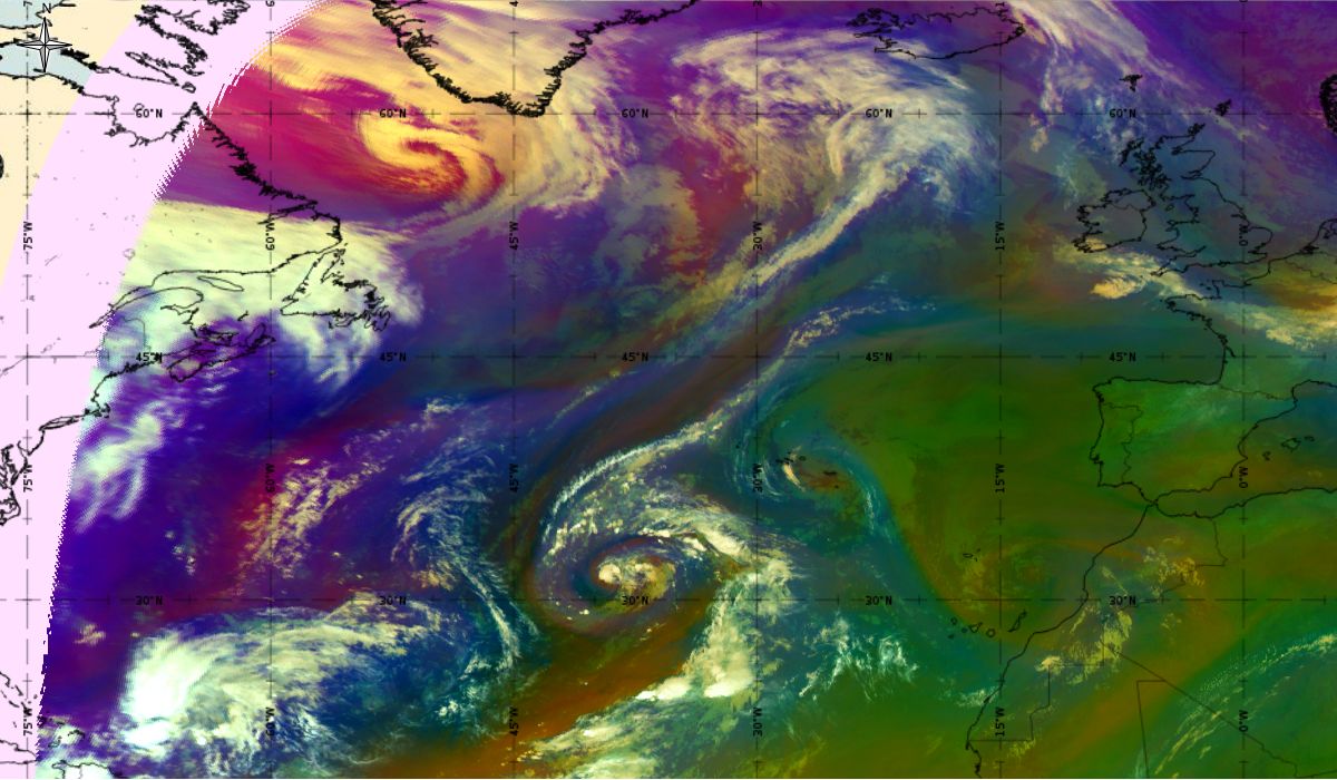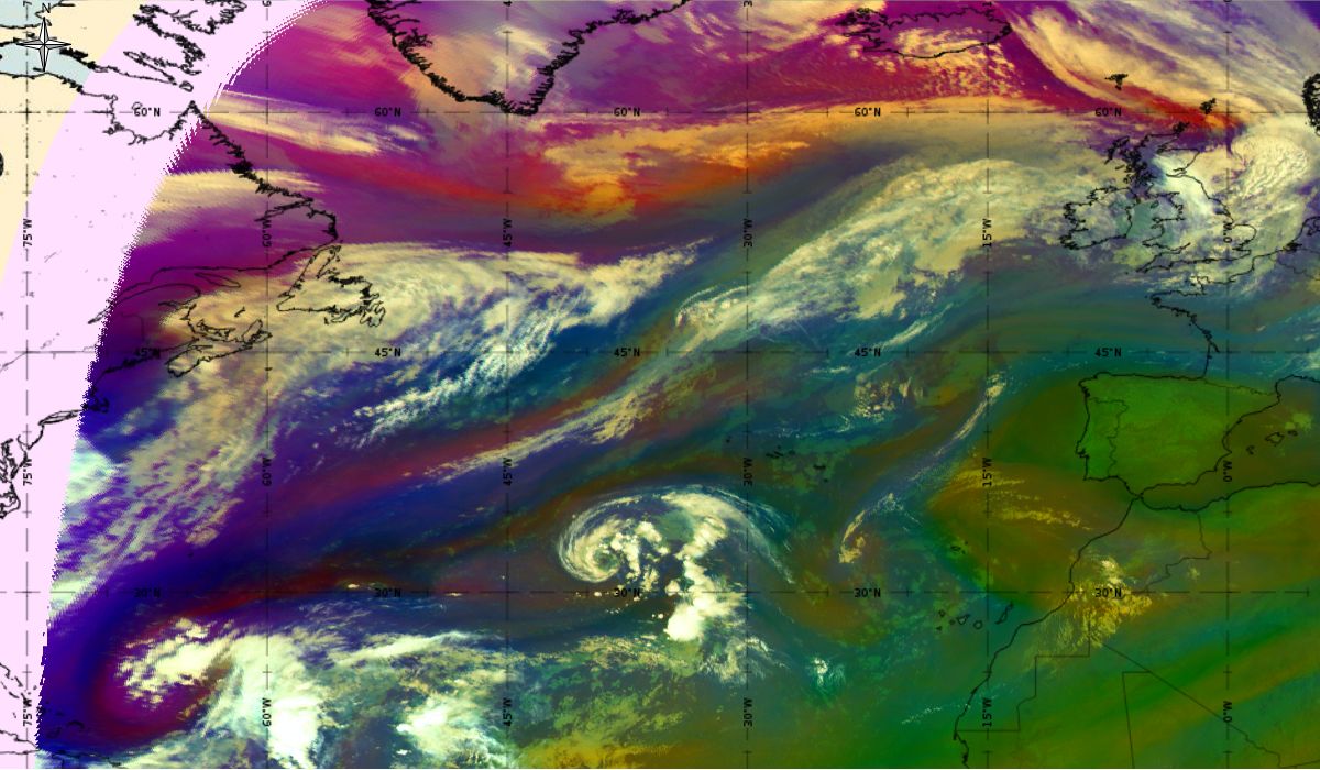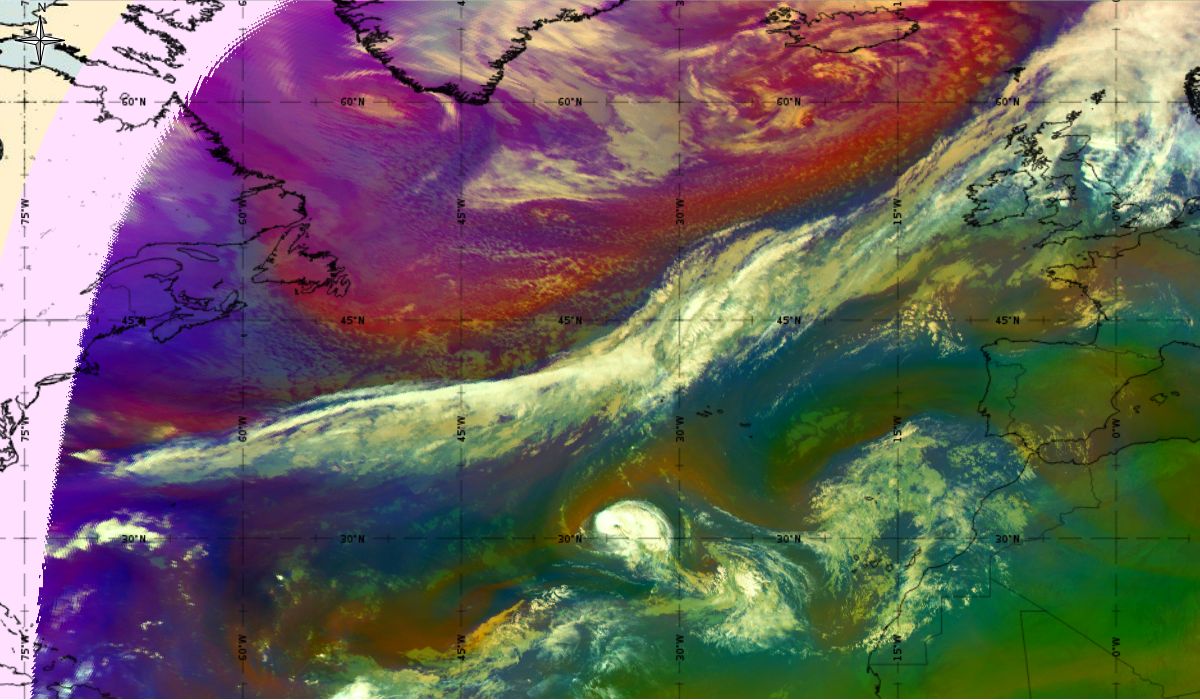 Looking at animations of RGB Airmass satellite images we notice that in the beginning, the frontal cloud band separates into two air masses - warmer over the west Atlantic and colder over the east. The jet axis is along the transition from blue to red colours at the rear side of the cloud band. Dry sinking air appears as red and indicates that cyclogenesis is ongoing. The dry air provides high potential vorticity and is the cause of further development and convection. South of the system, warm tropical air mass is greenish with lower clouds, appear less bright. Thick high-level clouds above the front are bright white.