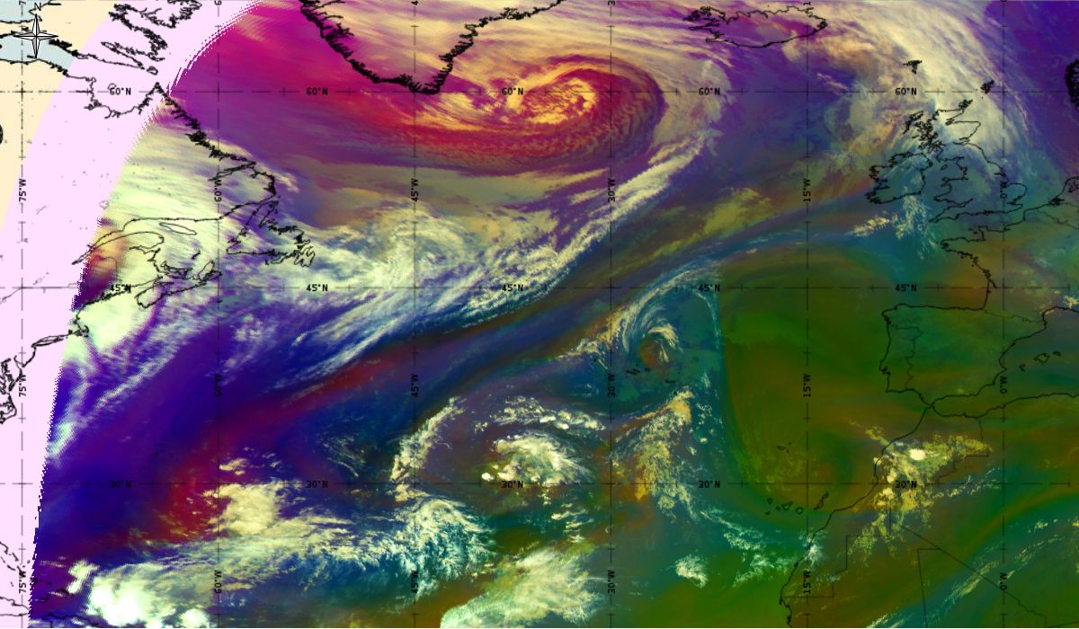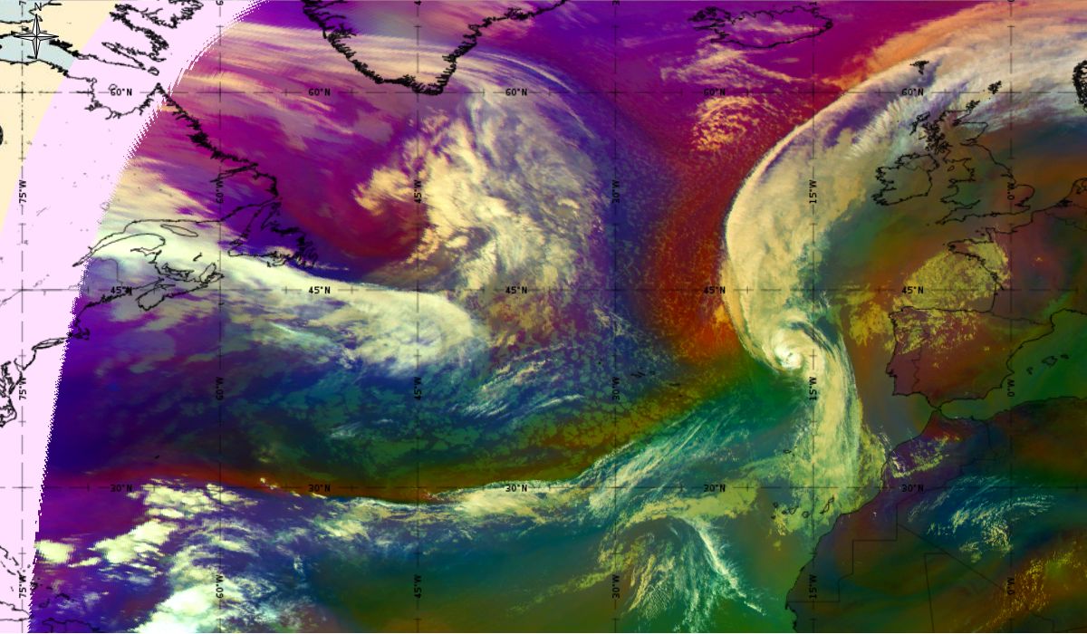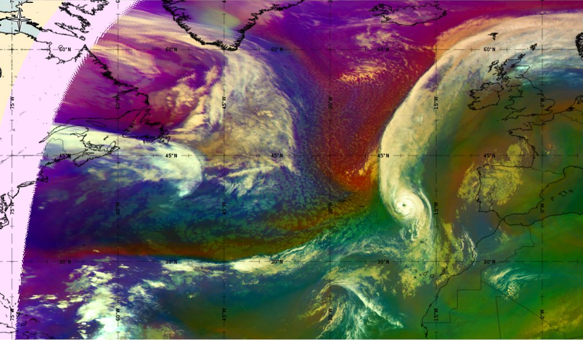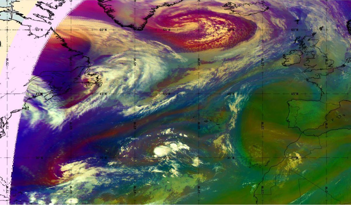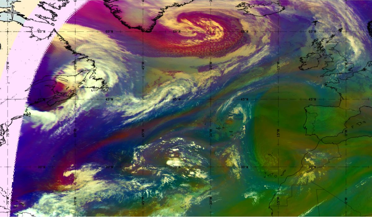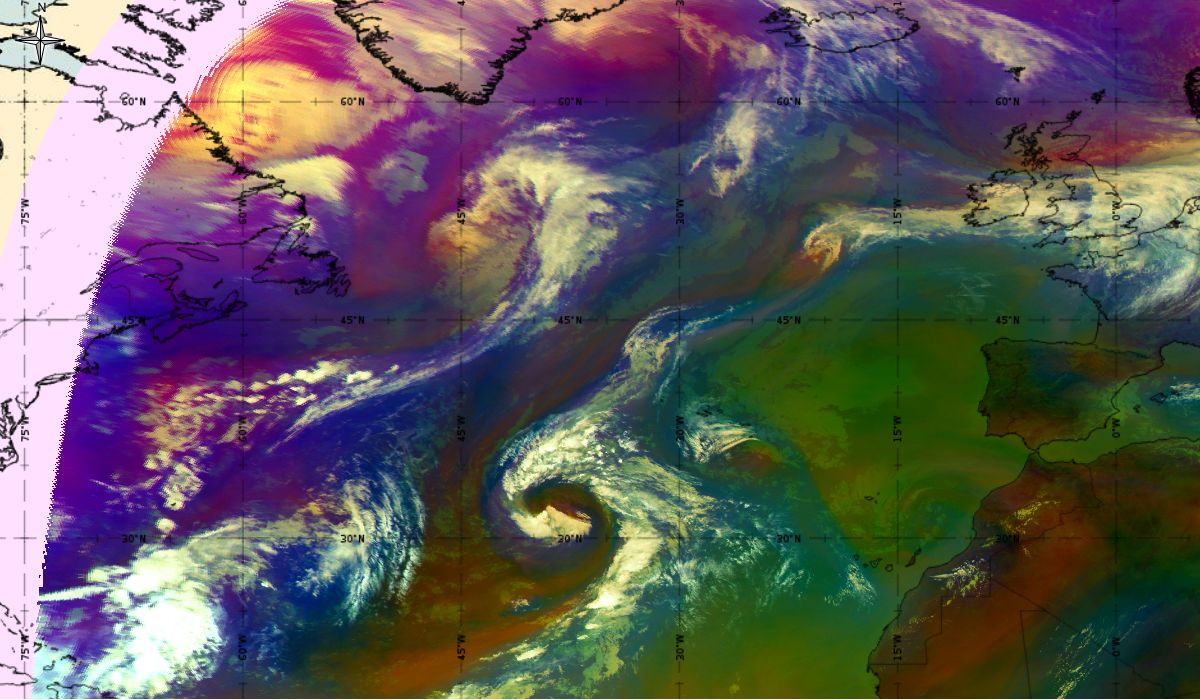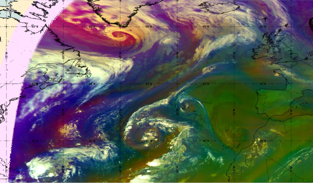 Looking at animations of RGB Airmass satellite images we notice that in the beginning, the frontal cloud band separates into two air masses - warmer over the west Atlantic and colder over the east. The jet axis is along the transition from blue to red colours at the rear side of the cloud band. Dry sinking air appears as red and indicates that cyclogenesis is ongoing. The dry air provides high potential vorticity and is the cause of further development and convection. South of the system, warm tropical air mass is greenish with lower clouds, appear less bright. Thick high-level clouds above the front are bright white.