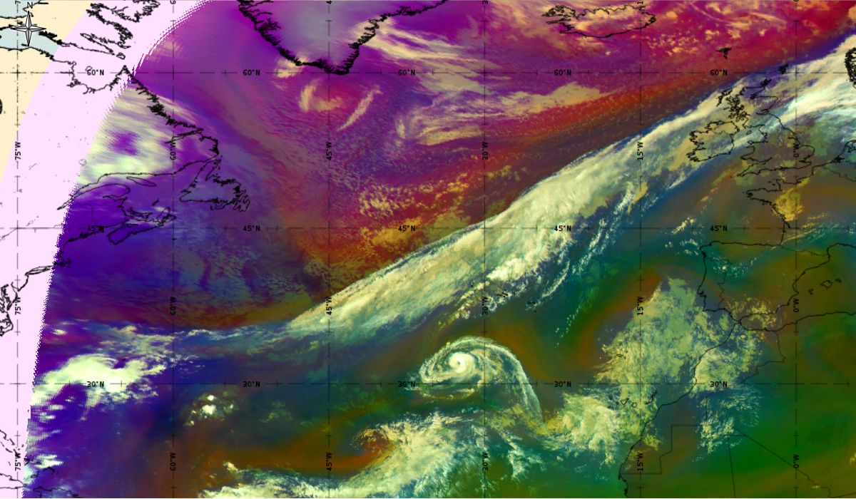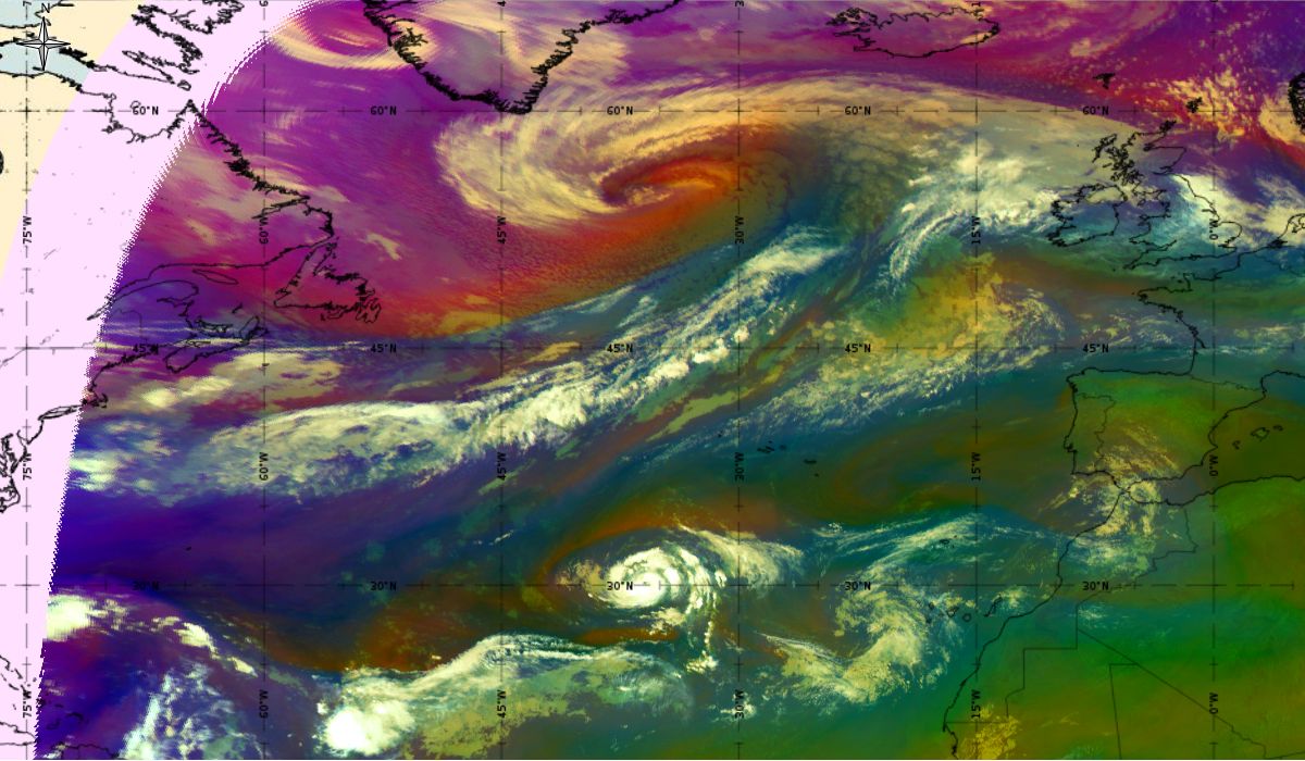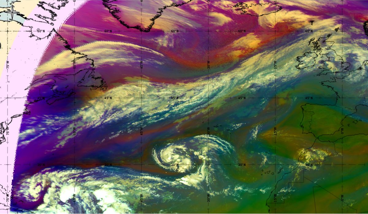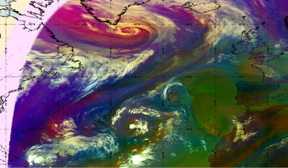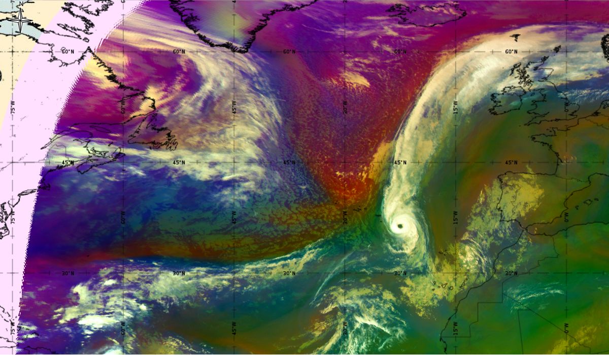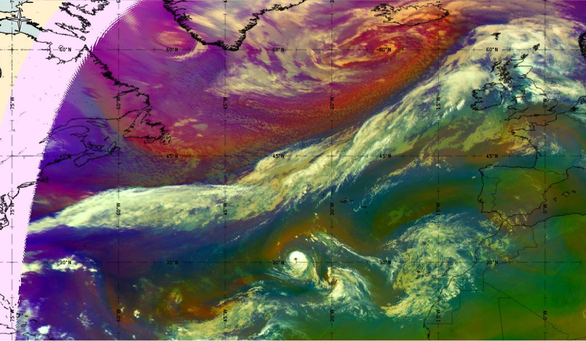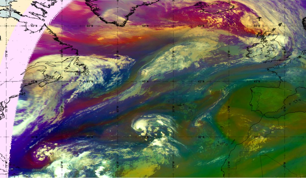 Looking at animations of RGB Airmass satellite images we notice that in the beginning, the frontal cloud band separates into two air masses - warmer over the west Atlantic and colder over the east. The jet axis is along the transition from blue to red colours at the rear side of the cloud band. Dry sinking air appears as red and indicates that cyclogenesis is ongoing. The dry air provides high potential vorticity and is the cause of further development and convection. South of the system, warm tropical air mass is greenish with lower clouds, appear less bright. Thick high-level clouds above the front are bright white.
