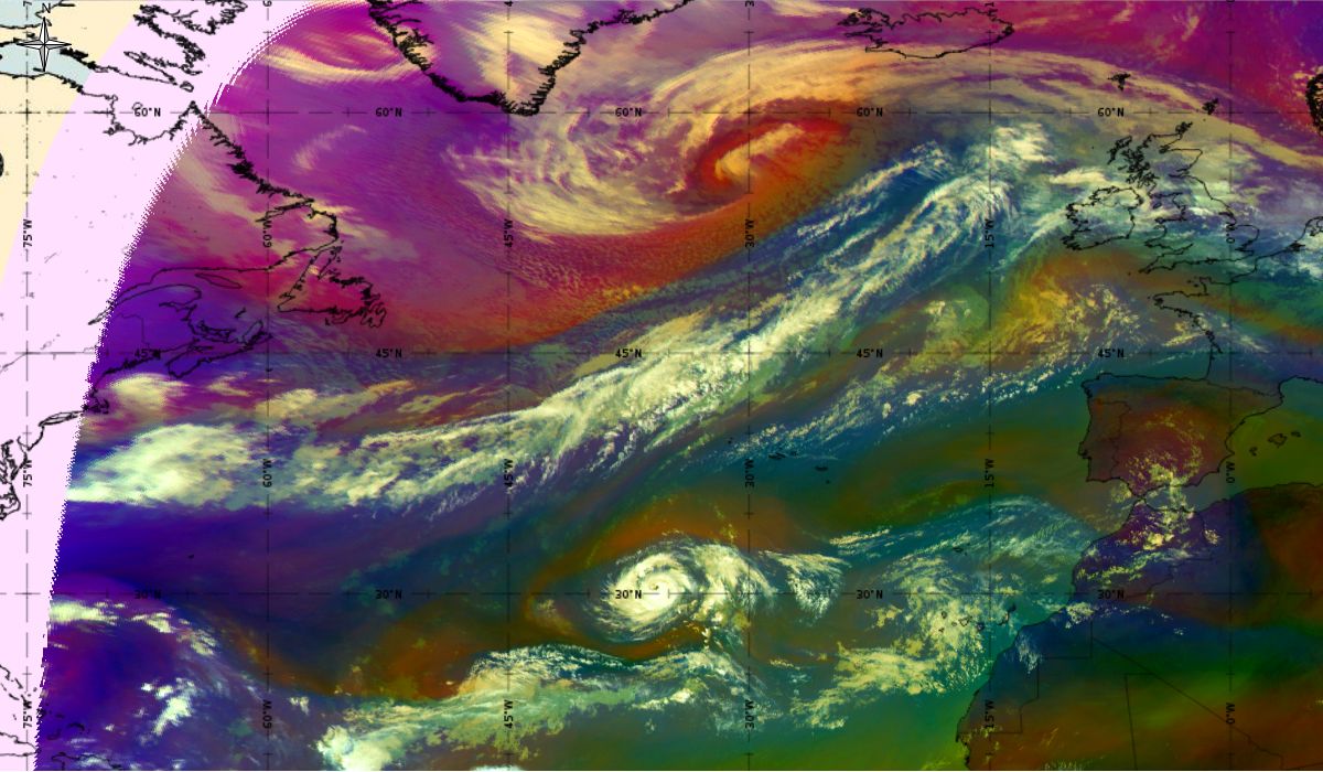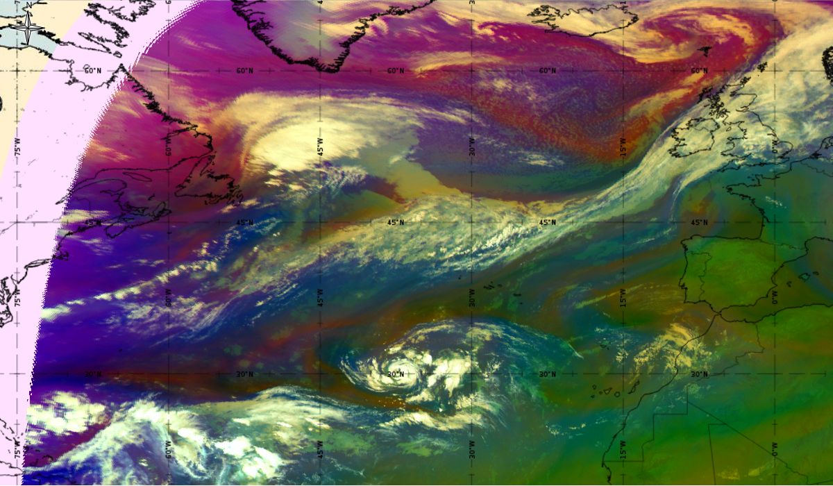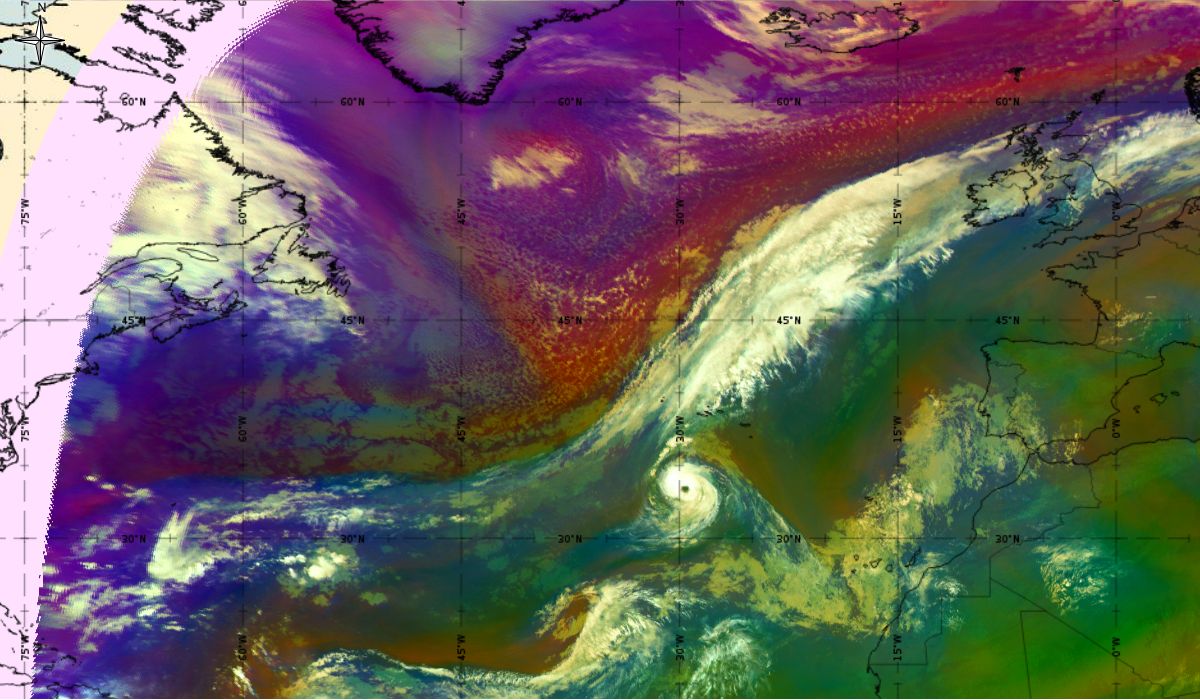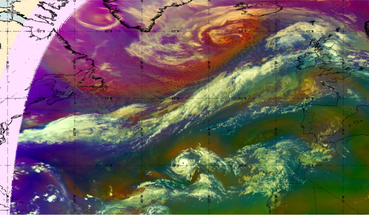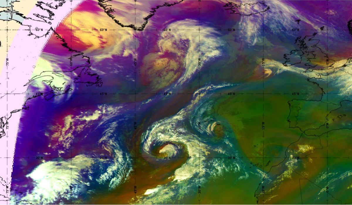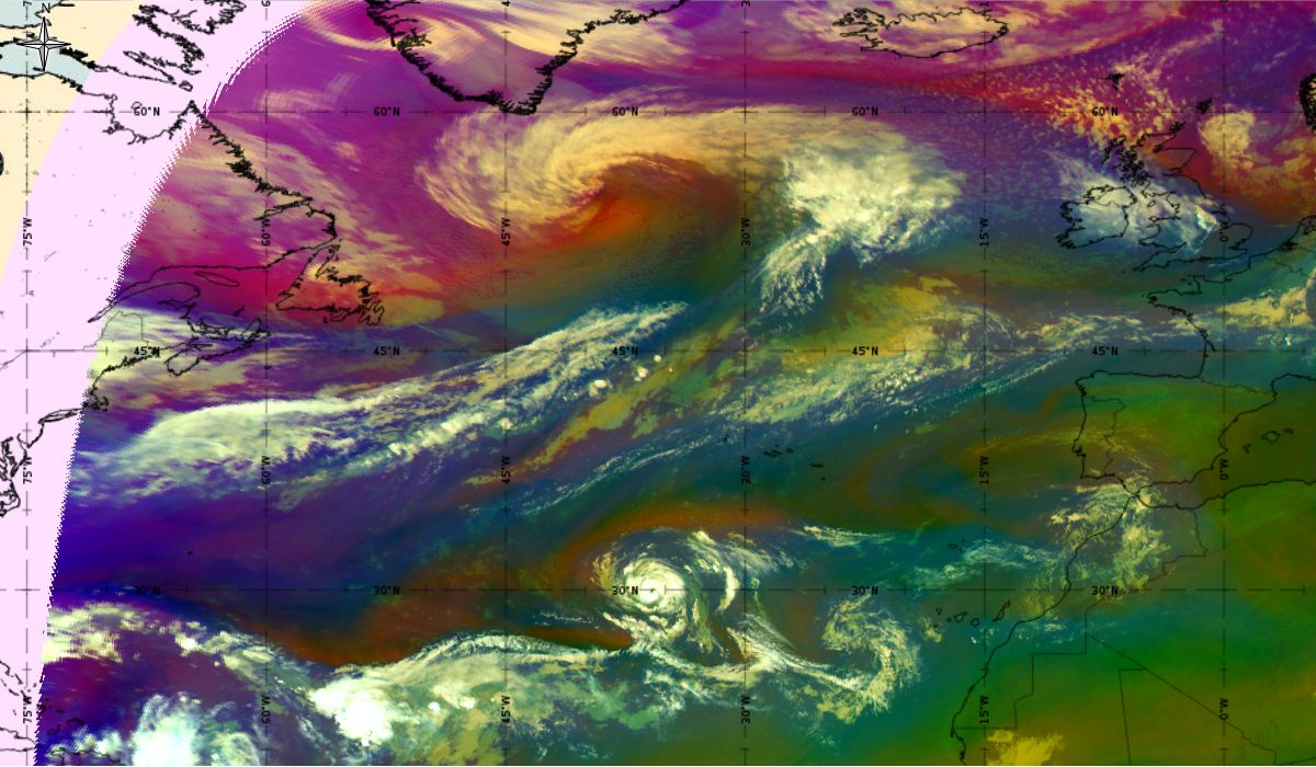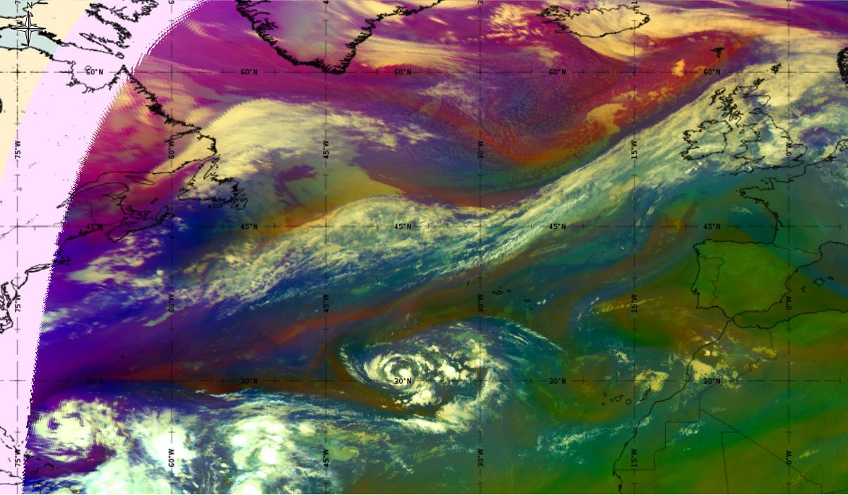 Looking at animations of RGB Airmass satellite images we notice that in the beginning, the frontal cloud band separates into two air masses - warmer over the west Atlantic and colder over the east. The jet axis is along the transition from blue to red colours at the rear side of the cloud band. Dry sinking air appears as red and indicates that cyclogenesis is ongoing. The dry air provides high potential vorticity and is the cause of further development and convection. South of the system, warm tropical air mass is greenish with lower clouds, appear less bright. Thick high-level clouds above the front are bright white.