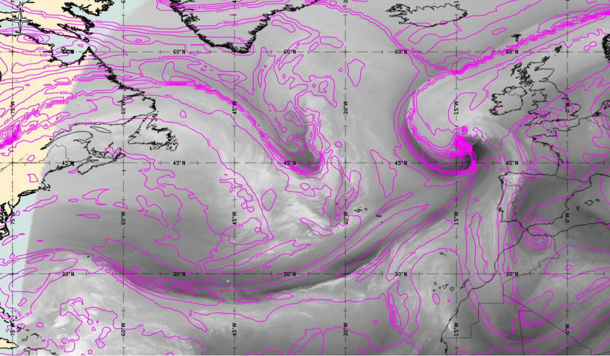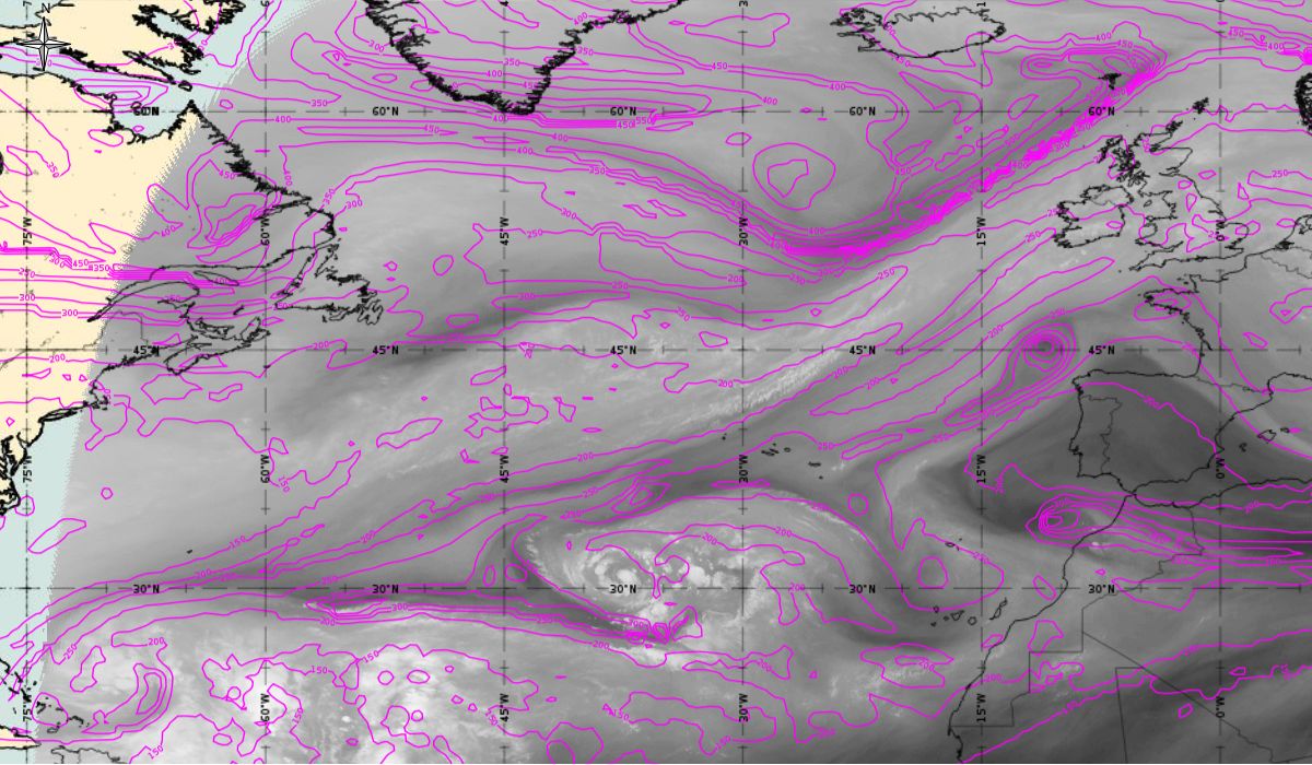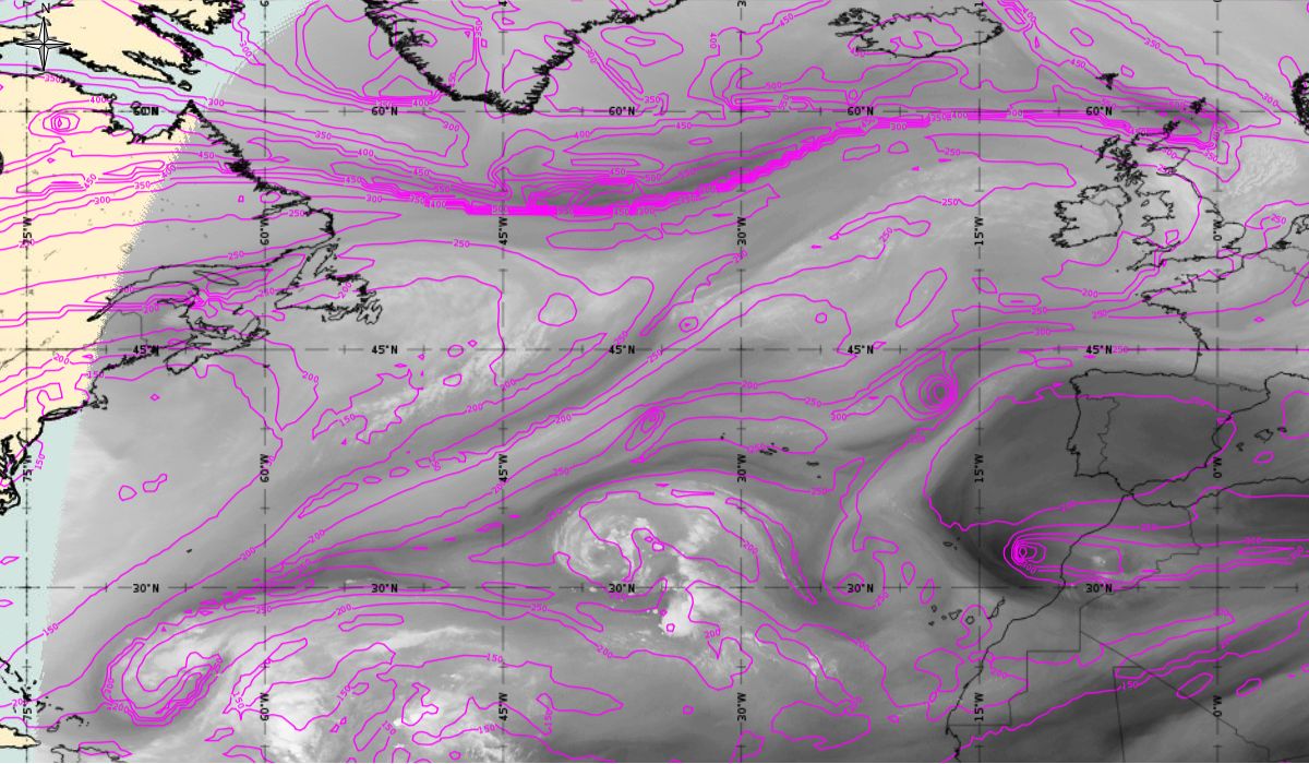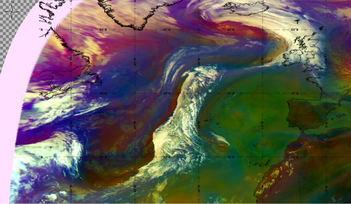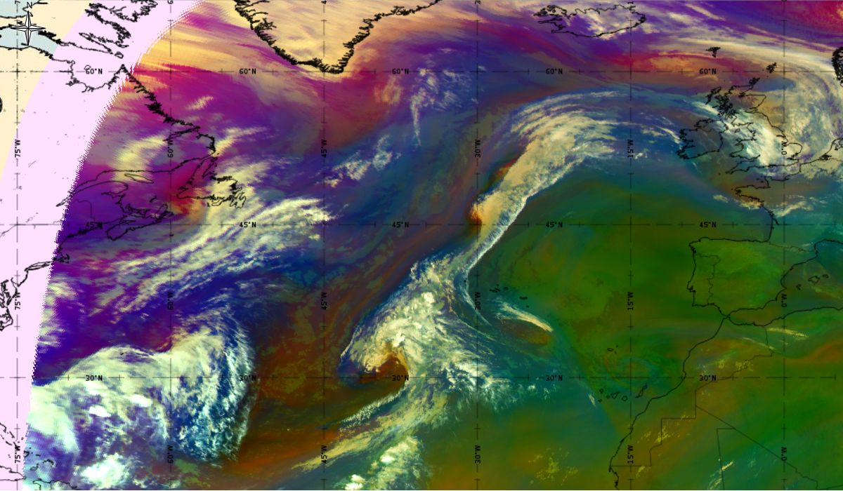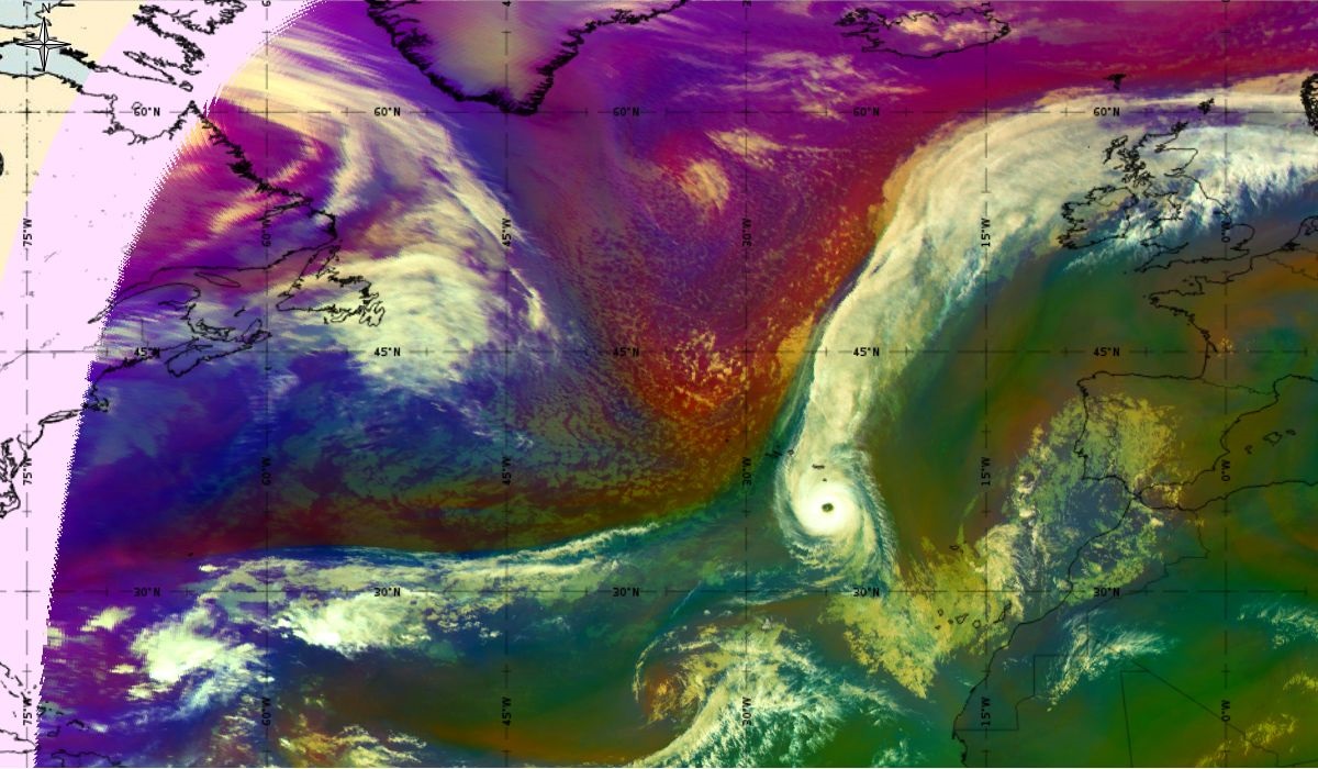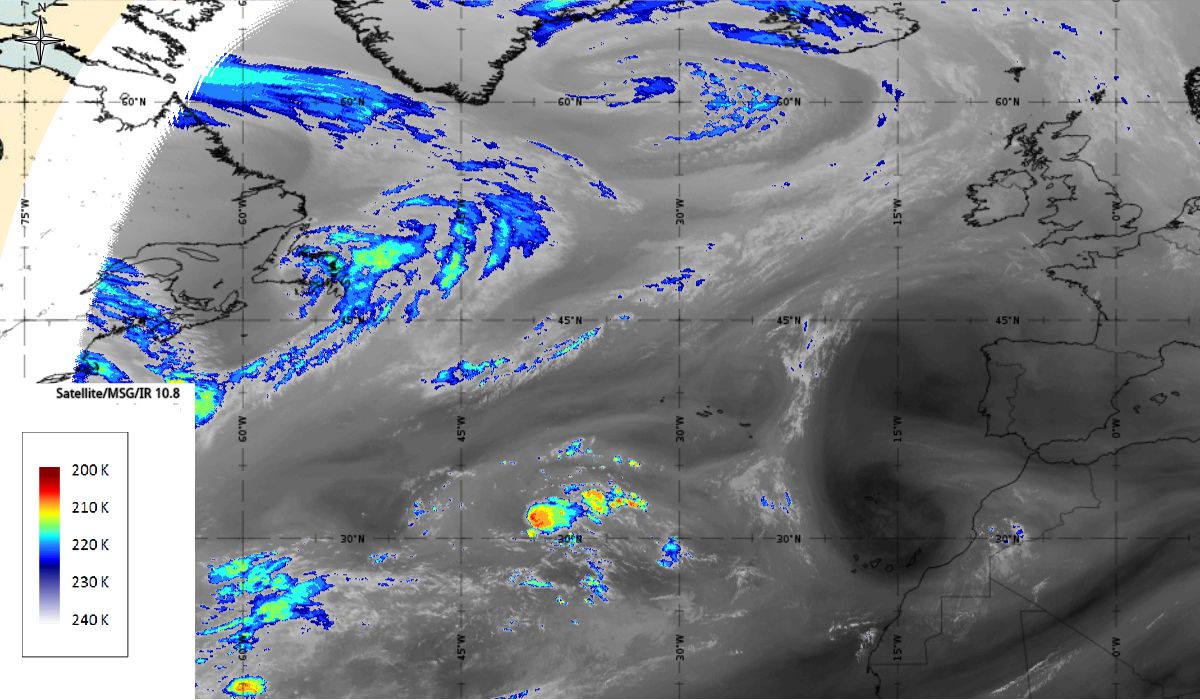 Looking at animations of RGB Airmass satellite images we notice that in the beginning, the frontal cloud band separates into two air masses - warmer over the west Atlantic and colder over the east. The jet axis is along the transition from blue to red colours at the rear side of the cloud band. Dry sinking air appears as red and indicates that cyclogenesis is ongoing. The dry air provides high potential vorticity and is the cause of further development and convection. South of the system, warm tropical air mass is greenish with lower clouds, appear less bright. Thick high-level clouds above the front are bright white.