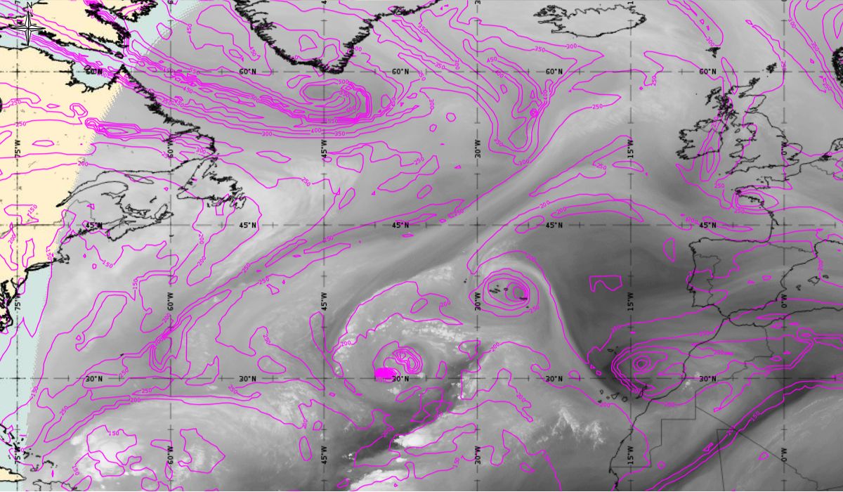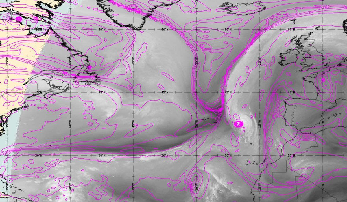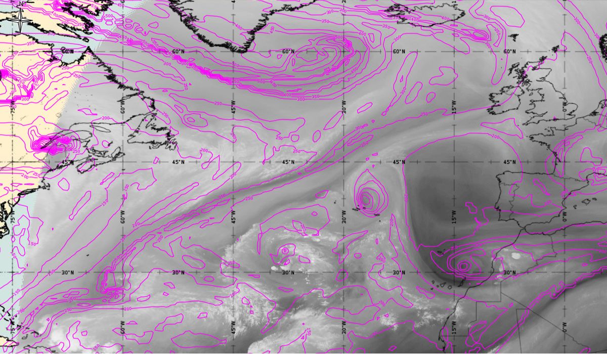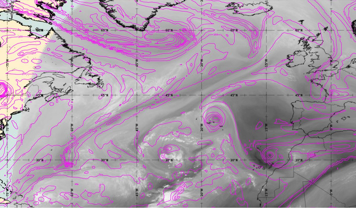 As we can see in this section, the jet stream plays a role in the second part of the lifetime of Ophelia (Figure 20). After Ophelia reached its maximum strength (14 October 12 UTC), the interaction with the strong upper level trough (visible in isolines of geopotential height at 500 hPa) and jet stream flow caused a gradual weakening of the hurricane. The jet stream is clearly visible in the satellite images, in transition from blue to red colours, like a pinstripe at the rear side of the cloud band. The jet (yellow lines - wind speed up to 70 m/s) is coming from behind/above cold front.