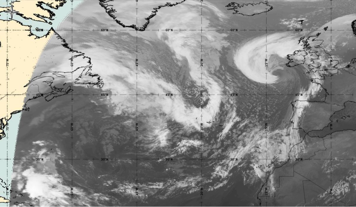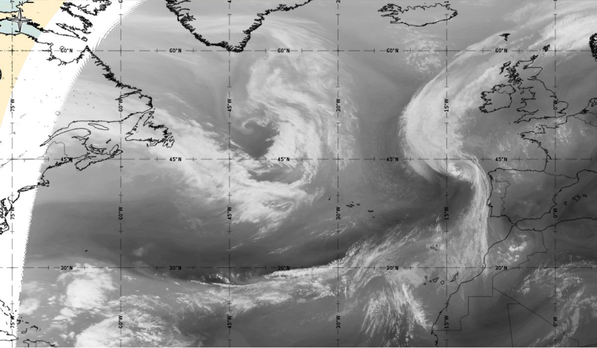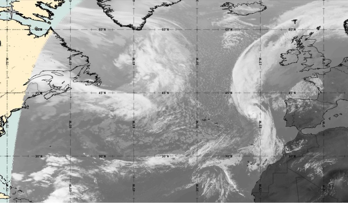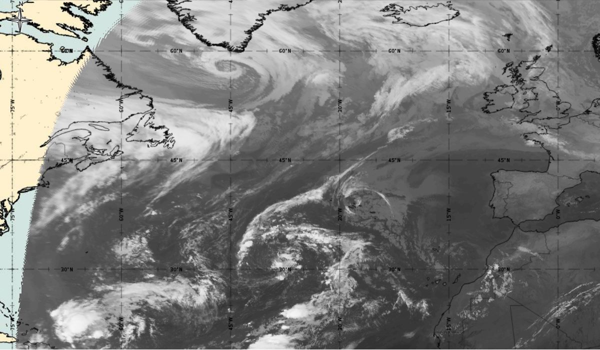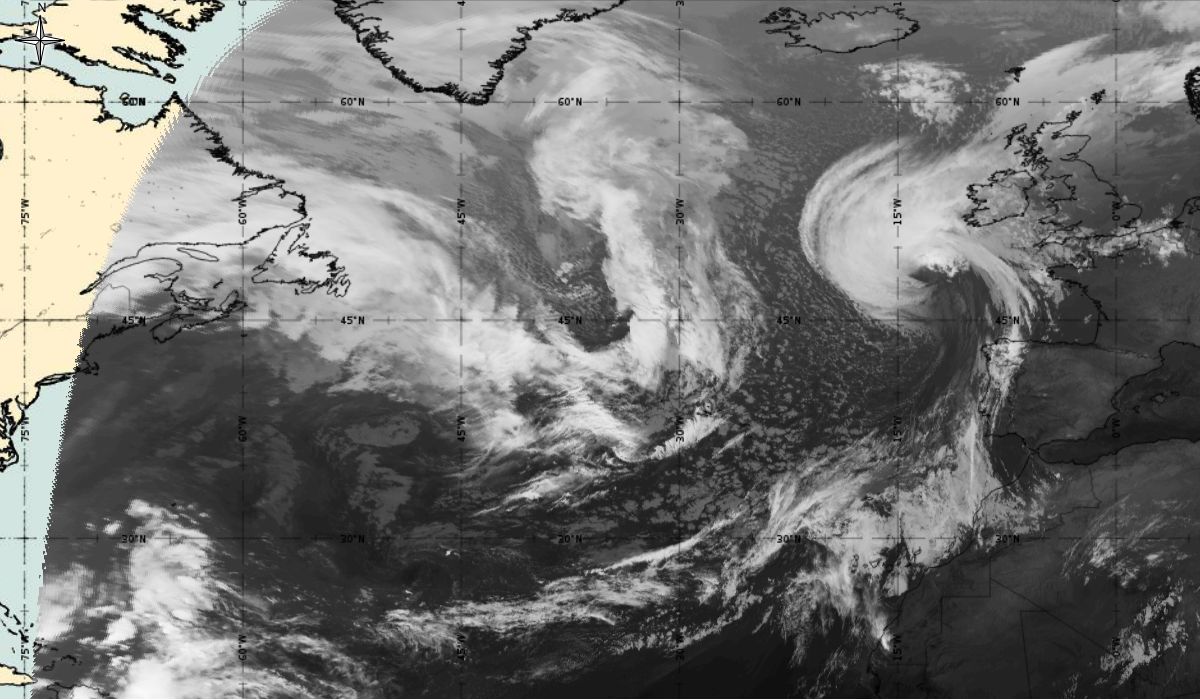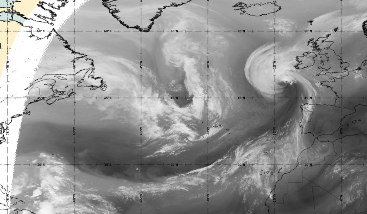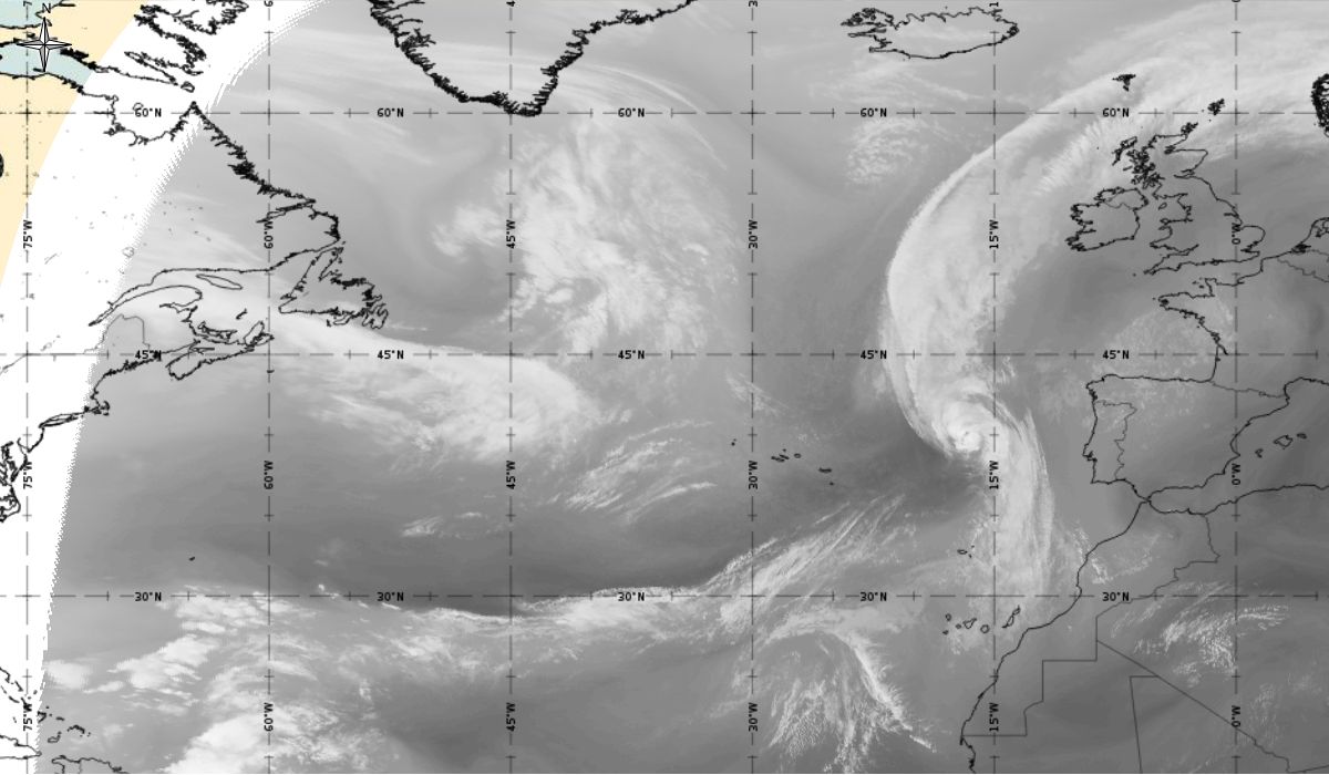 Cyclonic curvature of the cloud structure over the Atlantic can be followed by the animation of satellite images.
