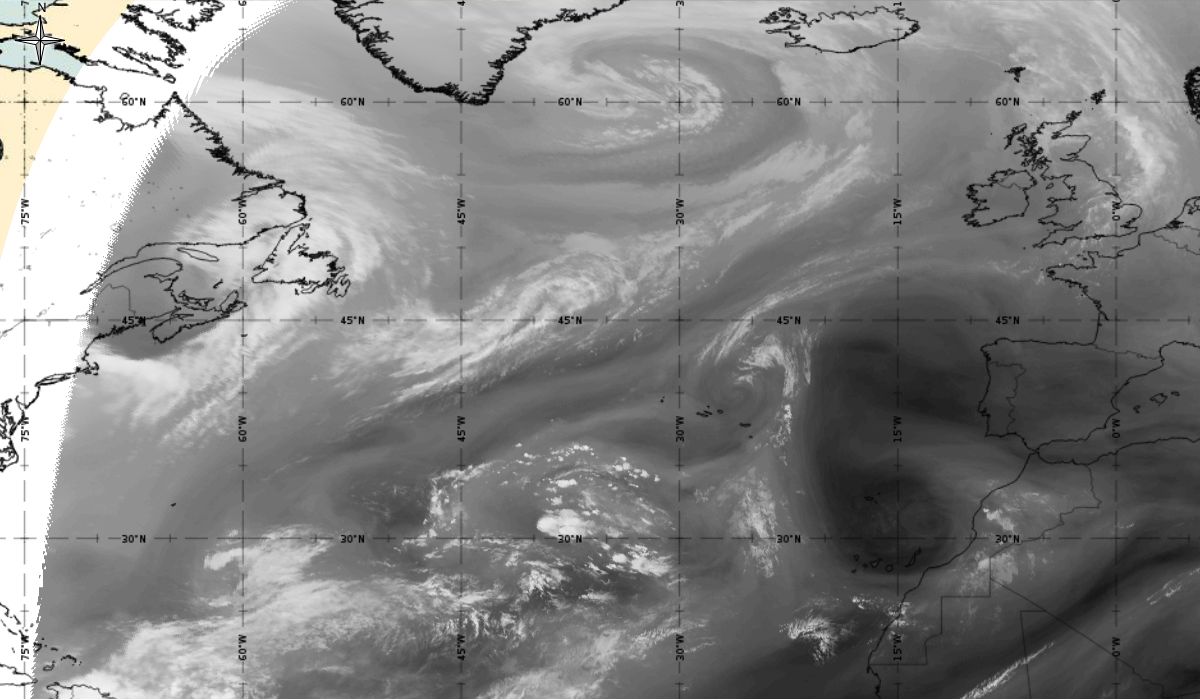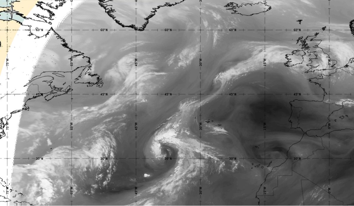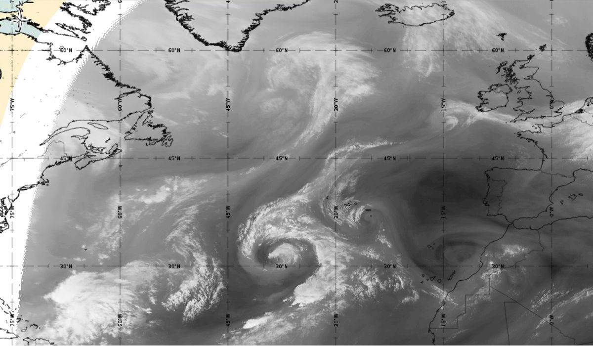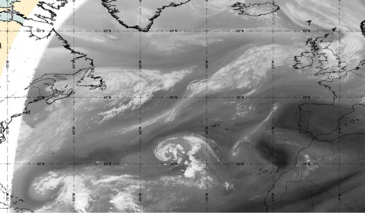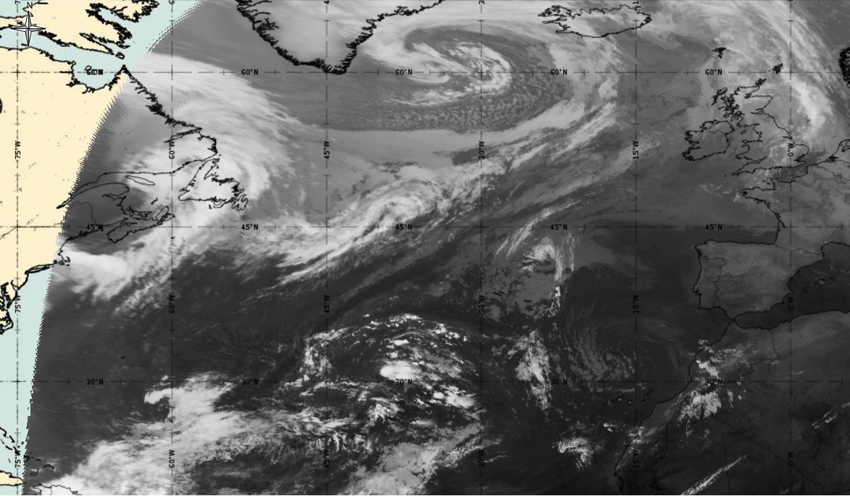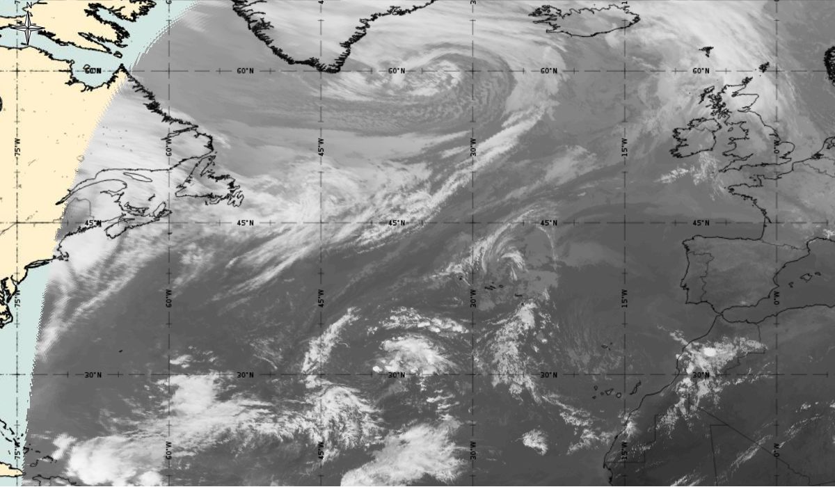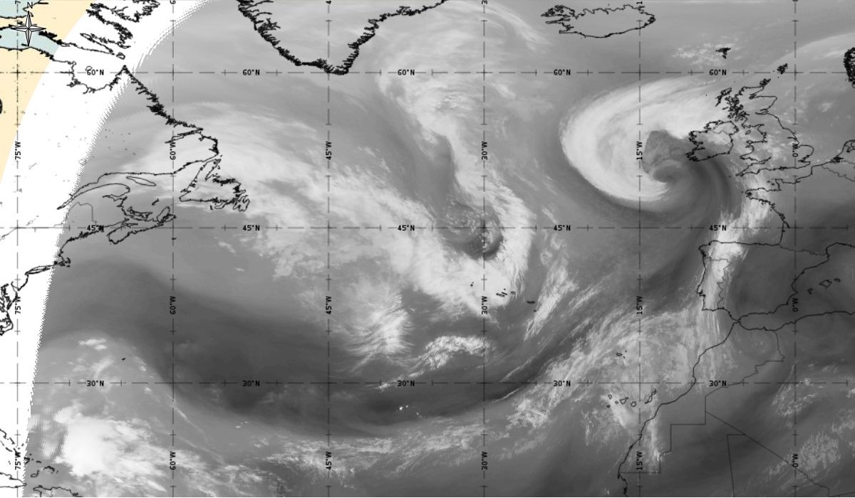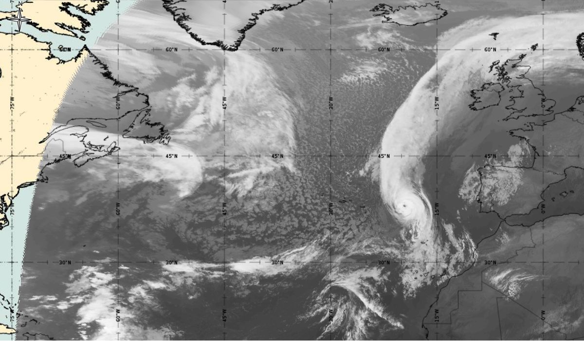 Cyclonic curvature of the cloud structure over the Atlantic can be followed by the animation of satellite images.