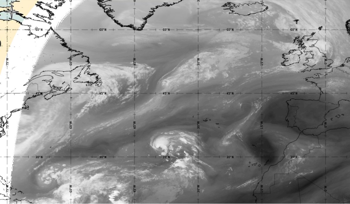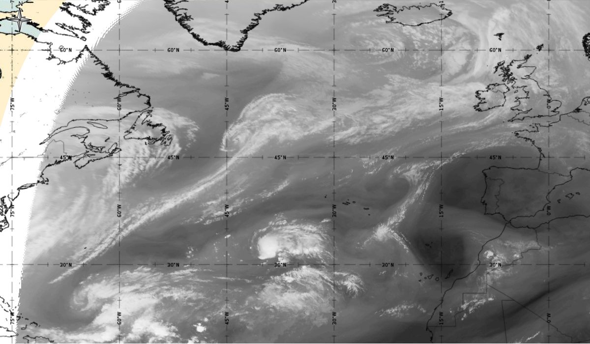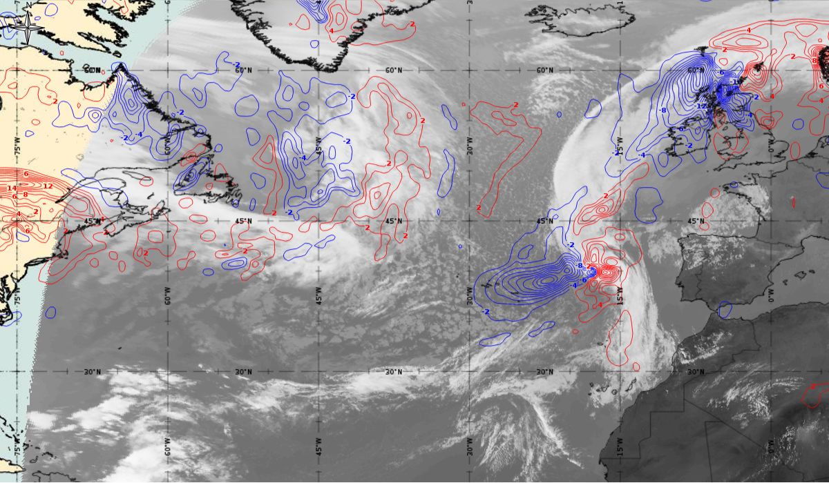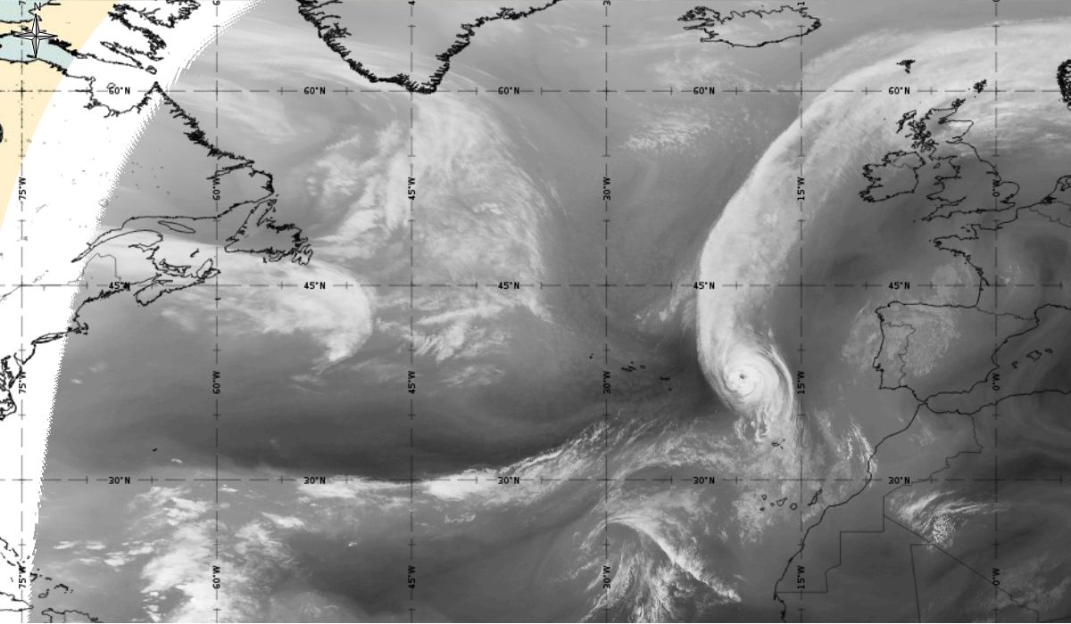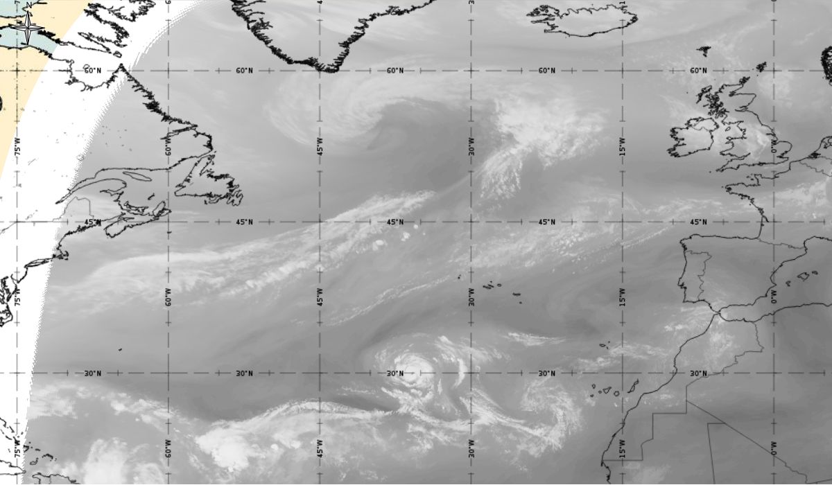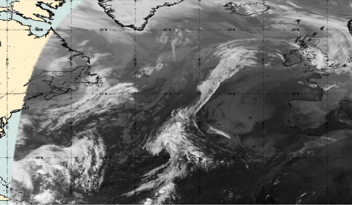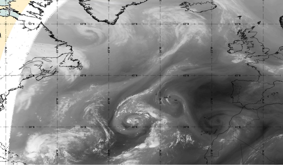 Cyclonic curvature of the cloud structure over the Atlantic can be followed by the animation of satellite images.