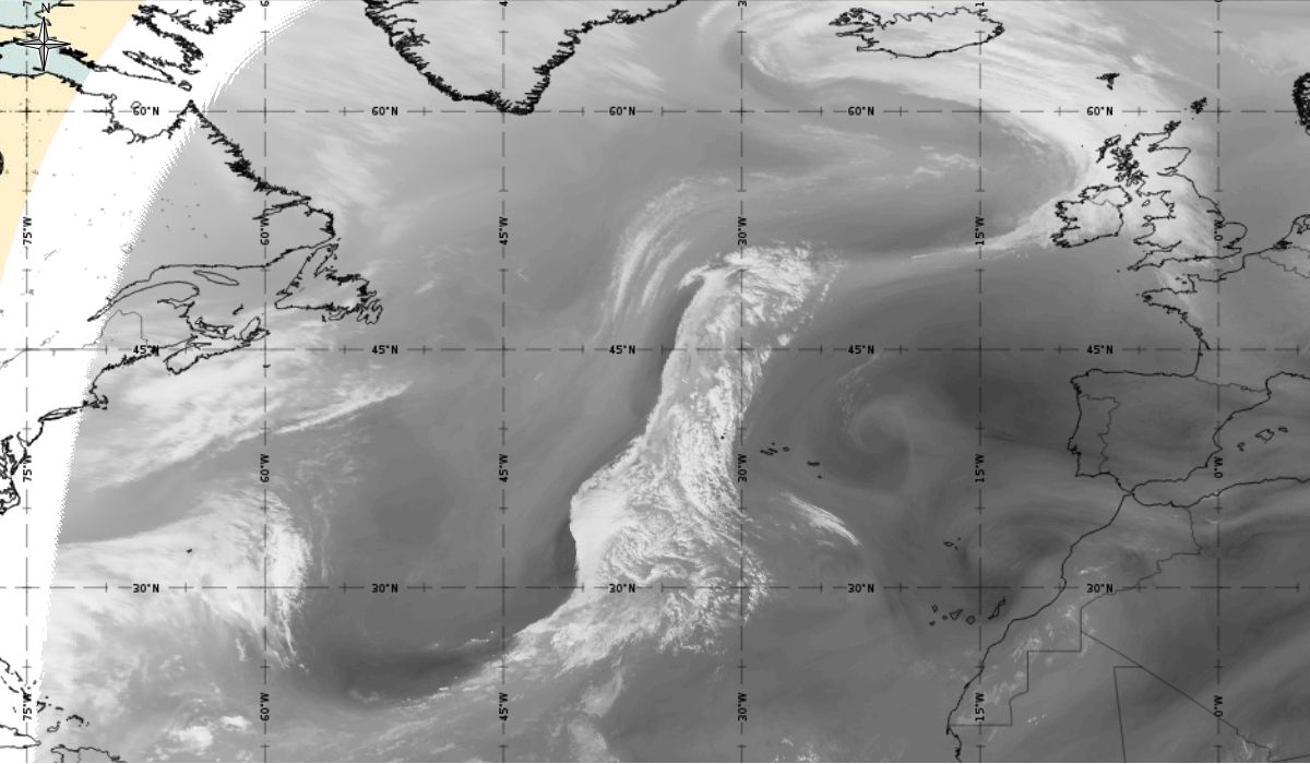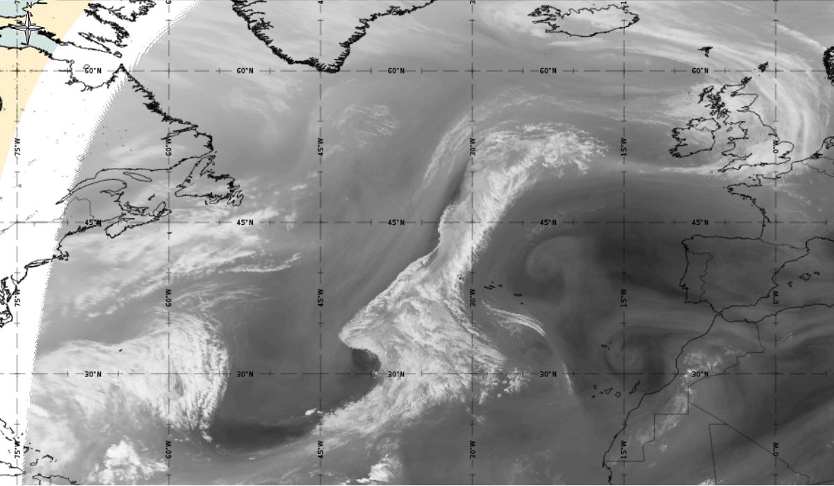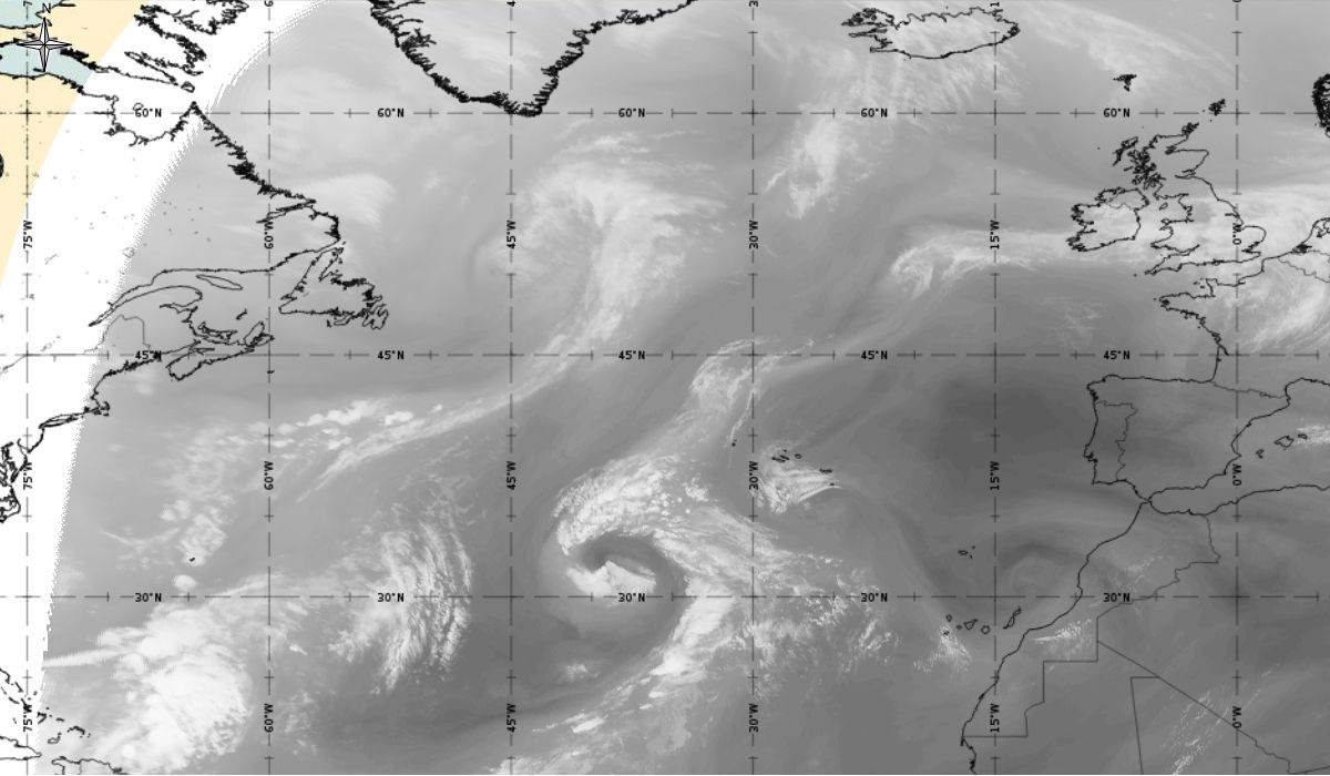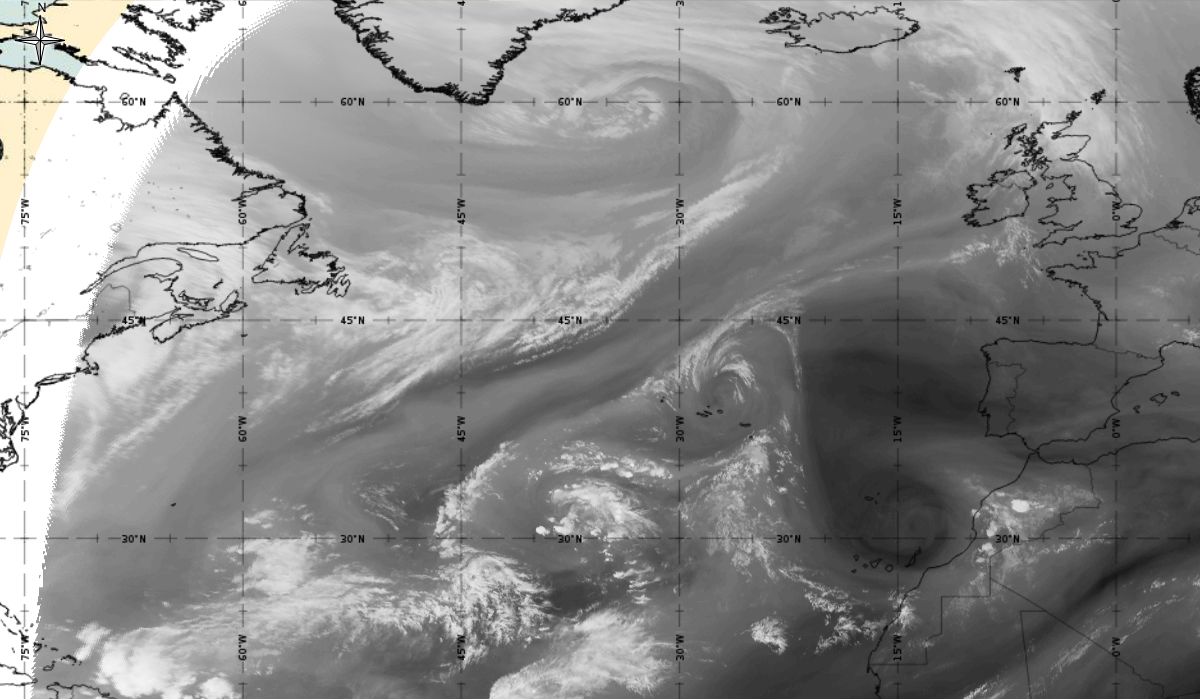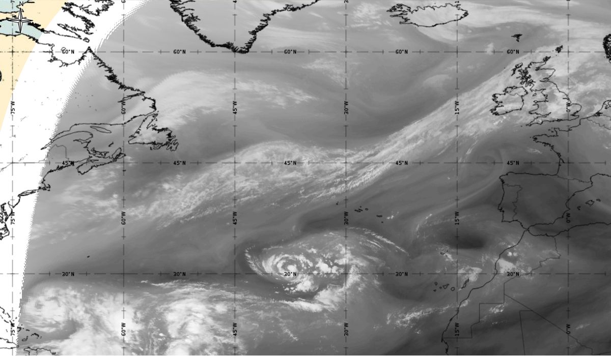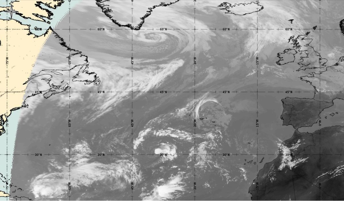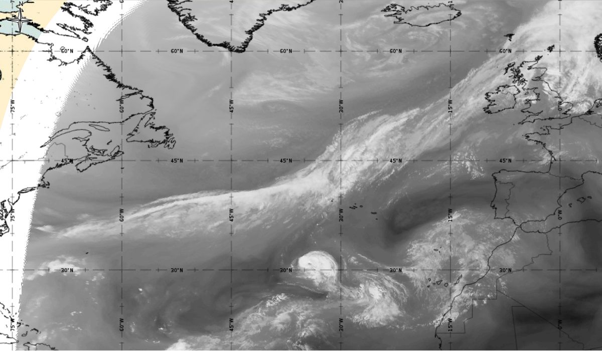 Cyclonic curvature of the cloud structure over the Atlantic can be followed by the animation of satellite images.