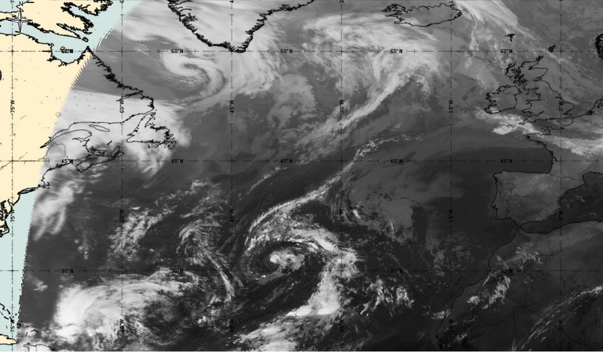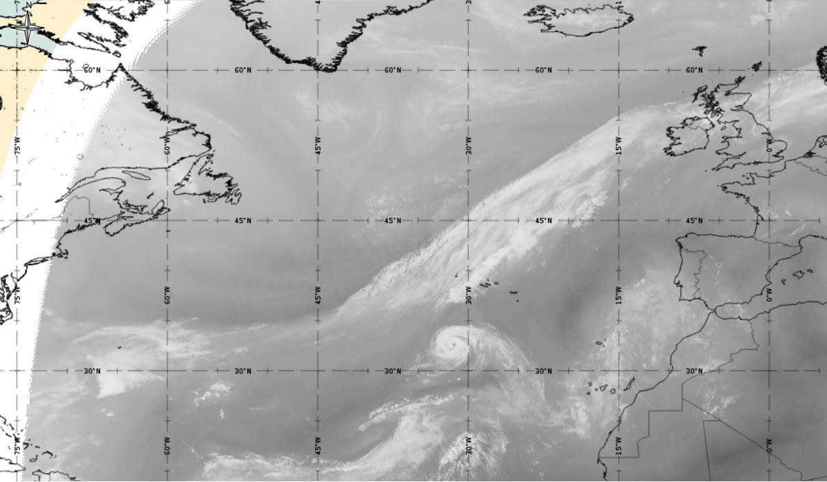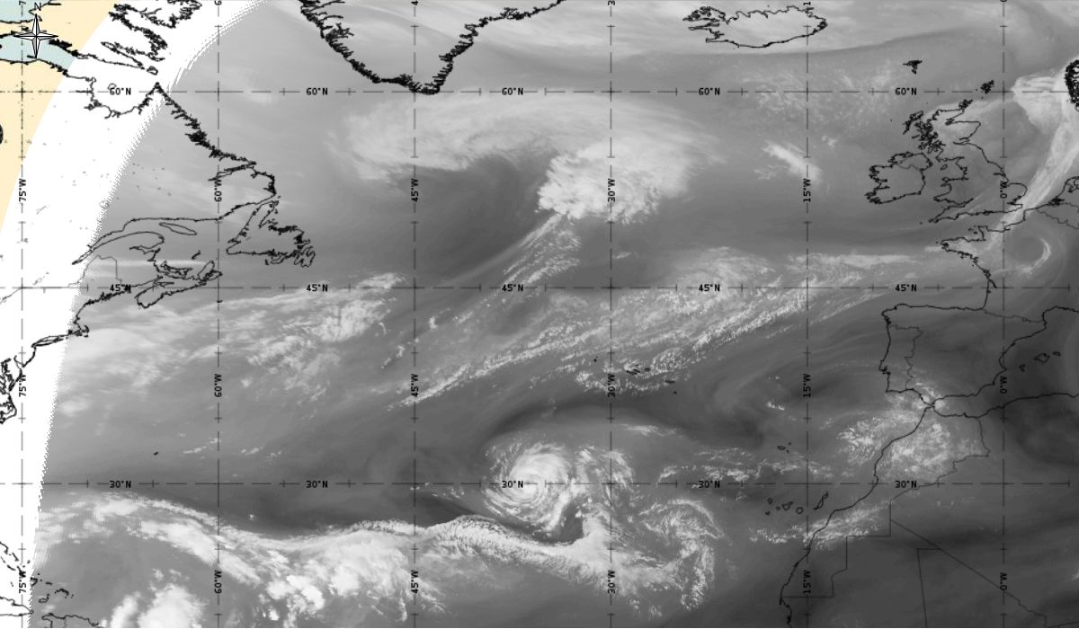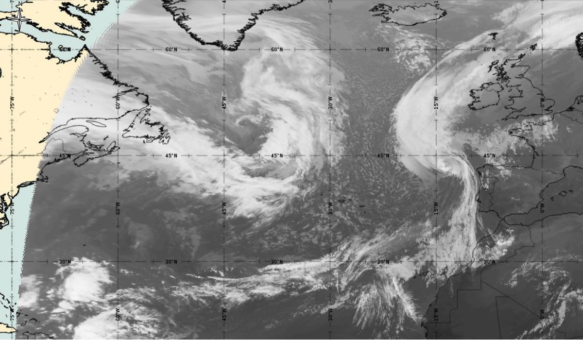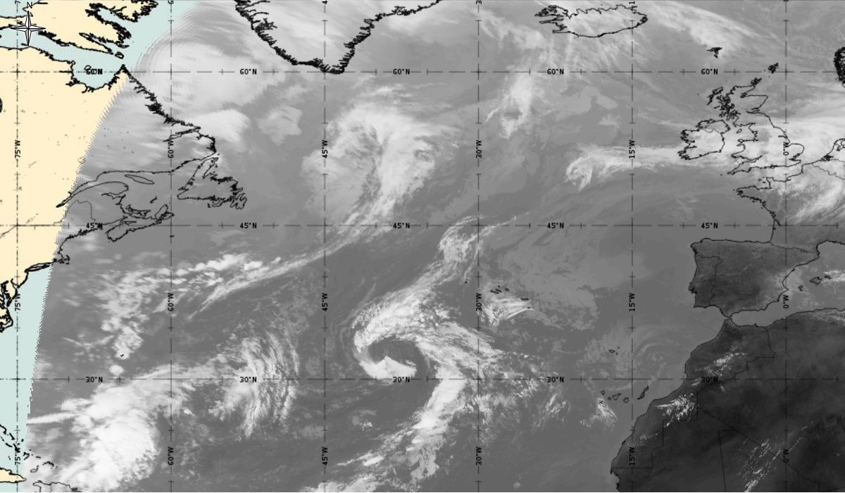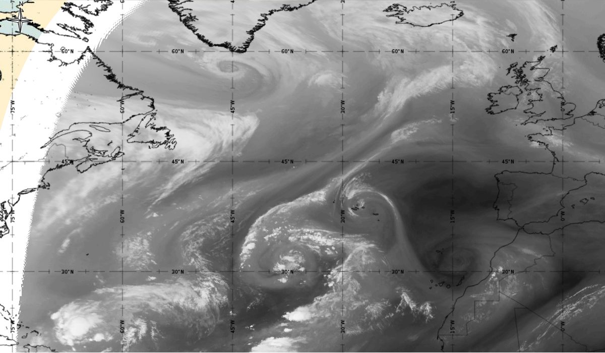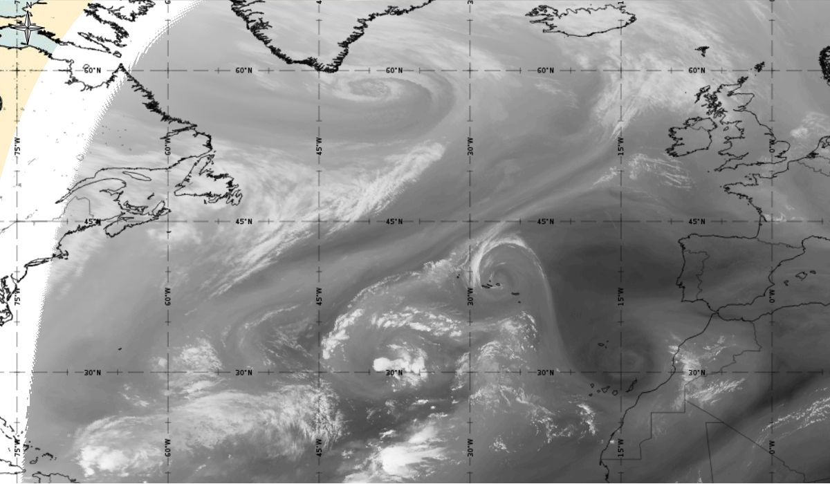 Cyclonic curvature of the cloud structure over the Atlantic can be followed by the animation of satellite images.