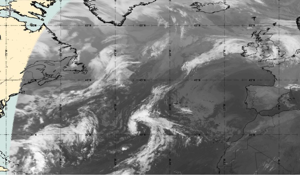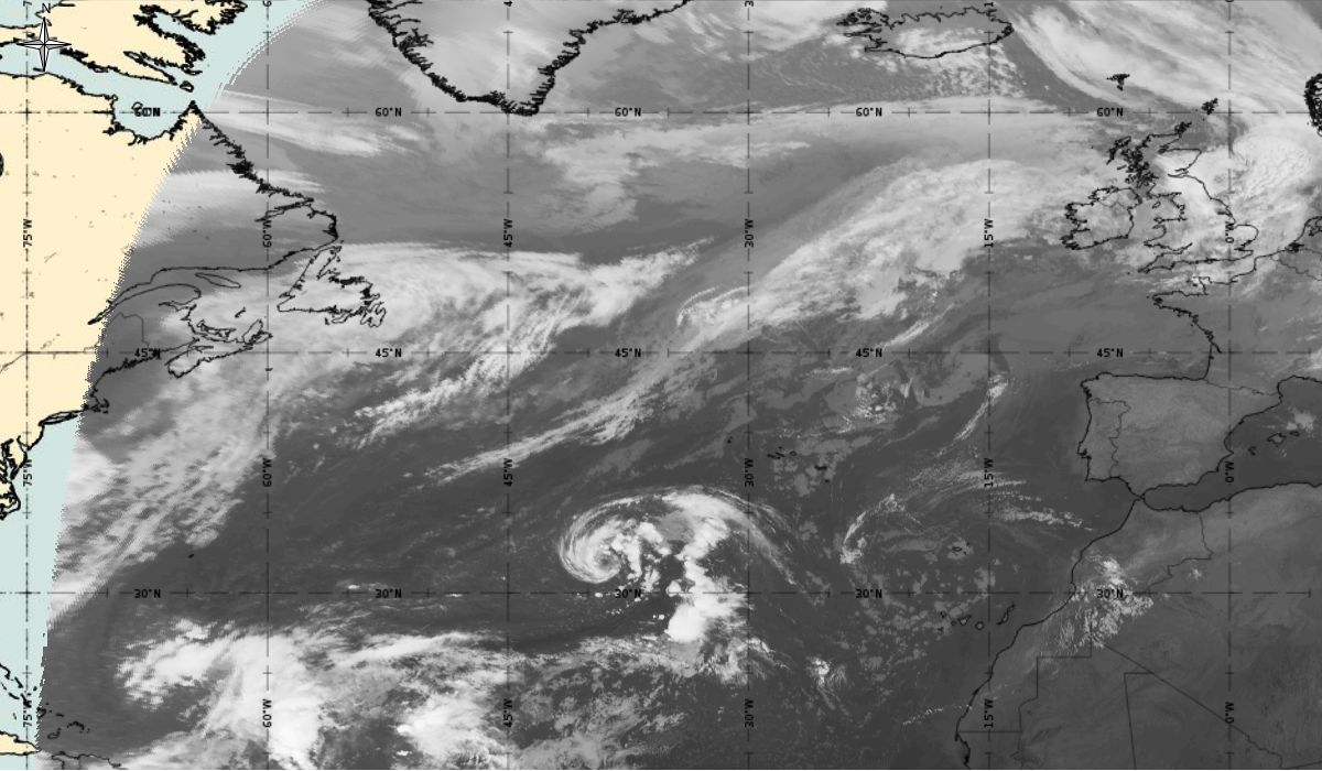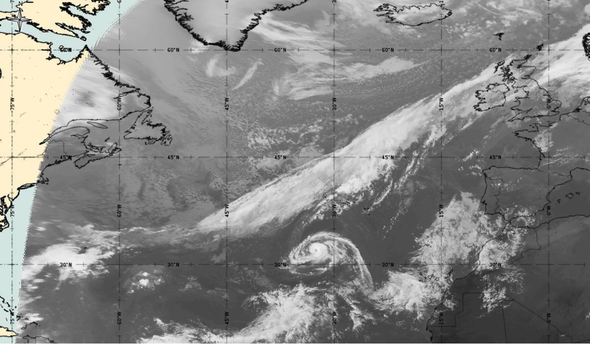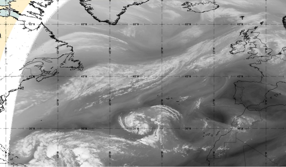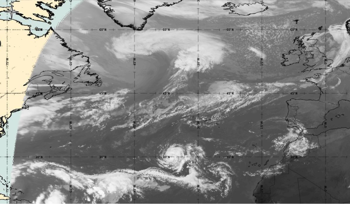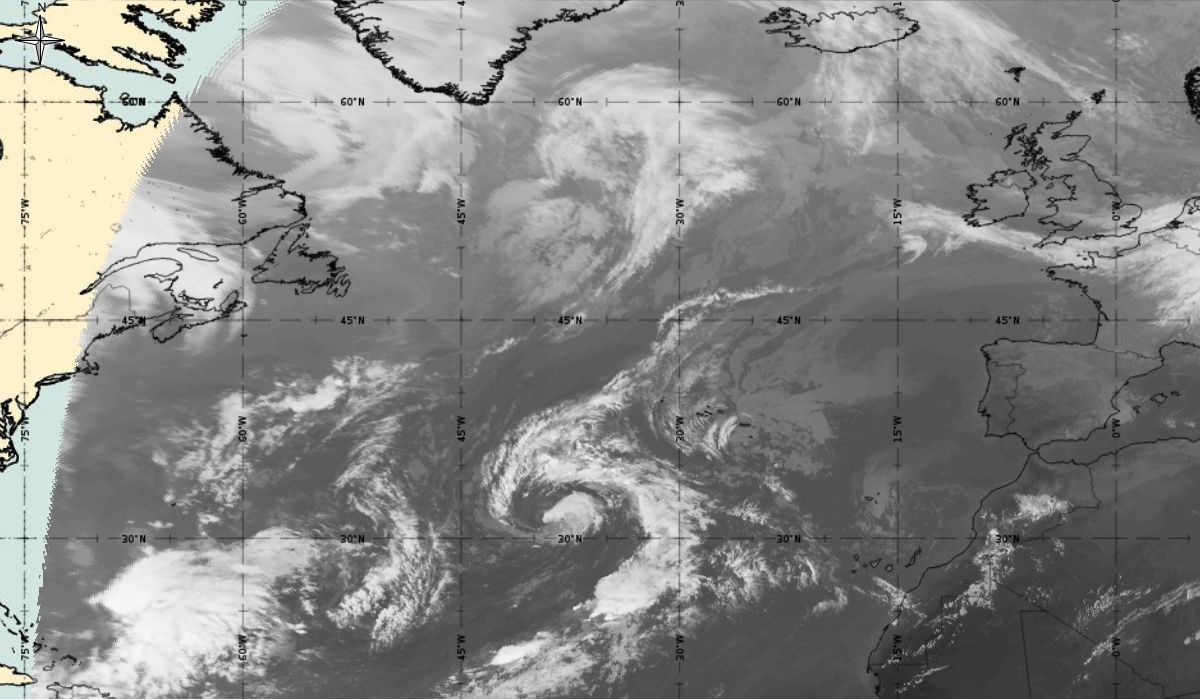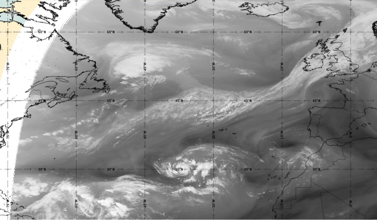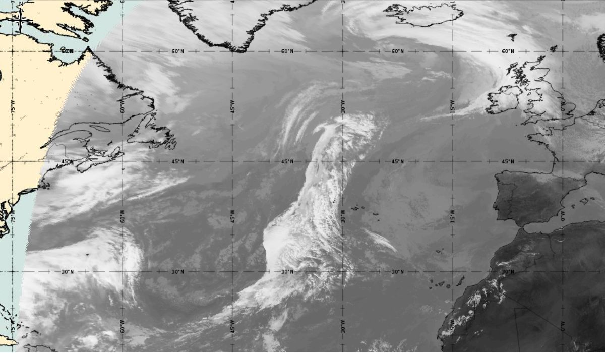 Cyclonic curvature of the cloud structure over the Atlantic can be followed by the animation of satellite images.