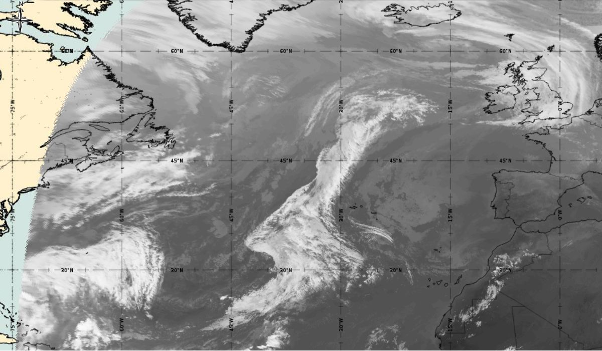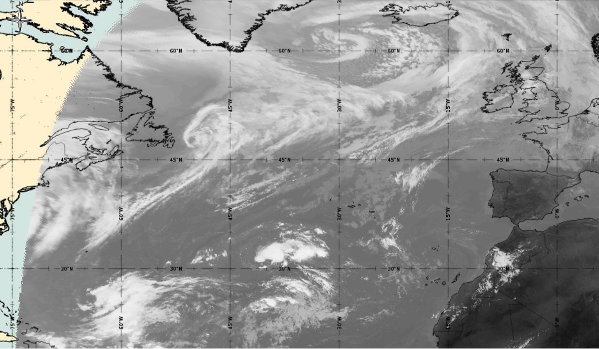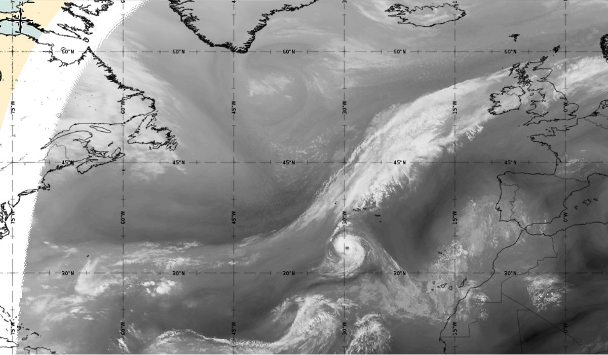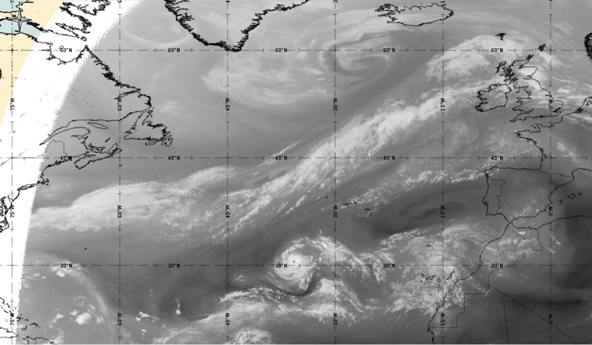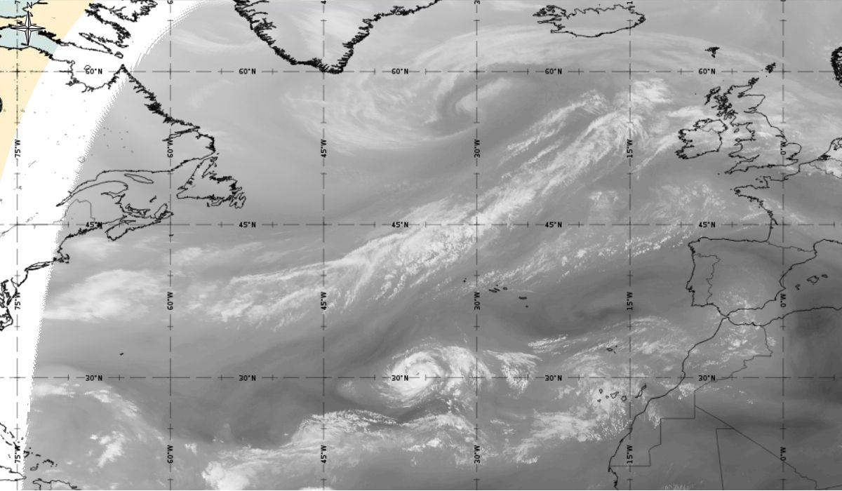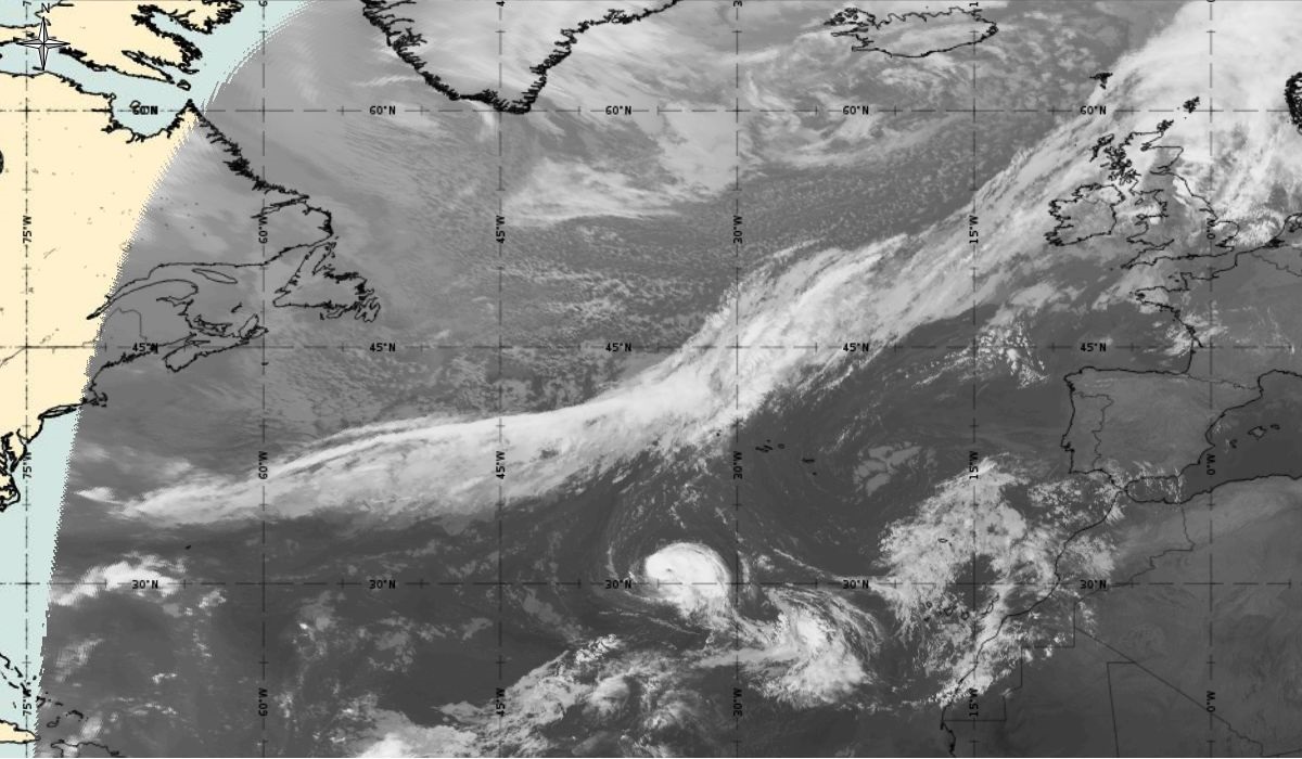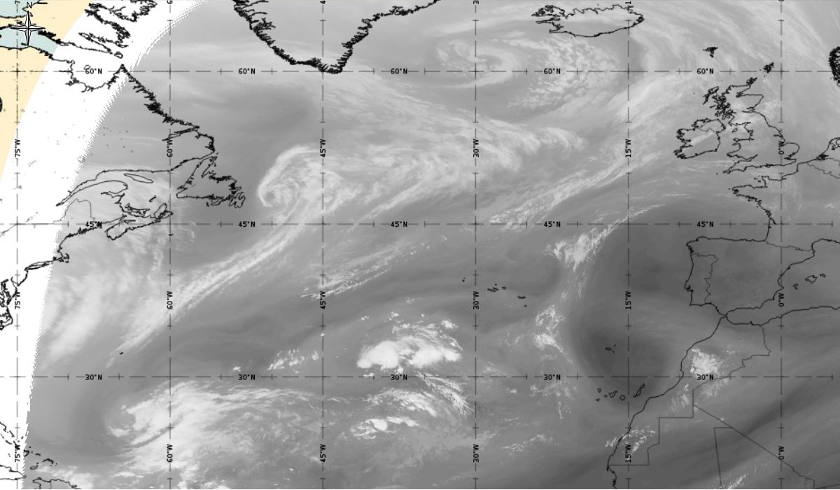 Cyclonic curvature of the cloud structure over the Atlantic can be followed by the animation of satellite images.