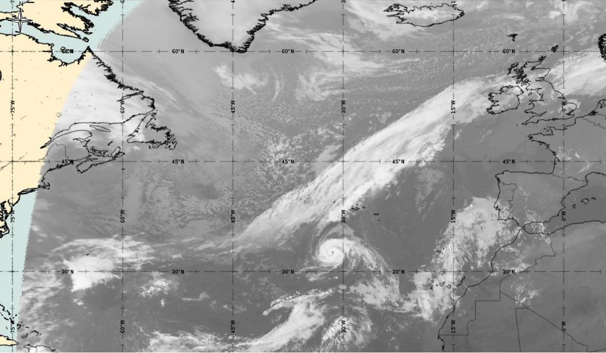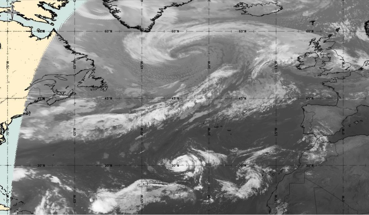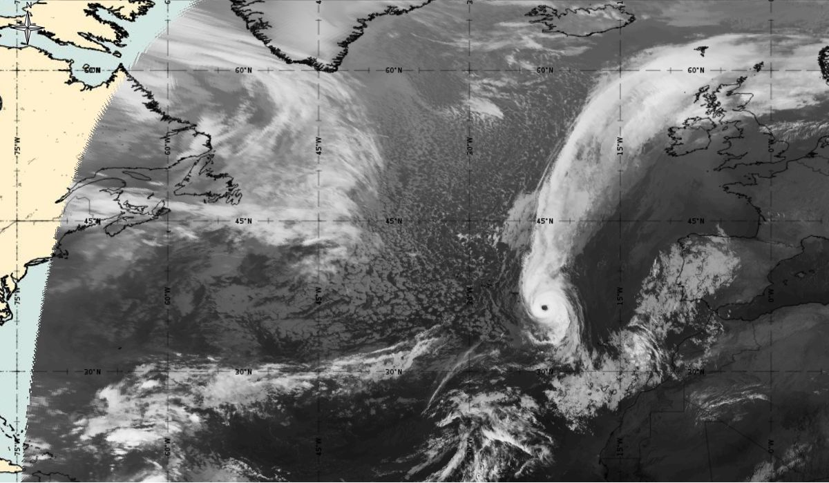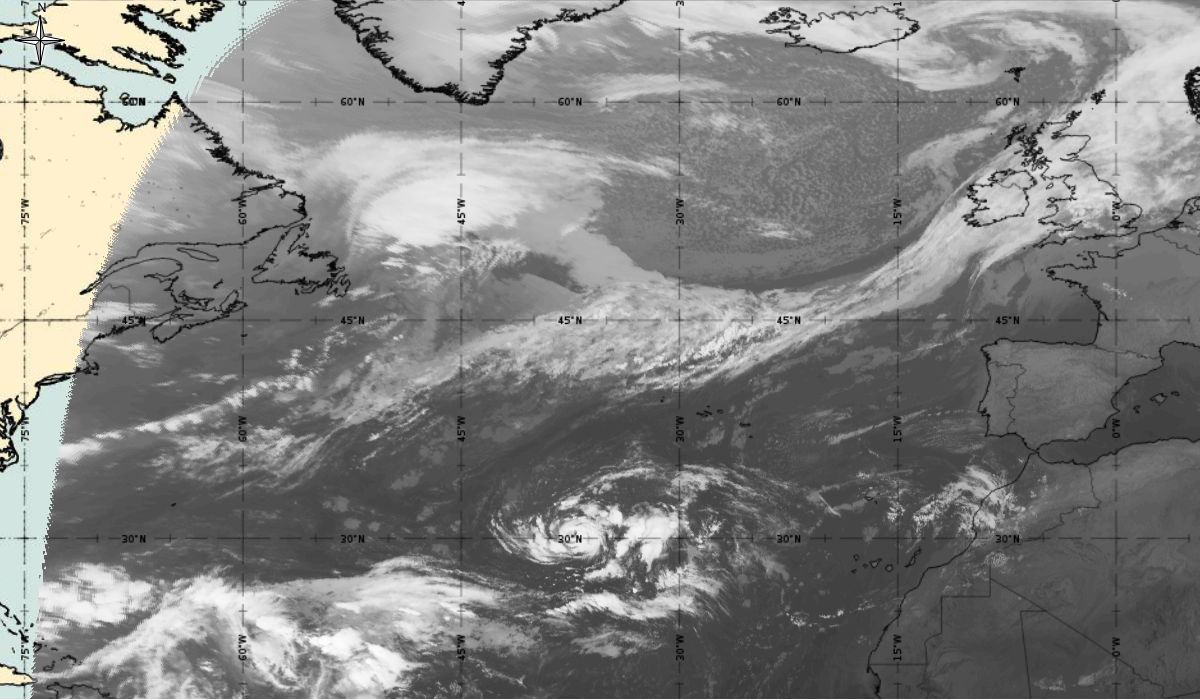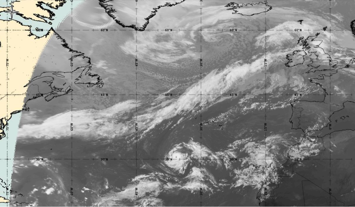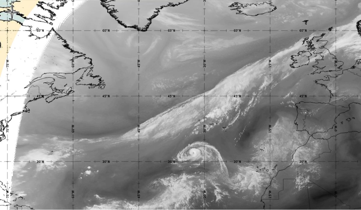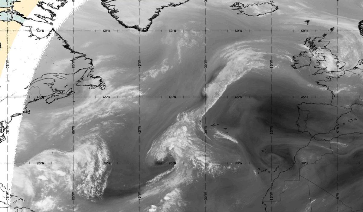 Cyclonic curvature of the cloud structure over the Atlantic can be followed by the animation of satellite images.