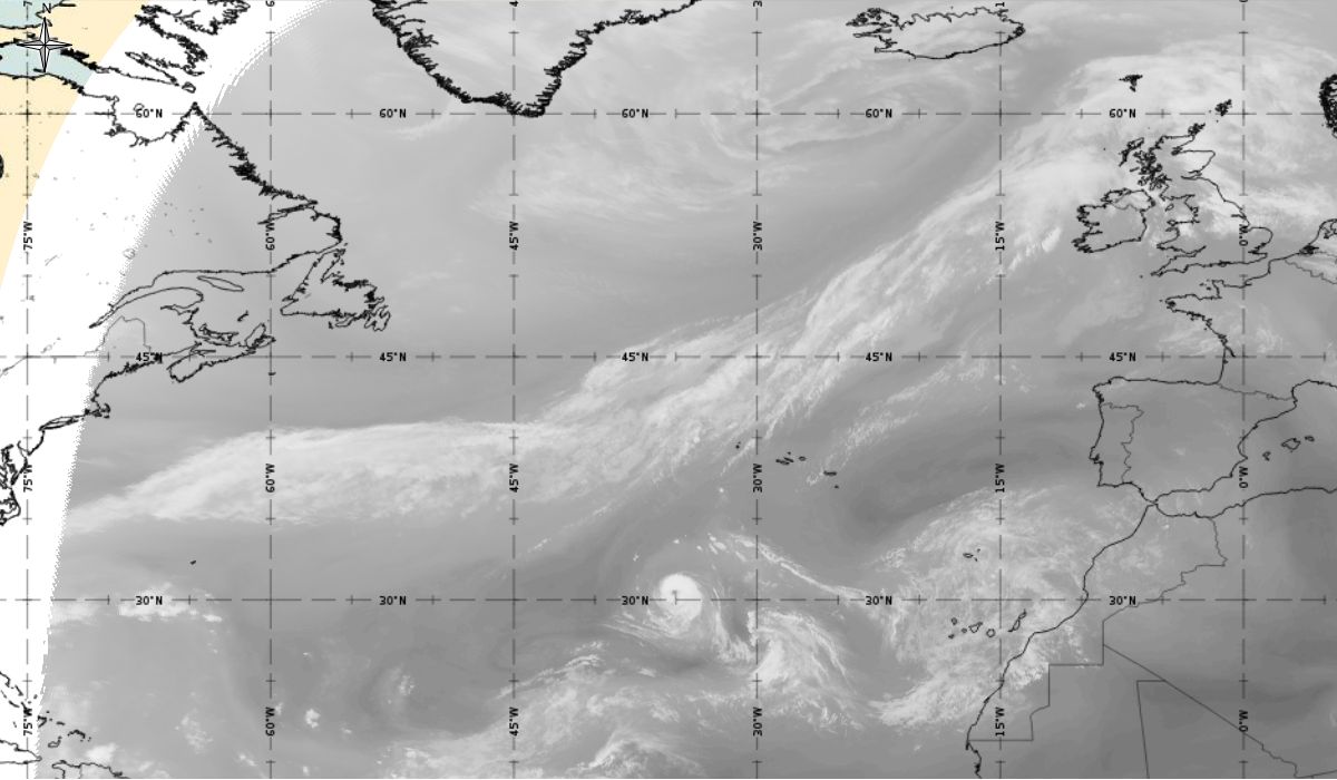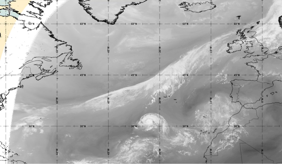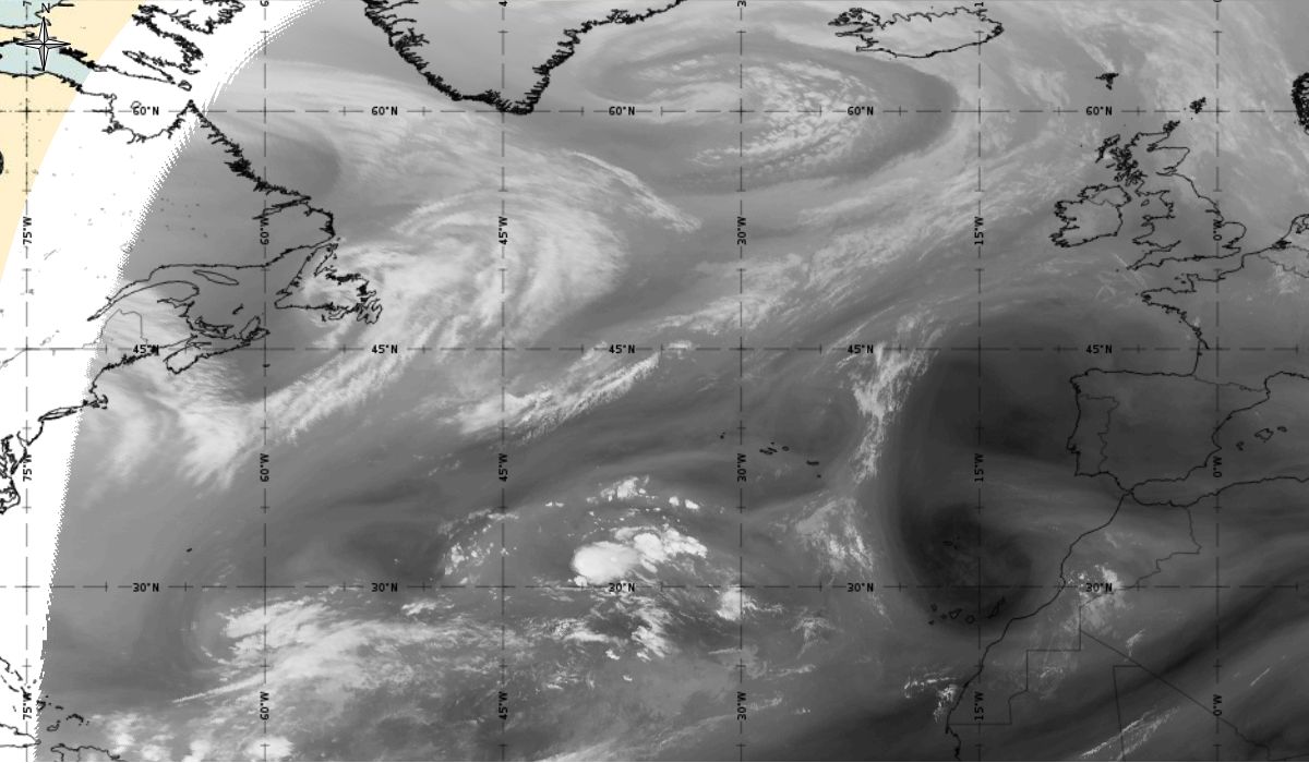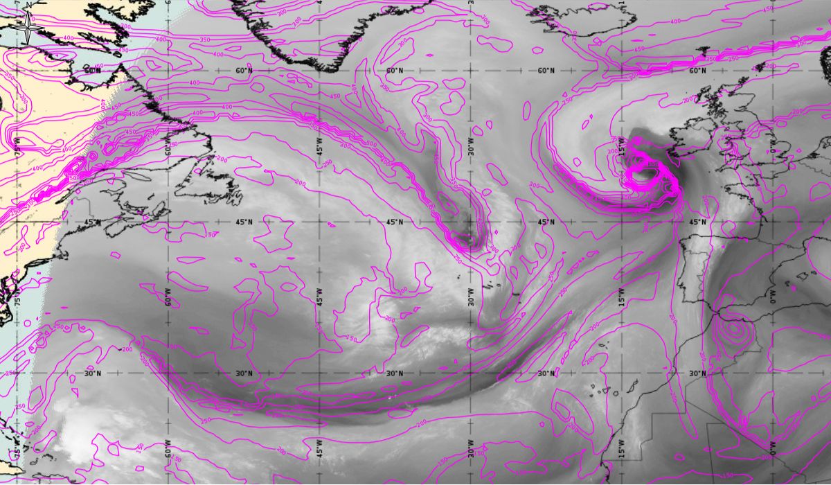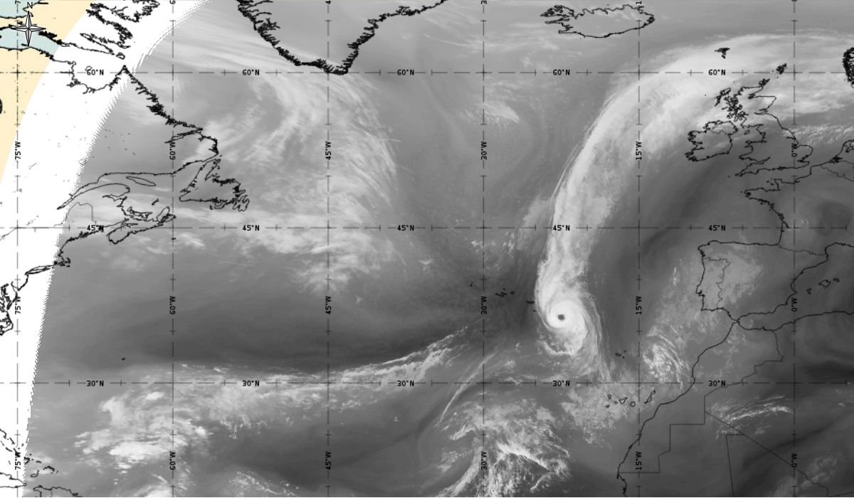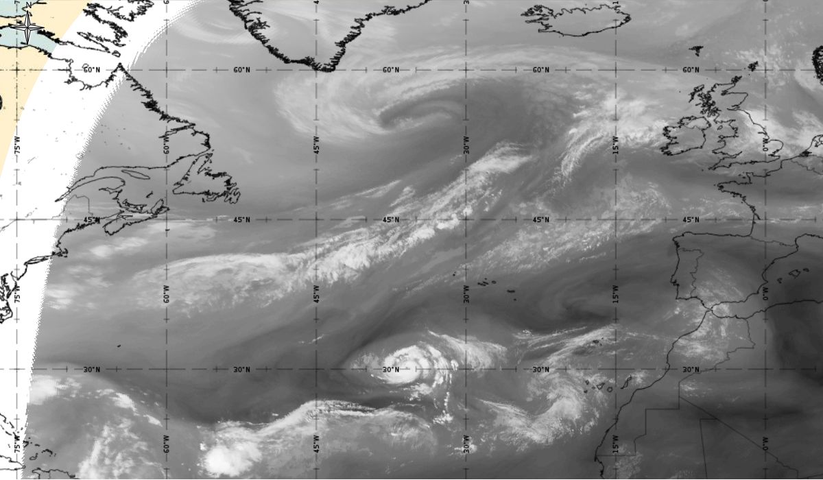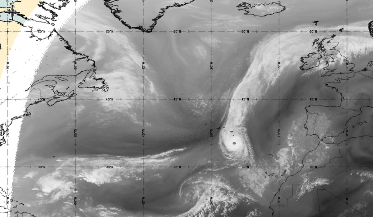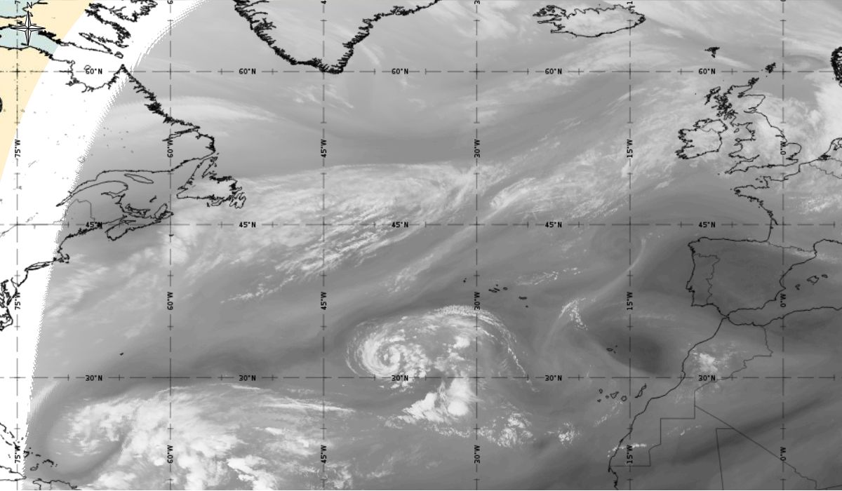 Cyclonic curvature of the cloud structure over the Atlantic can be followed by the animation of satellite images.