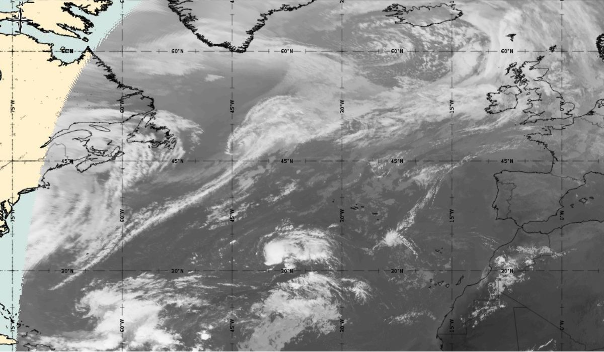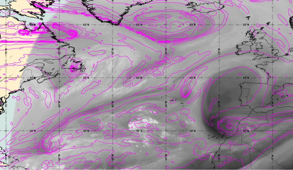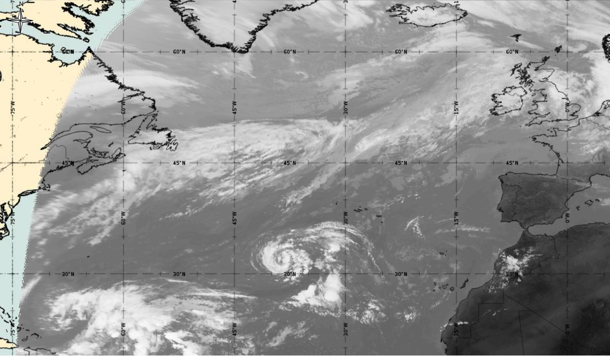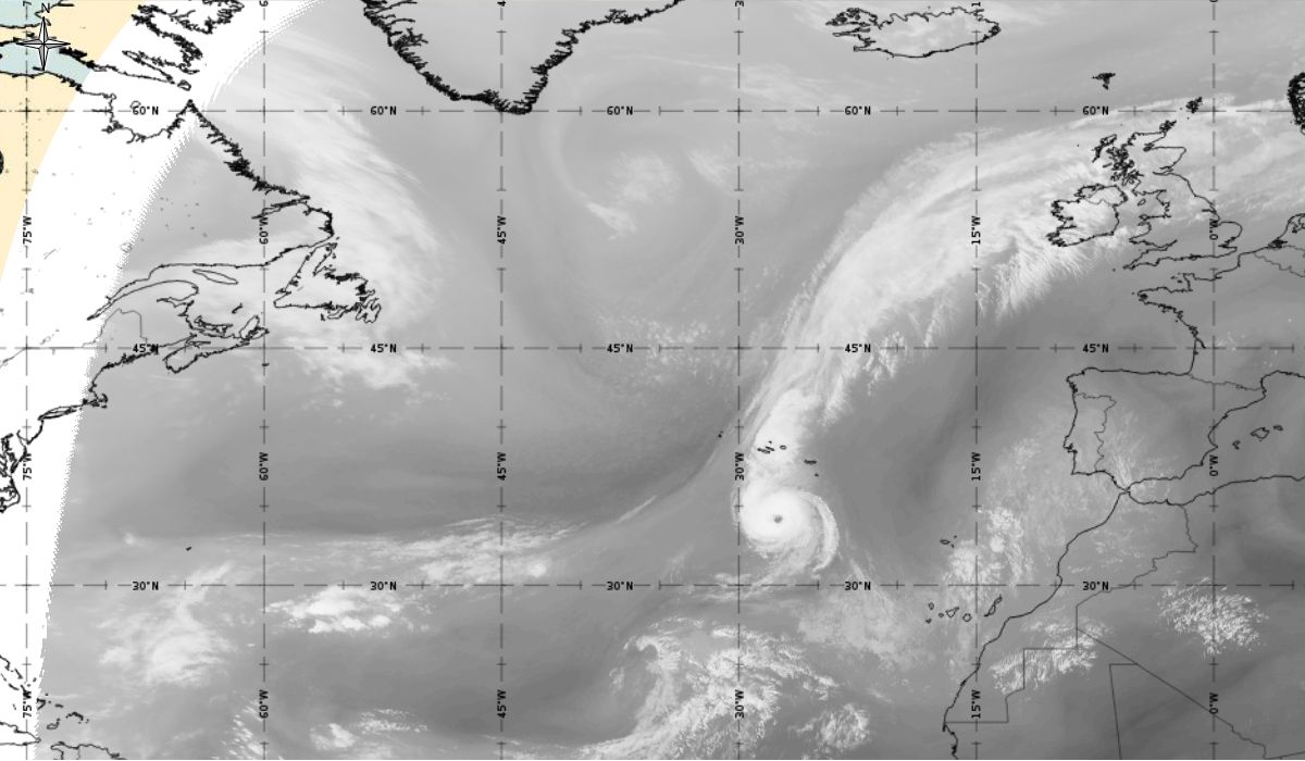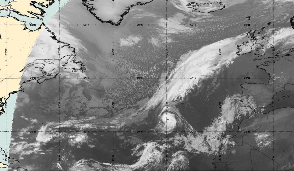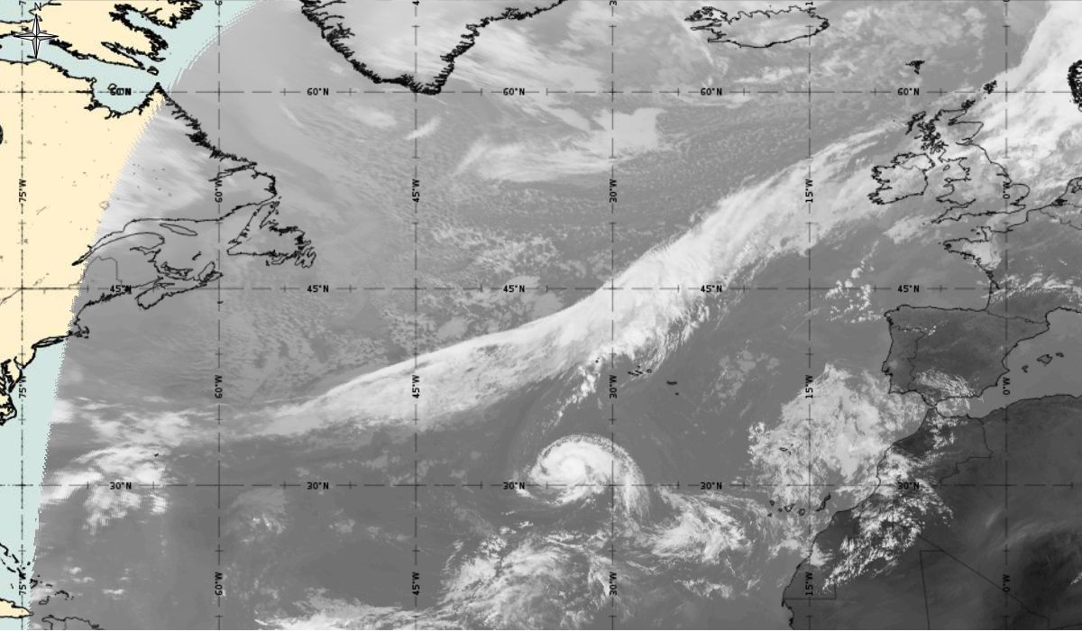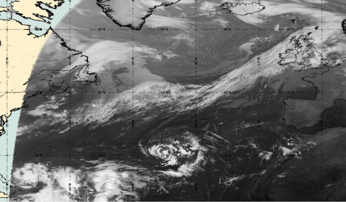 Cyclonic curvature of the cloud structure over the Atlantic can be followed by the animation of satellite images.