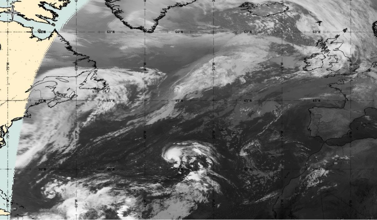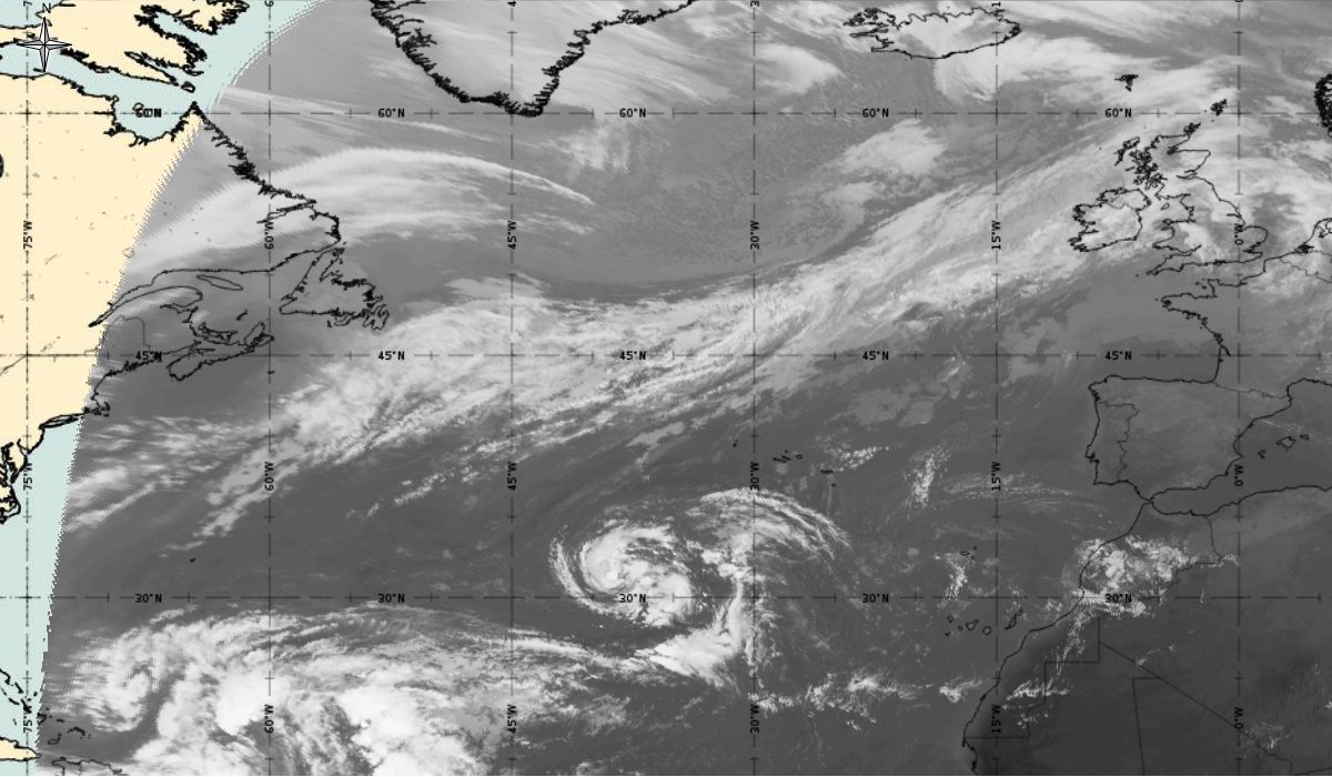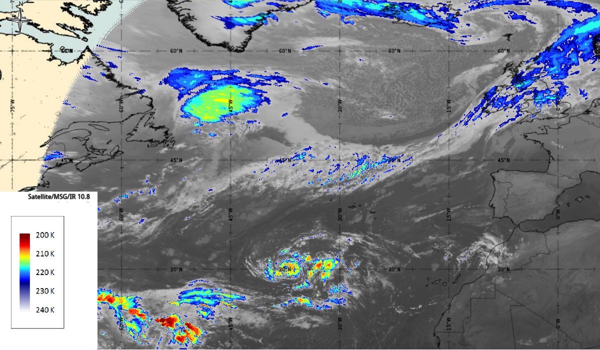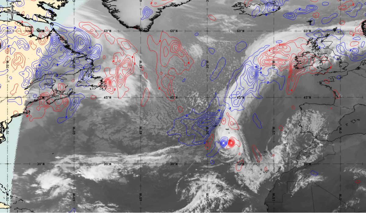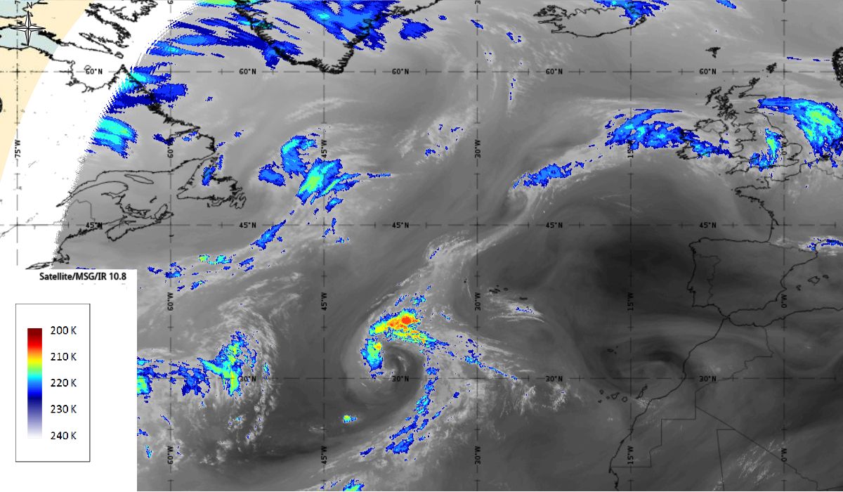 In the next 24 hours, convection steadily increased near the centre of the low and it is estimated by the National Hurricane Center (NHC) that a tropical storm (depression) - Ophelia, formed by 06:00 UTC 9th October when the system was located about 760 nautical miles (about 1400 km) southwest of the Azores (30.9 °N, 40 °W) (Figure 8 - 9th October 06:00 UTC). An area of deep convection was located east of the centre of the low.