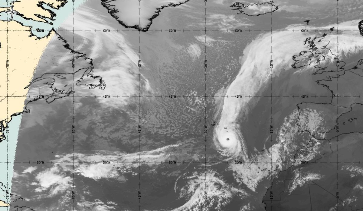 In the first 24 hours of the hurricane phase, the system is almost stationary but deepening. After that it was moving to the northeast with further development. The eye of the hurricane, a dark spot (dry area), can be followed in the cyclonic structure of thick, bright clouds (high water vapour content). The sharp, darker edge (especially notable when Ophelia reached its maximum on 14th October between 12:00 and 18:00 UTC) on the west side of the wide cloud system indicate a jet stream, which speeds up Ophelia to the northeast.