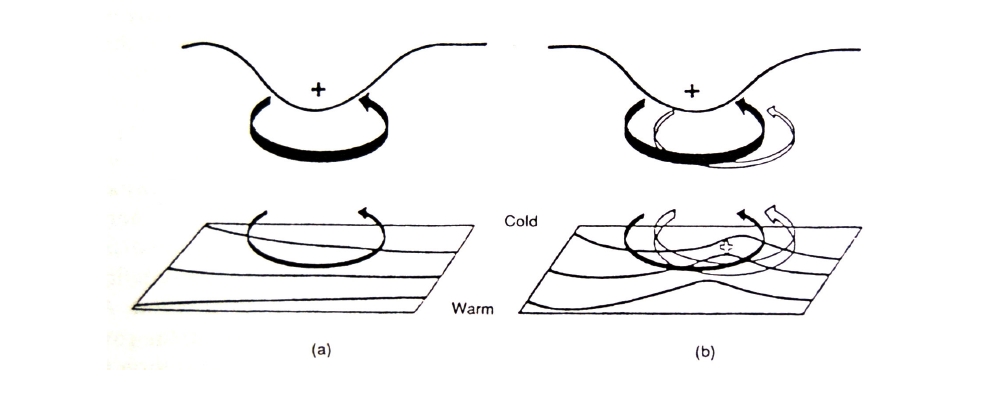 Figure 2: A schematic picture of cyclogenesis associated with the arrival of an upper-level vorticity anomaly. (a) The low-level cyclonic vorticity induced by the upper-level vorticity anomaly. The circulation induced by the vorticity anomaly is shown by the solid arrows, and potential temperature contours are shown at the lower boundary. The advection of potential temperature by the induced lower-level circulation leads to a warm anomaly slightly east of the upper-level anomaly. This in turn will induce a cyclonic circulation as shown by the open arrows in (b). The induced upper-level circulation will reinforce the original upper-level anomaly and can lead to amplification of the disturbance. © Holton, 1992.