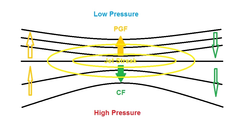 The lifting effect is even more effective when two jet streaks are placed in a way that the left exit region of one jet is co-located with the right entrance region of a second jet (so called Jet Streak Coupling).