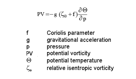 Potential vorticity is the absolute vorticity of an air parcel moving along an isentropic surface. Note from the relation below, that PV is simply the product of absolute vorticity on an isentropic surface (ζθ + f) and static stability (∂θ/∂p). Hence, PV consists of two factors, a dynamic and a thermodynamic part: