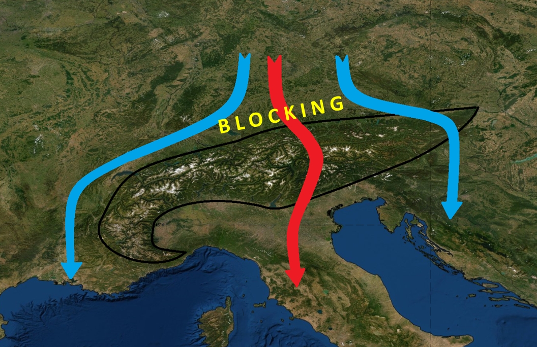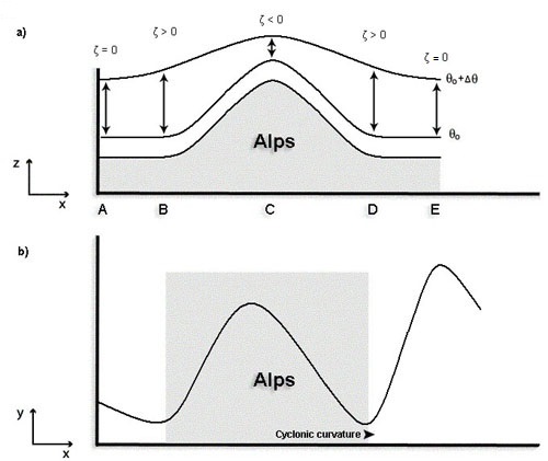 A low-level airflow from the north that is encountering an obstacle is partially blocked on its way south before it is either lifted and overflows the Alps or contours (moves around) them. Blocking leads to an upwind pressure rise near the ground and to a pressure drop at the leeward side of the mountains, which is caused by the isentropic (constant entropy) heating of the downward flowing air that overcame the obstacle (see Figure 2).