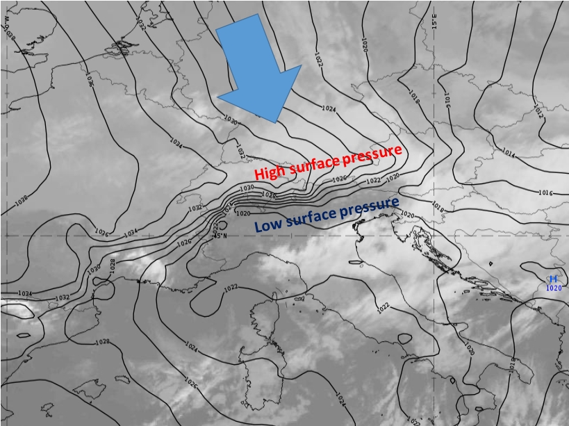 Figure 2: Mean sea level pressure and IR10.8 μm image from January 5, 2019 at 12:00 UTC. Orographic blocking of cold air from the north leads to a large cross-Alpine pressure gradient.