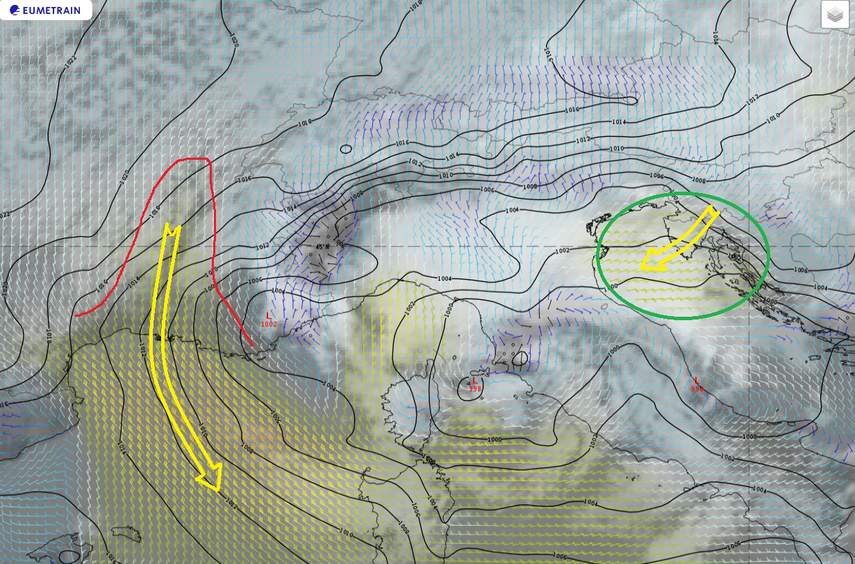 The example below shows the wind barbs over southern France during a Mistral episode caused by an intense low-pressure system over the Ligurian Sea. Although the surface wind is strongest over the open sea, a bulge of higher wind speeds can be seen along the Rhône Valley (red line in Figure 1).