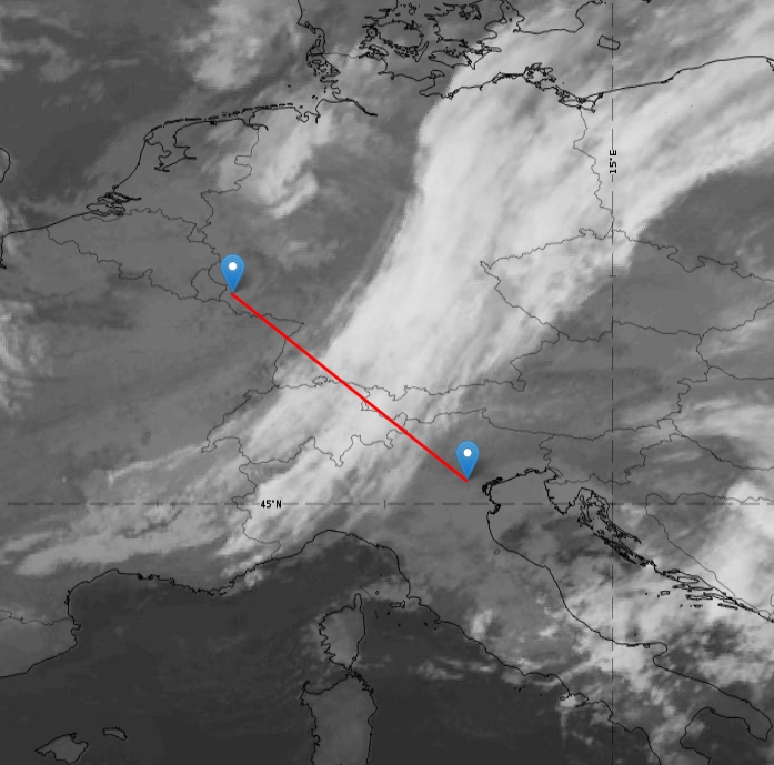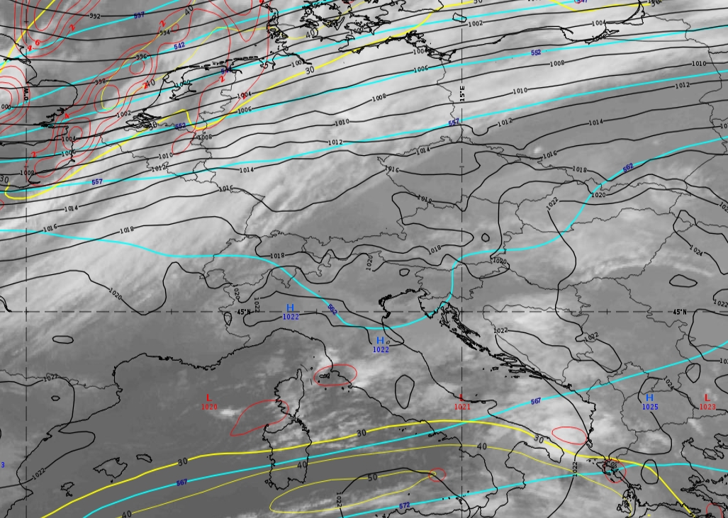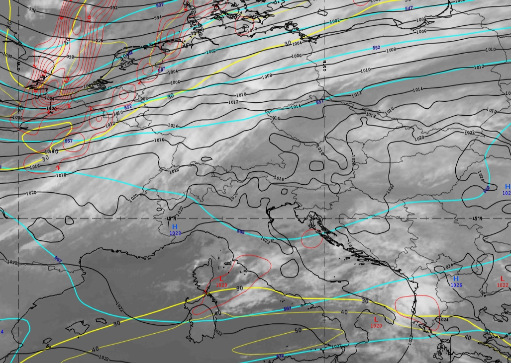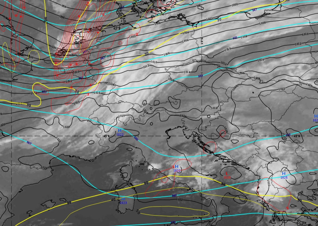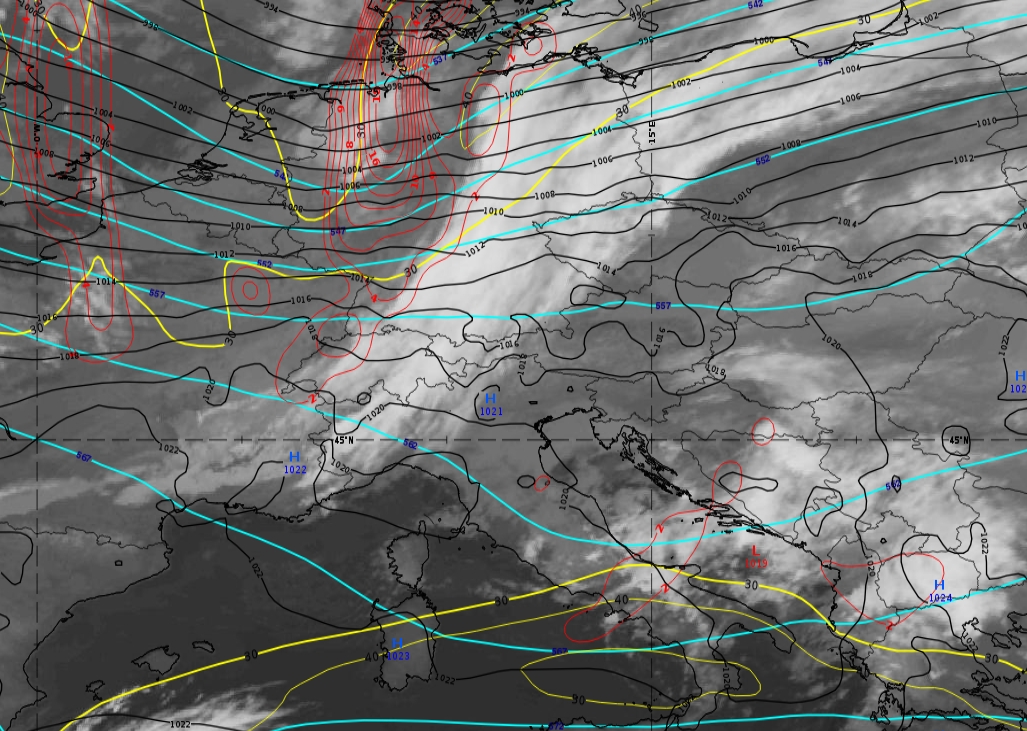 Figure 4: IR10.8 loop (from December 6, 2019, 15:00 UTC to December 7 2019, 15:00 UTC). Mean sea level pressure (black), isotachs at 300 hPa (yellow), cyclonic vorticity at 300 hPa (red) and geopotential height at 500 hPa (cyan).