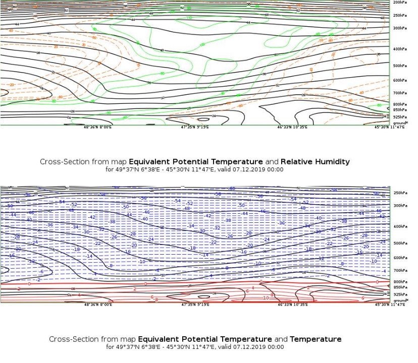 The chosen example shows again the passage of a cold front across the Alps. This time, orography does not strongly impede the cold front as in the previous example, mainly because the front only comes into effect above 700 hPa (see the cross section in Figure 5). Moreover, the interaction of the surface low with the left exit region of a jet is missing.