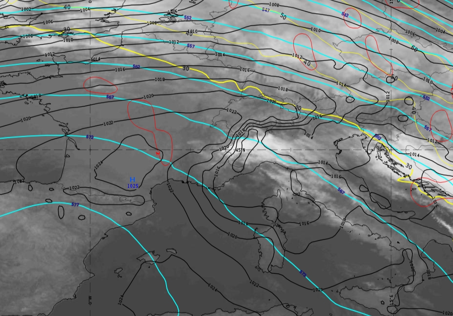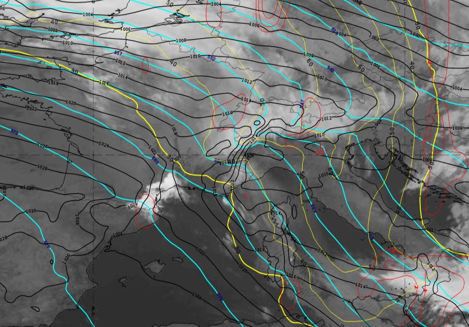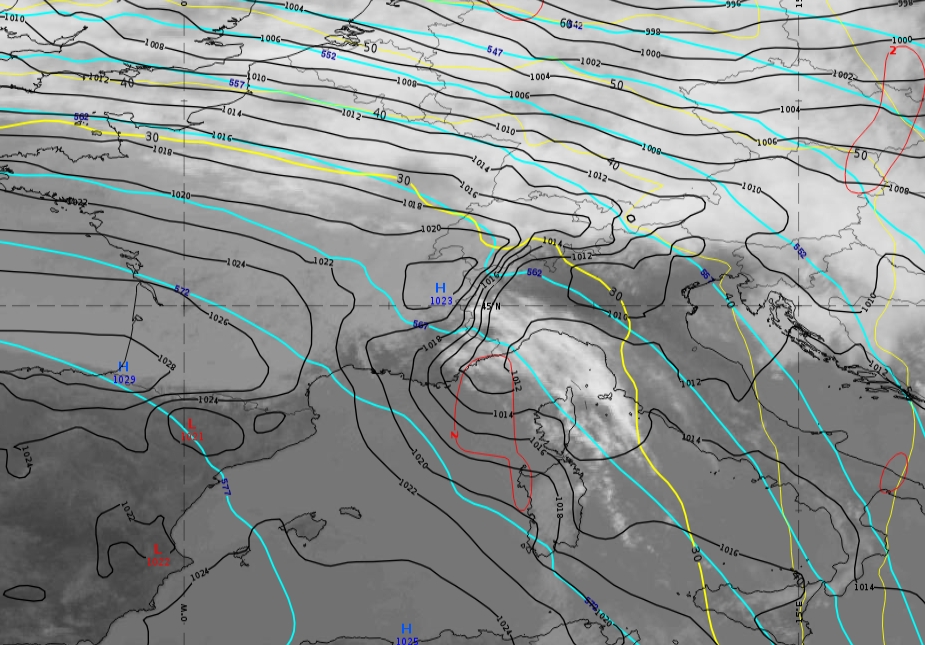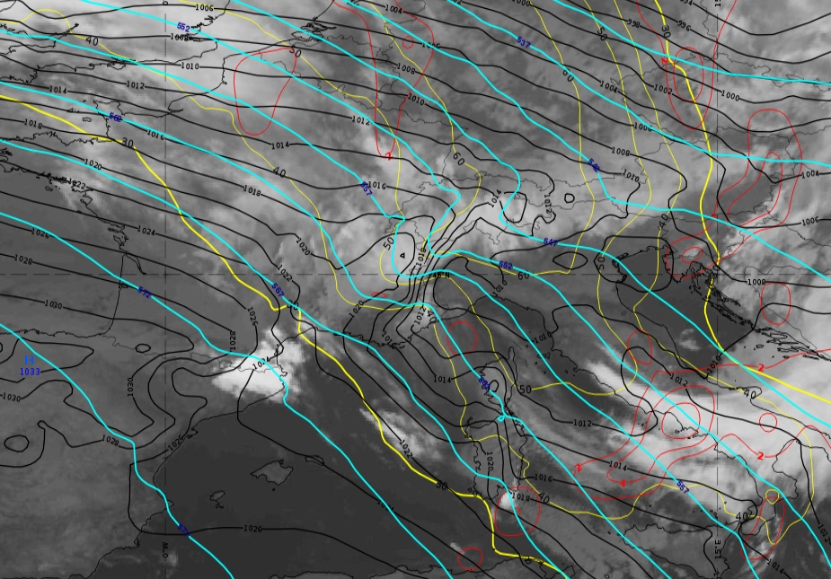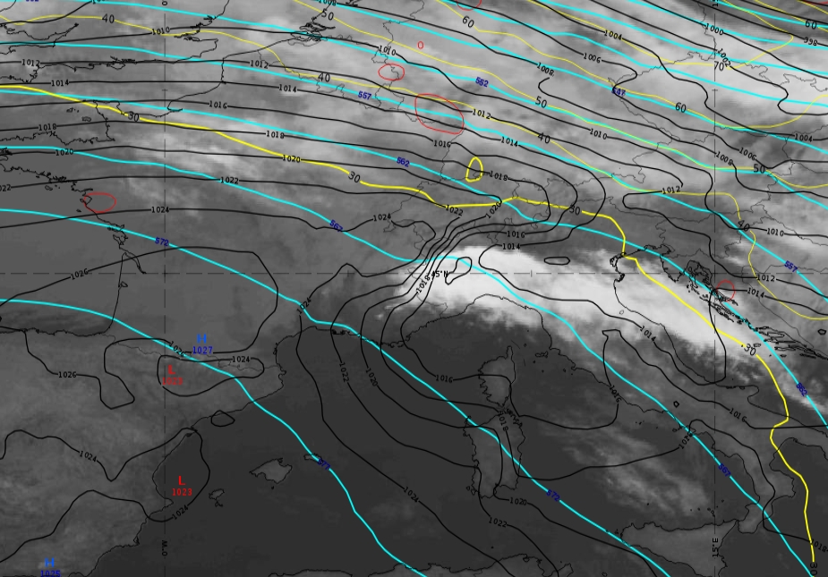 Figure 10: IR10.8 loop (from March 15, 2019; 00:00 UTC to March 16, 2019; 06:00 UTC). Mean sea level pressure (black), isotachs at 300 hPa (yellow), cyclonic vorticity at 300 hPa (red) and geopotential height at 500 hPa (cyan).