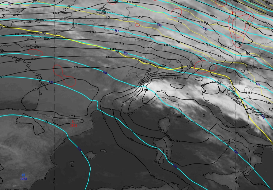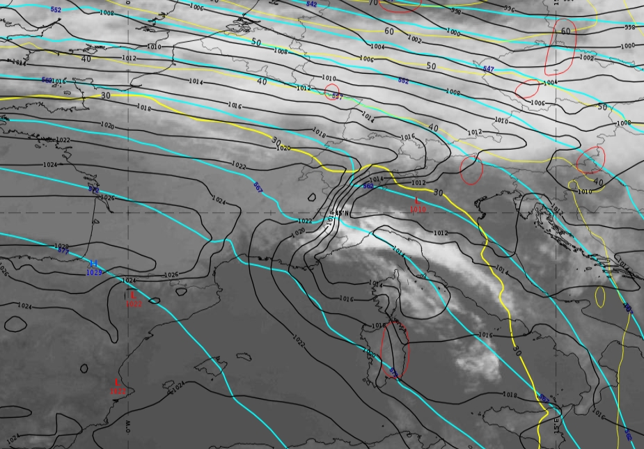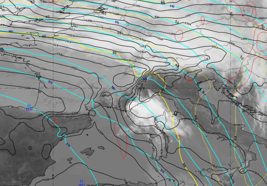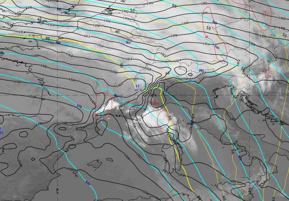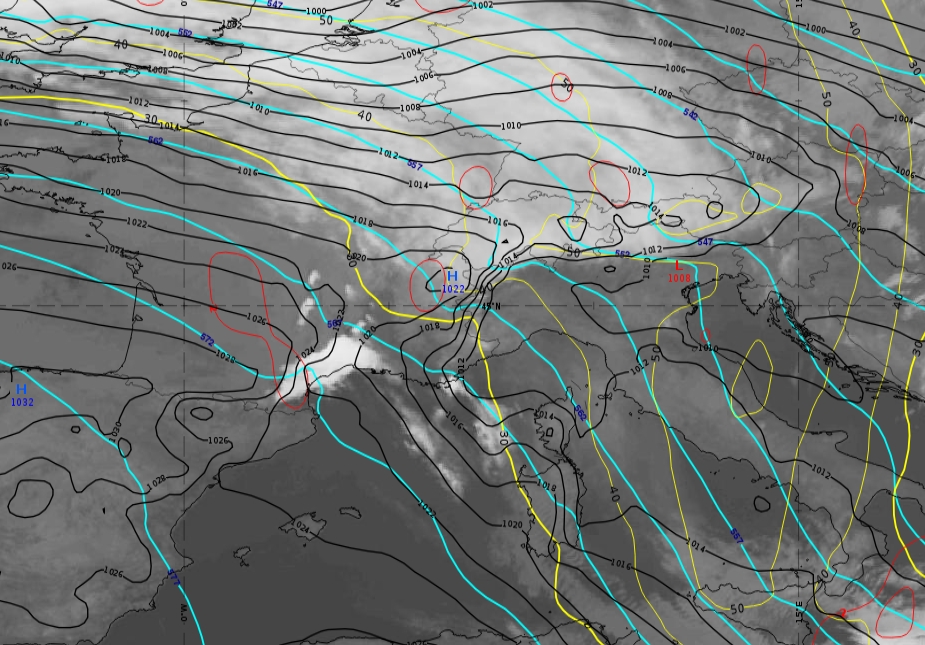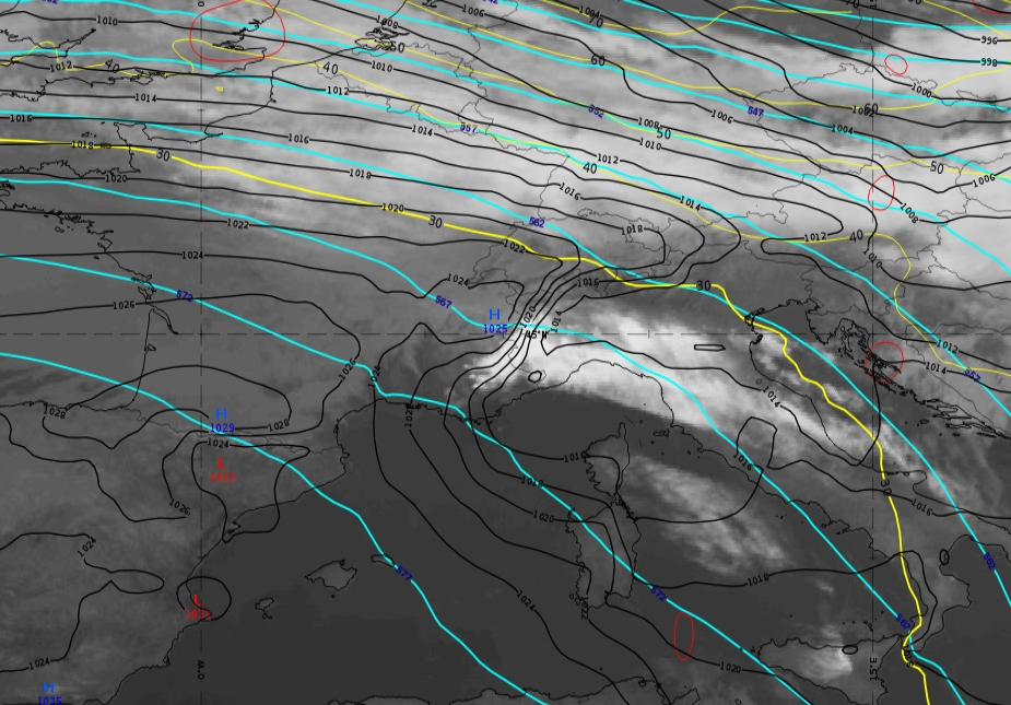 Figure 10: IR10.8 loop (from March 15, 2019; 00:00 UTC to March 16, 2019; 06:00 UTC). Mean sea level pressure (black), isotachs at 300 hPa (yellow), cyclonic vorticity at 300 hPa (red) and geopotential height at 500 hPa (cyan).