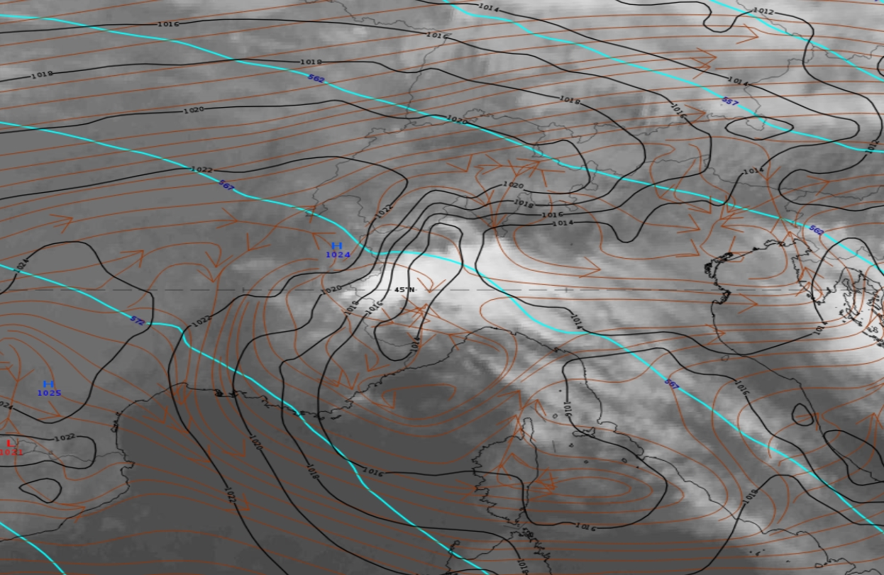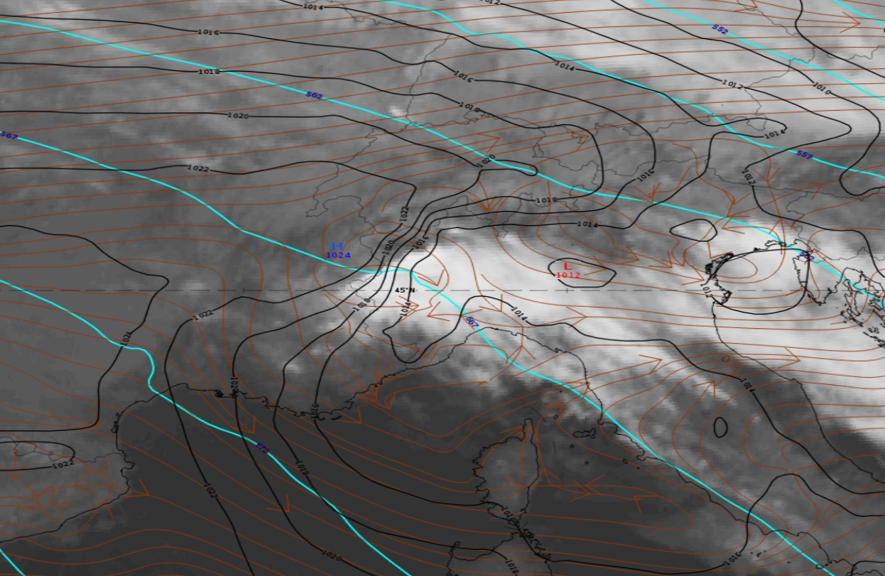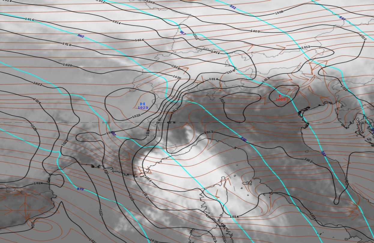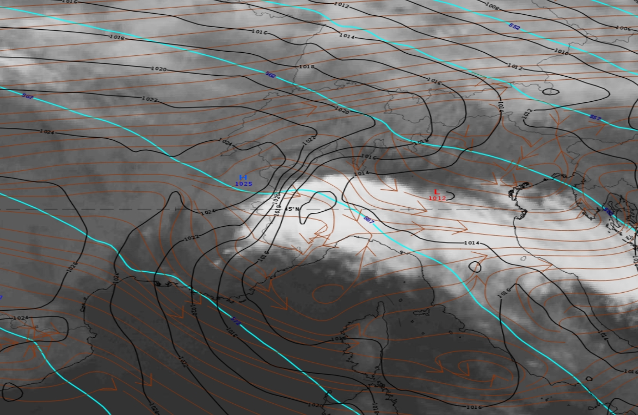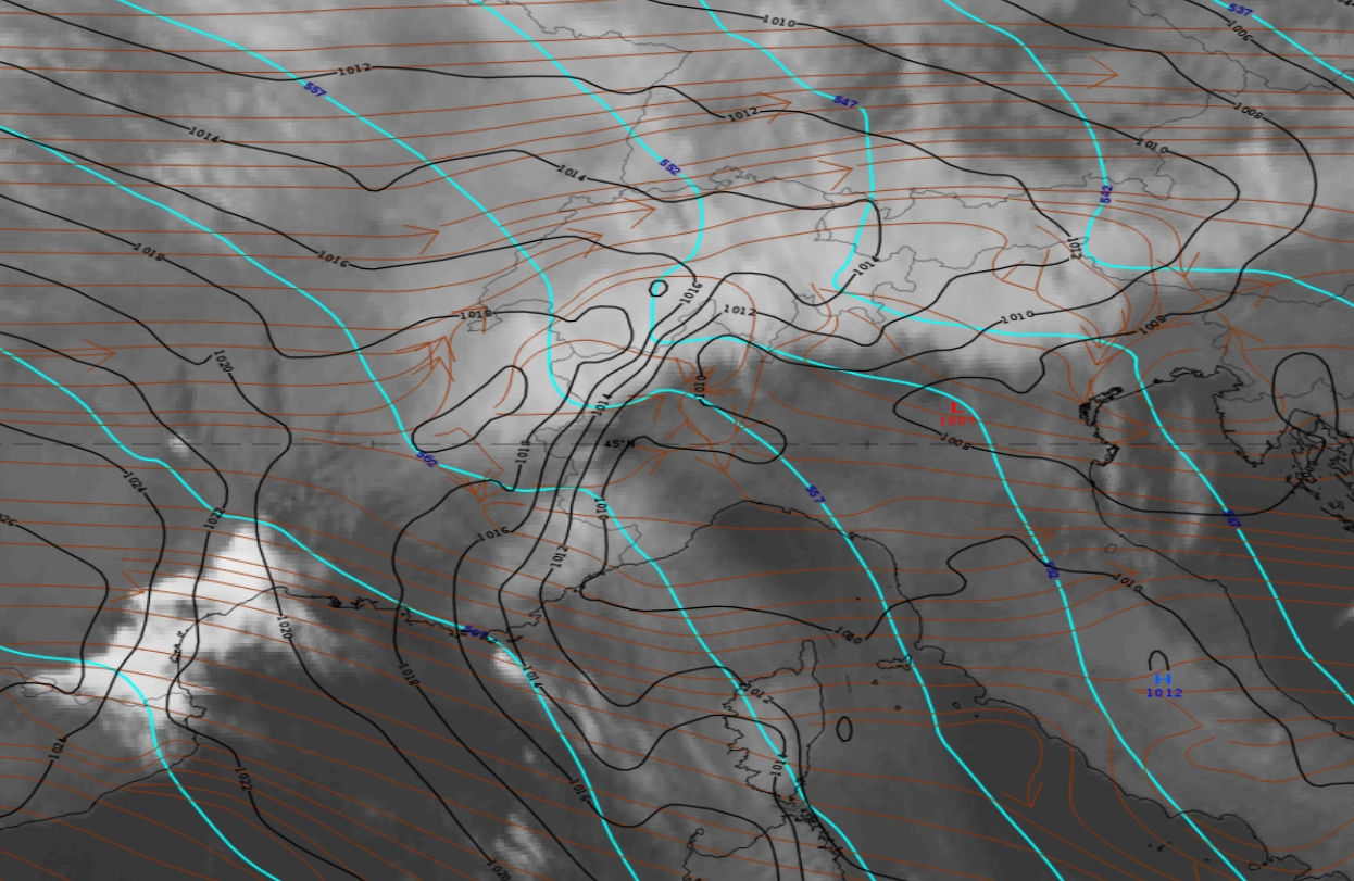 Figure 11: IR10.8 loop (from March 15, 2019; 00:00 UTC to March 16, 2019; 06:00 UTC). Mean sea level pressure (black), stream lines at 950 hPa (brown) and geopotential height at 500 hPa (cyan).