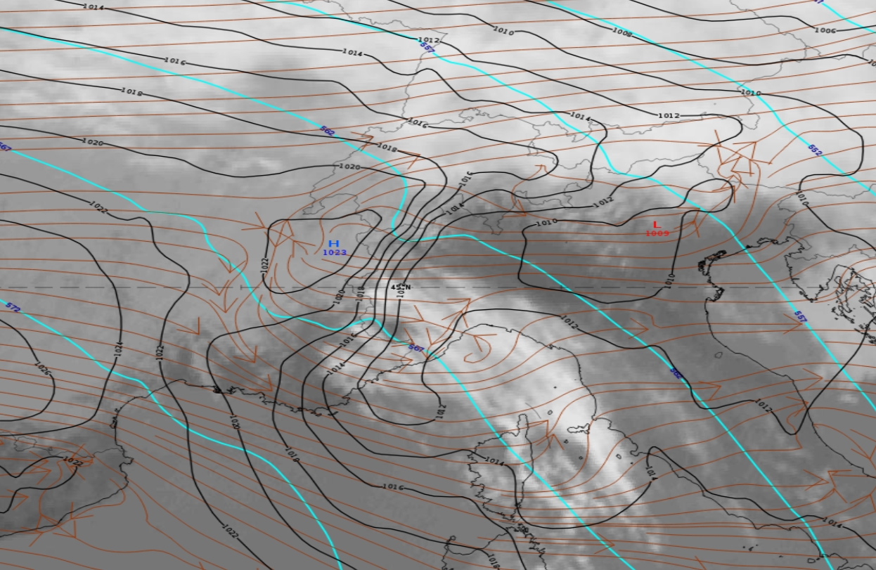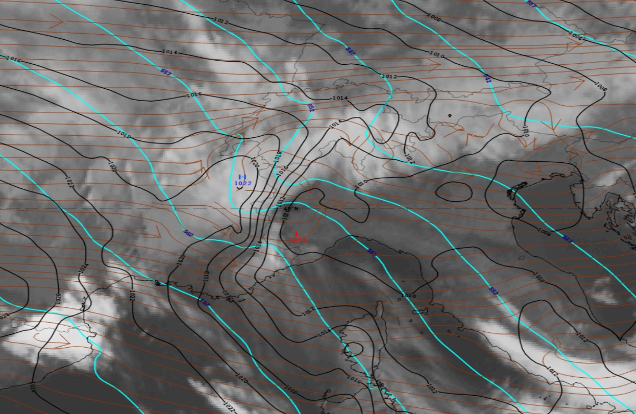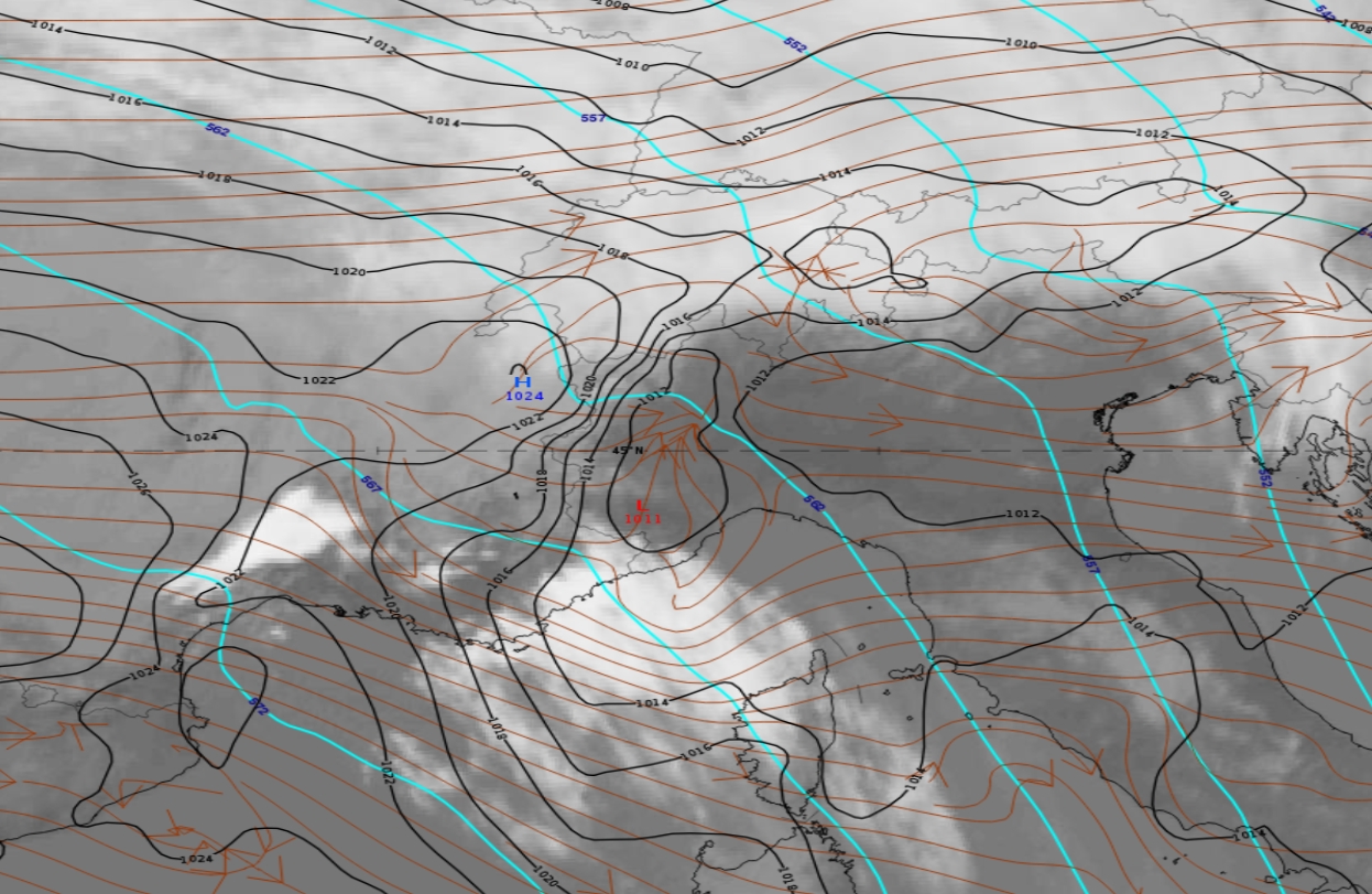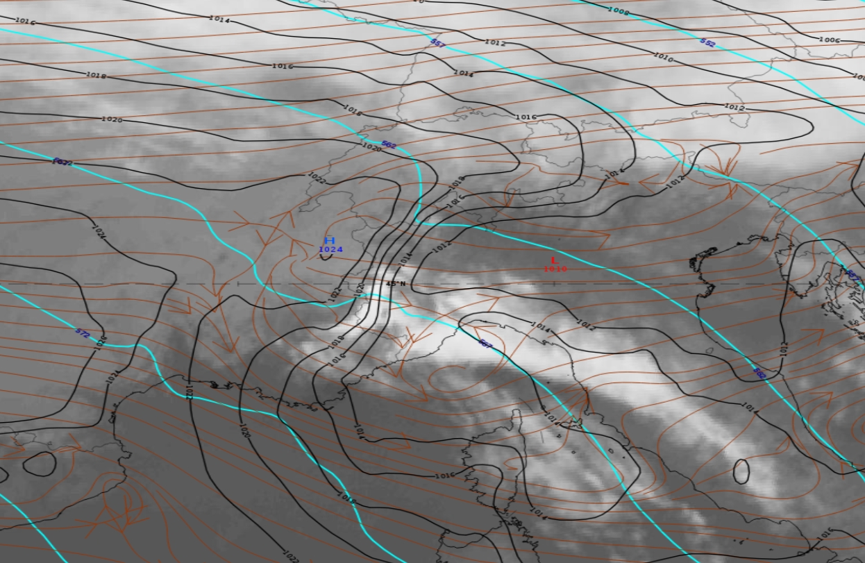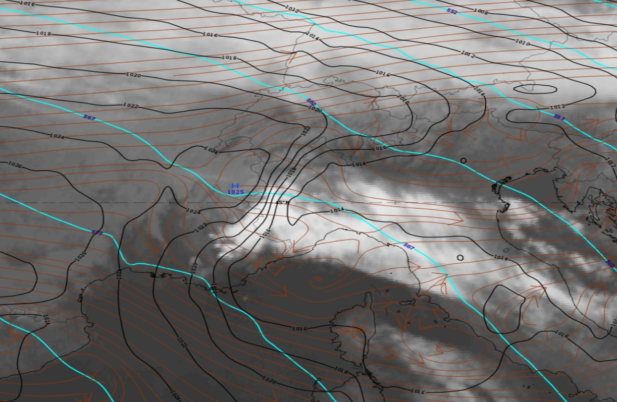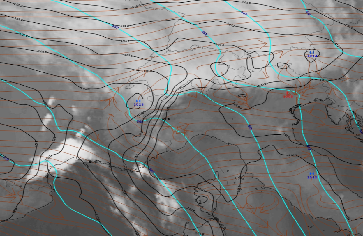 Figure 11: IR10.8 loop (from March 15, 2019; 00:00 UTC to March 16, 2019; 06:00 UTC). Mean sea level pressure (black), stream lines at 950 hPa (brown) and geopotential height at 500 hPa (cyan).