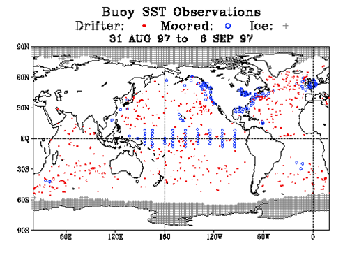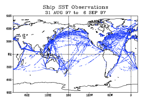 Sea surface temperatures have been measured for over one hundred years, first using instruments on shorelines, ships and buoys. Such observations provide limited spatial and temporal coverage, as illustrated from the next two figures that show measurements taken between the 31st August and the 6th September 1997. Figure 2 shows ship-based and Figure 3 shows buoy measurements (most having sensors at about a 1-meter depth or placed at regular intervals along a tether line).