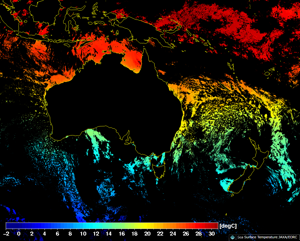 Fig. 19: SST for 1 September 2017 at 15:30 UTC, derived from AHI (Advanced Himawari Imager) radiometer on board the Himawari geostationary satellite operated by the Japanese Meteorological Agency, JMA.