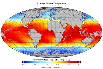 Fig. 15: nighttime SST (annual average) at 4-km spatial resolution obtained from a reanalysis of historical AVHRR data.