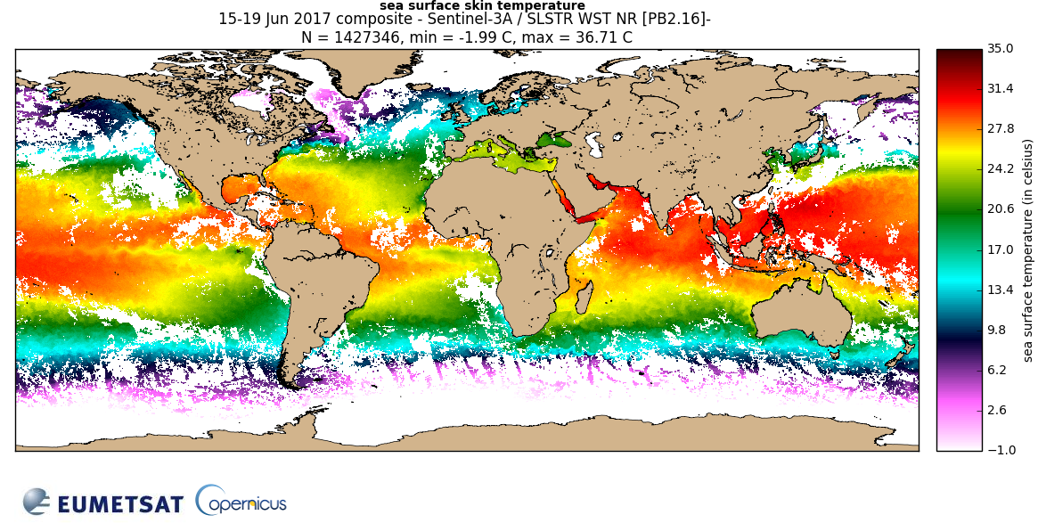 Fig. 21: Composite of SST obtained from Sentinel 3-A onboard the SLSTR between 15-19 Jun 2017 available from the Copernicus Marine Service.
