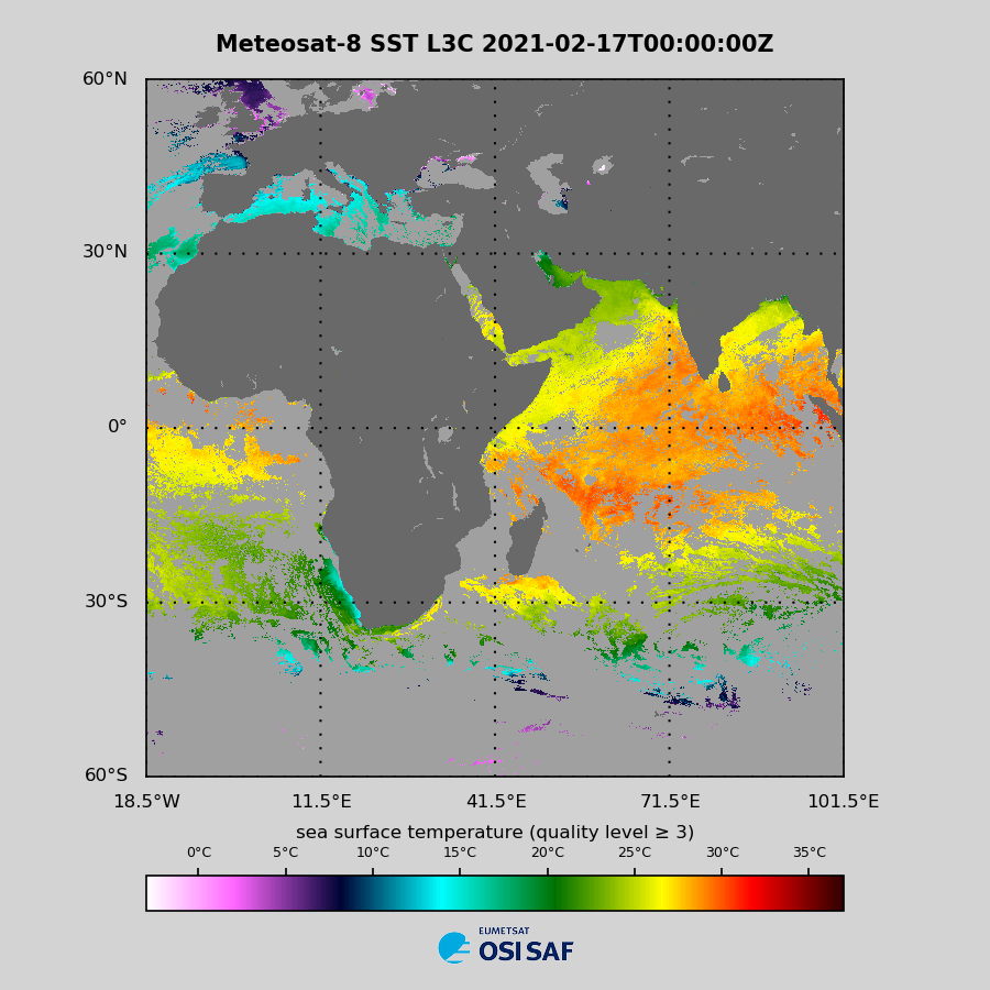 Fig. 13:Figure 13 - Eumetsat OSI SAF SST for 17 February 2021 at 00:00 UTC derived from the EUMETSAT Meteosat-8 geostationary satellite (located over the Indian Ocean). This product is available every hour.