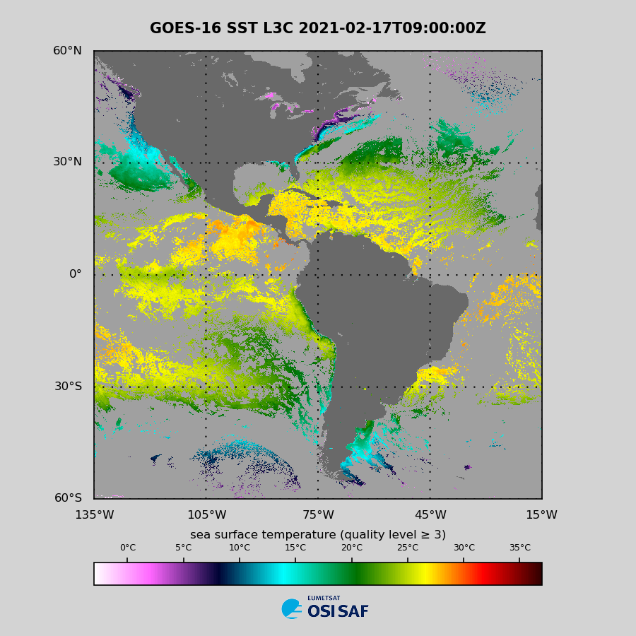 Eumetsat OSI SAF also produces SST fields operationally from the GOES-E satellite. An illustration is shown in Fig. 14, for 17 February 2021 at 09:00 UTC.
