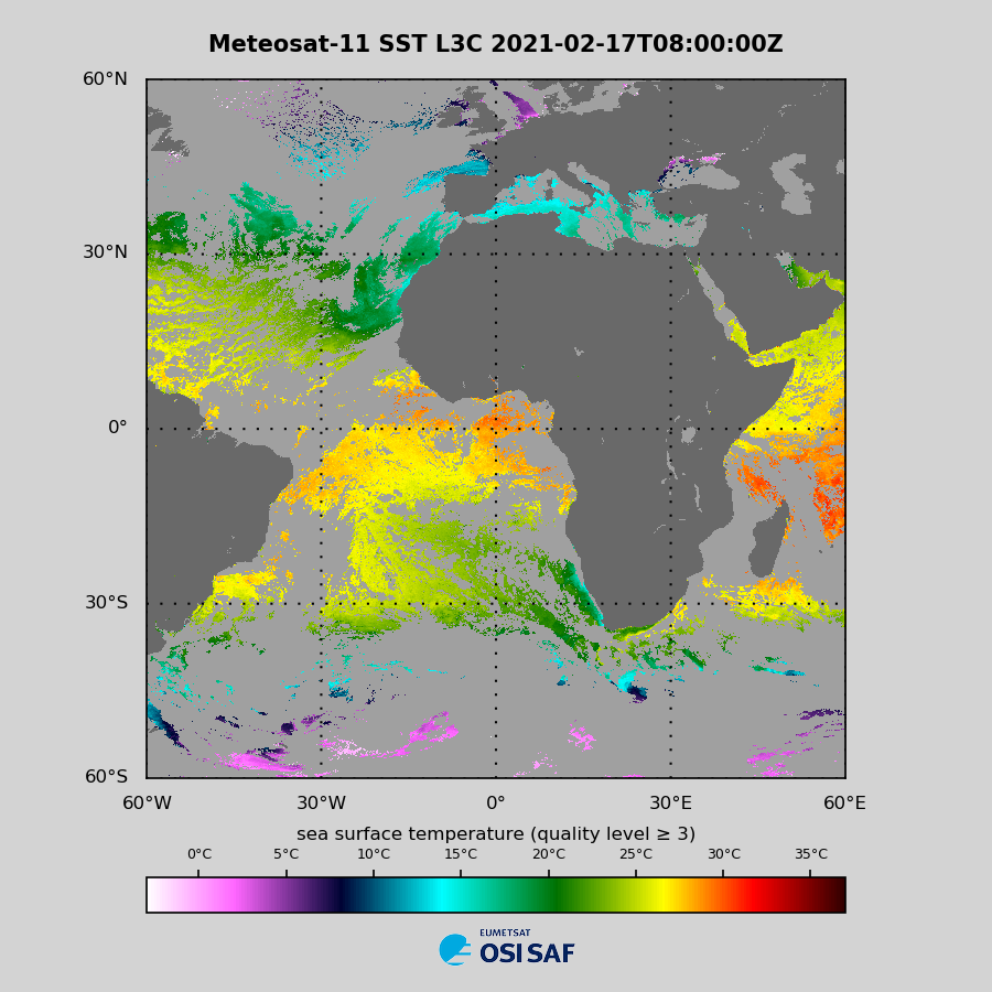 Fig. 12: EUMETSAT OSI SAF SST for 17 February 2021 at 08:00 UTC derived from the EUMETSAT Meteosat-11 geostationary satellite. This product is available every hour.