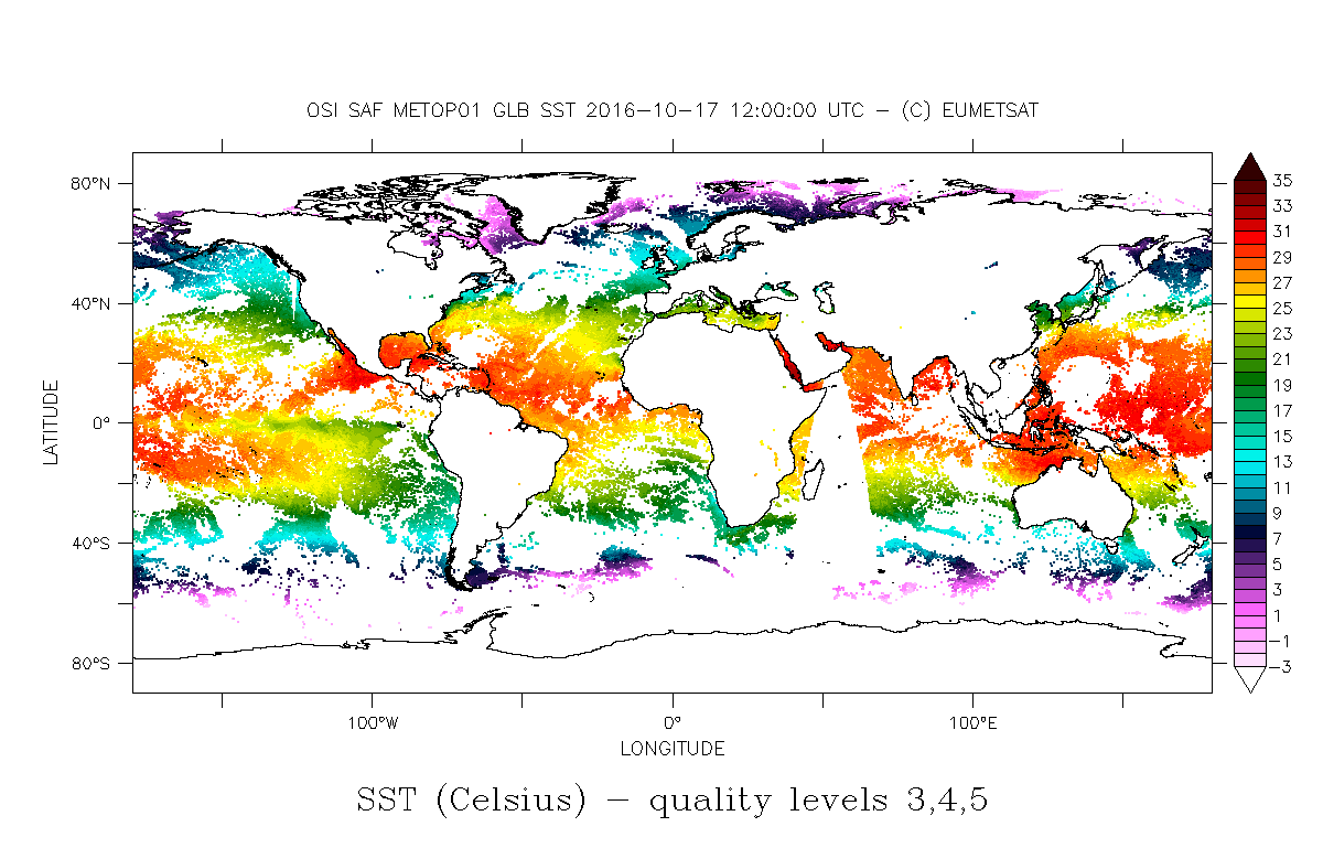 Fig. 16: SST composite for 17 October 2016 produced by the OSI SAF, http://osi-saf.eumetsat.int. This product is derived from the EUMETSAT polar orbiter satellite Metop 01. Source: http://osi-saf.eumetsat.int).