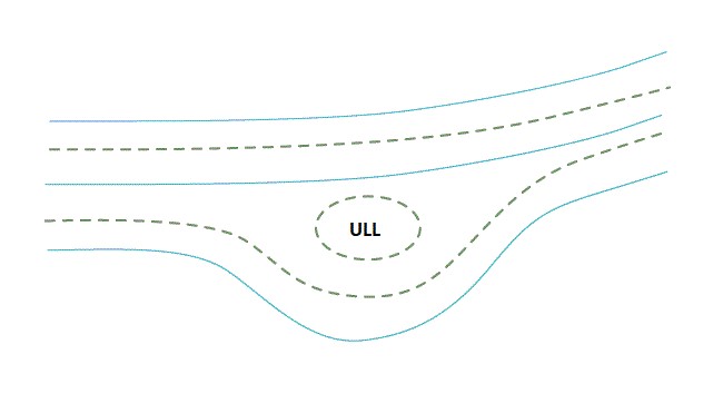 The next example of a dissolving ULL is typical for winter conditions, where the polar front reaches far south. The ULL is moving east, approaching the trough and finally being absorbed.