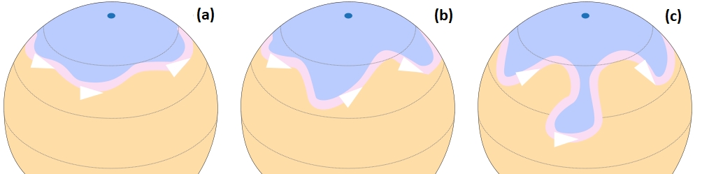 Figure 1: Planetary Rossby waves with increasing amplitude (from a to c). Blue represents the polar air mass, and orange the warmer air masses. The pink ribbon marks the position of the jet stream. © Fred the Oyster, CC-BY-SA.