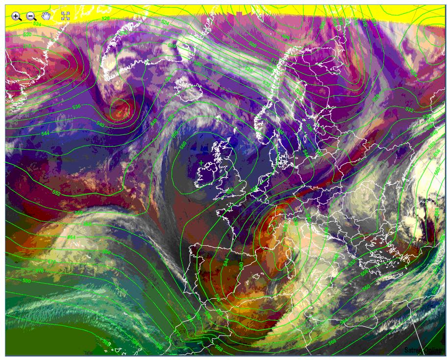 Figure 3.10: 9 March 2010 12UTC - MSG Airmass RGB; green lines: ECMWF ATP500