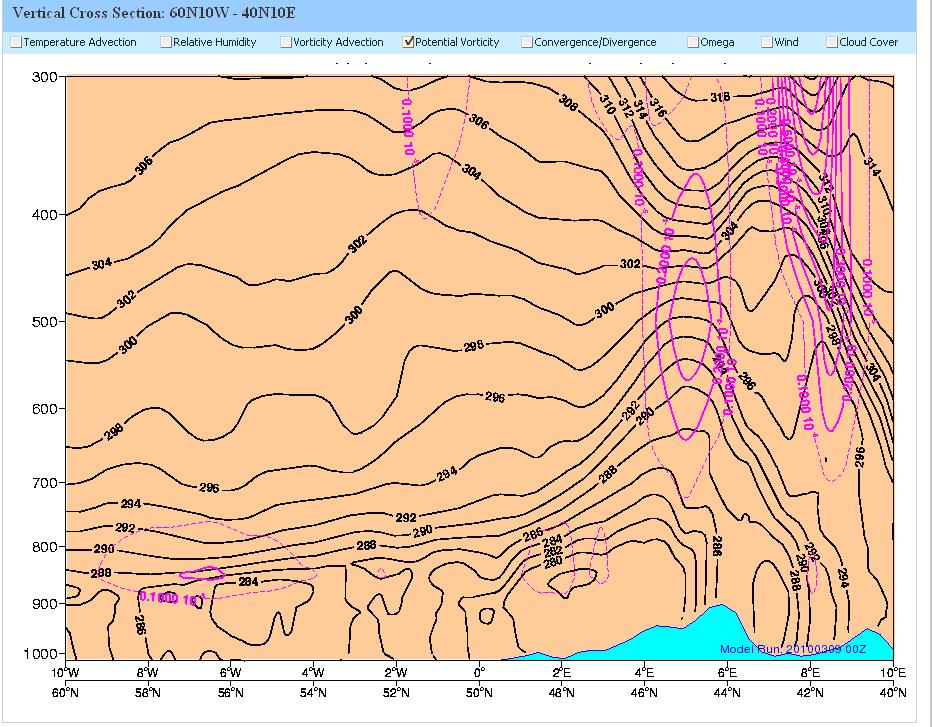 Figure 3.11: 9 March 2010 12UTC - Vertical Cross Section 60N 10W - 40N 10E; black lines: ECMWF isentropes; purple lines: ECMWF Potential Vorticity