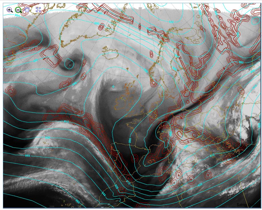 Figure 3.12: 9 March 2010 12UTC - MSG WV6.2; cyan lines: ECMWF ATP300; red lines: ECMWF Total Deformation at 300hPa
