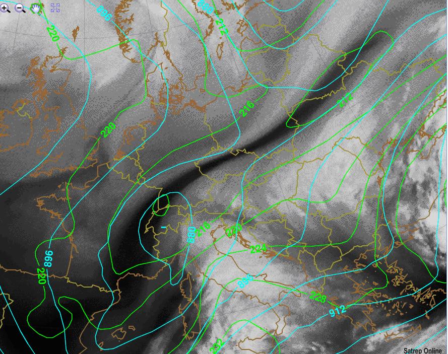 Figure 3.13: 9 March 2010 12UTC - MSG WV6.2; cyan lines: ECMWF ATP300; green lines: ECMWF Equivalent Thickness