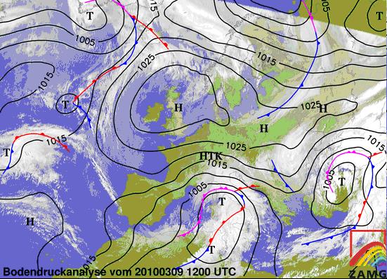 Figure 3.15: 9.3.2010 12UTC - MSG IR; black lines: MSLP; Surface Frontal Analysis