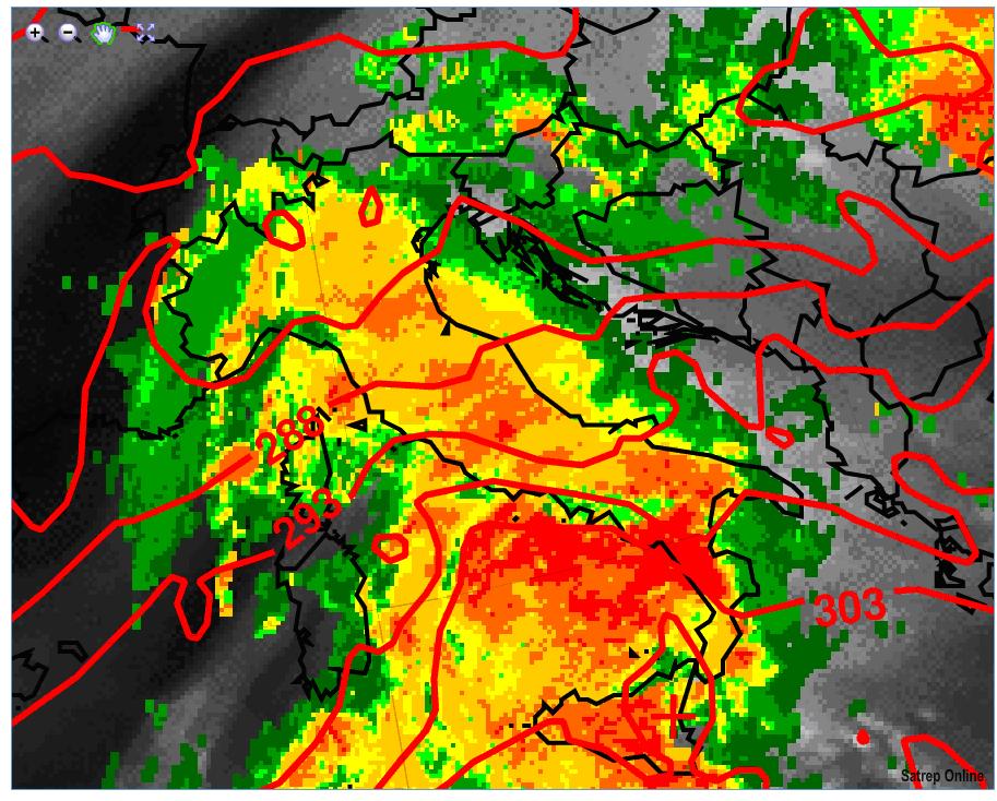 Figure 3.16: 9.3.2010 12UTC - MSG IR 10.8 with overlay NWCSAF Precipitating Clouds; red lines: ECMWF TheataE in 850hPa
