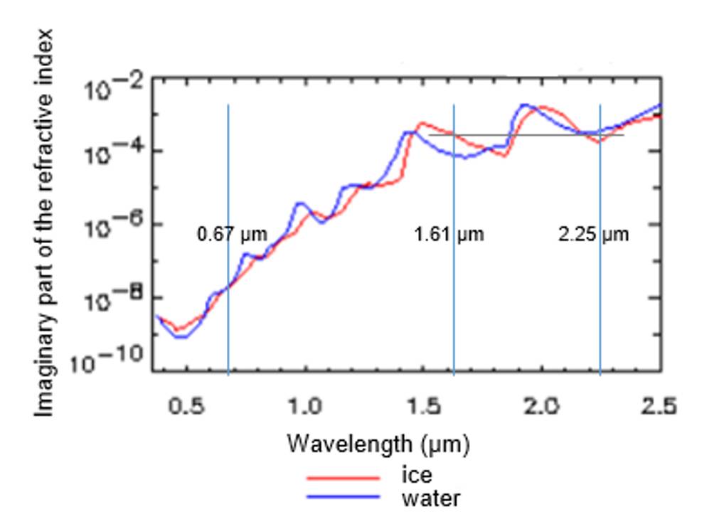 Figure 2: Absorption of ice (red curve) and water (blue curve). The vertical lines indicate the central wavelengths of the VIIRS channels used in the Cloud Phase RGB. The horizontal line helps to compare the ice absorption at 1.61 and 2.25 μm.