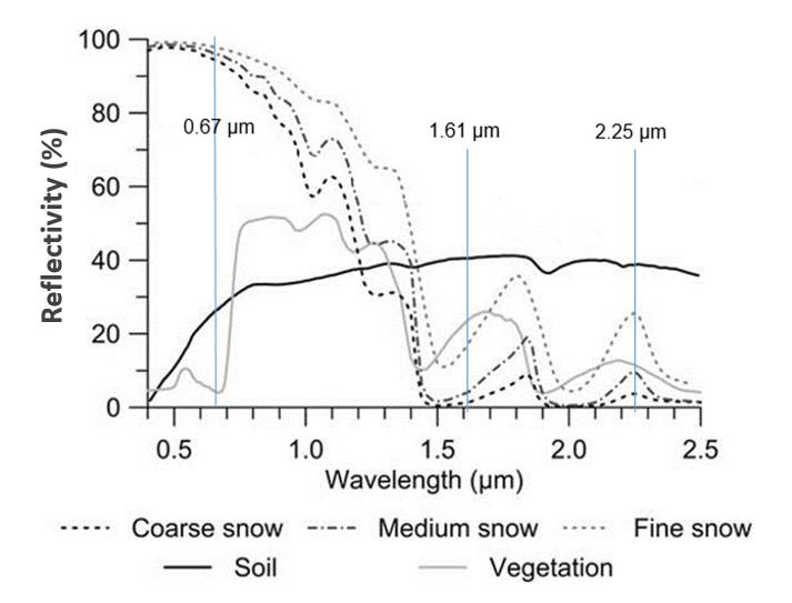 Figure 3 depicts the reflectivity of soil, vegetation and snow of three different grain sizes.