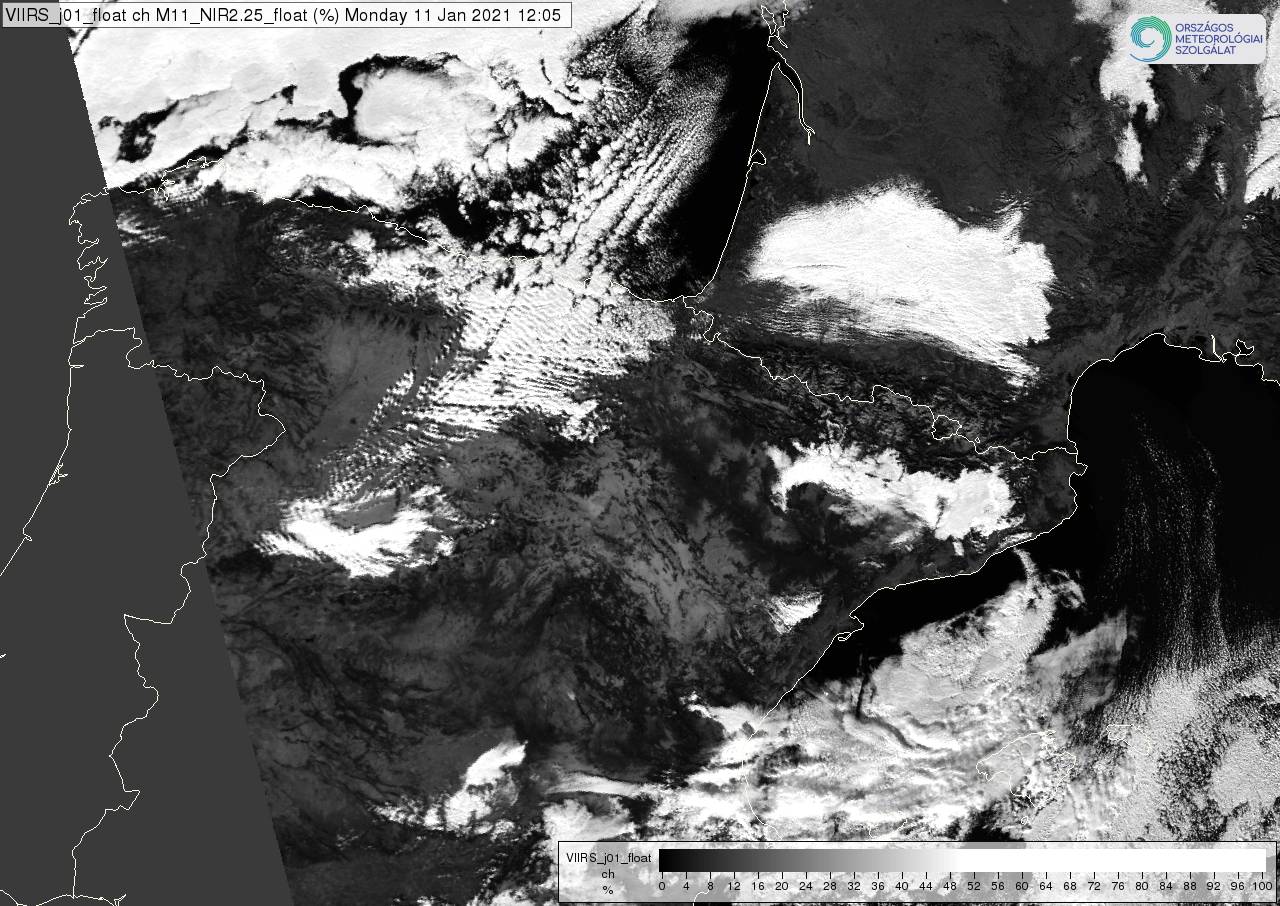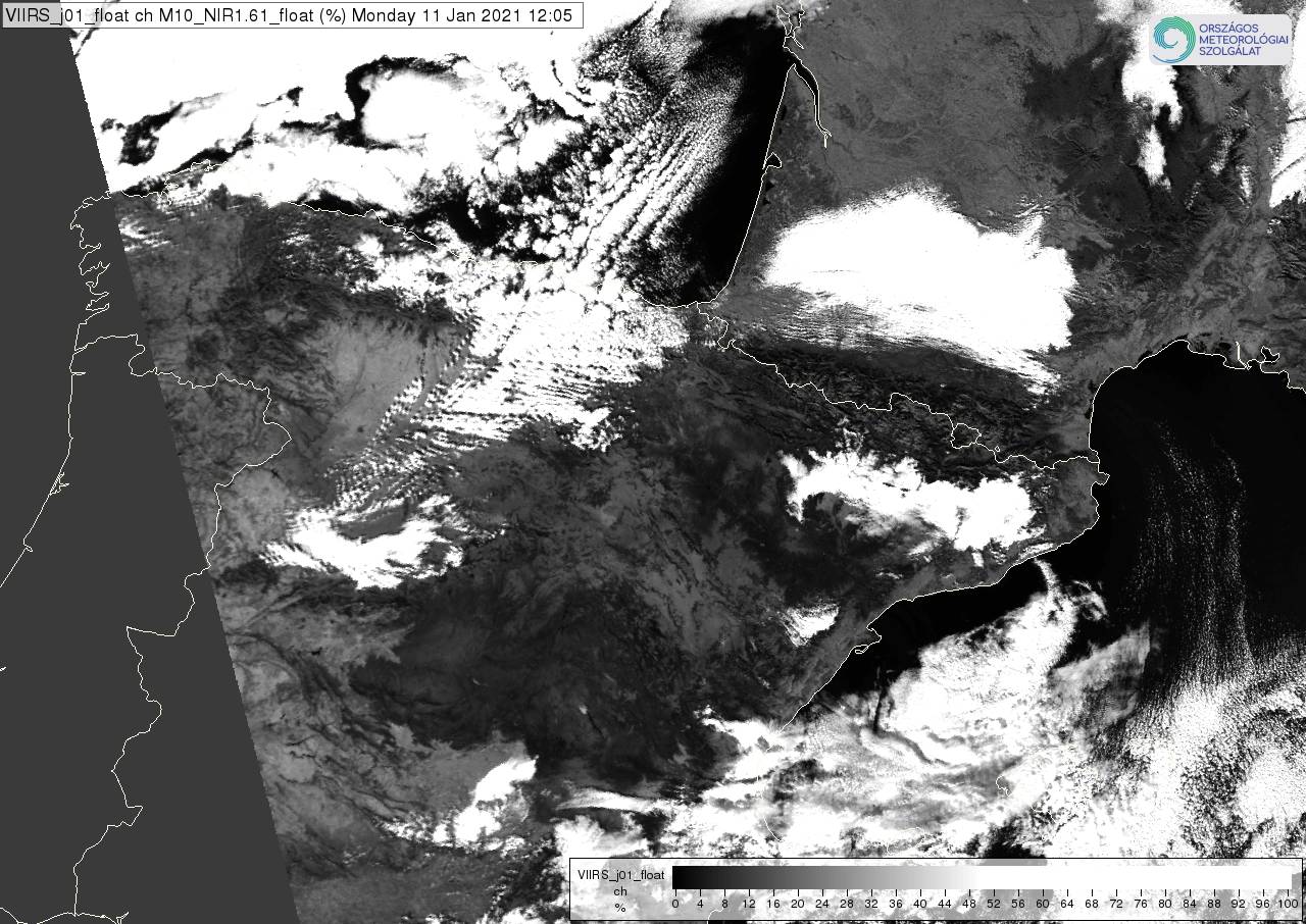 Figure 5: NOAA-20 VIIRS NIR1.61 image visualized in the 0-50% reflectivity range (values above 50% are depicted white), 11 January 2021 12:05 UTC.