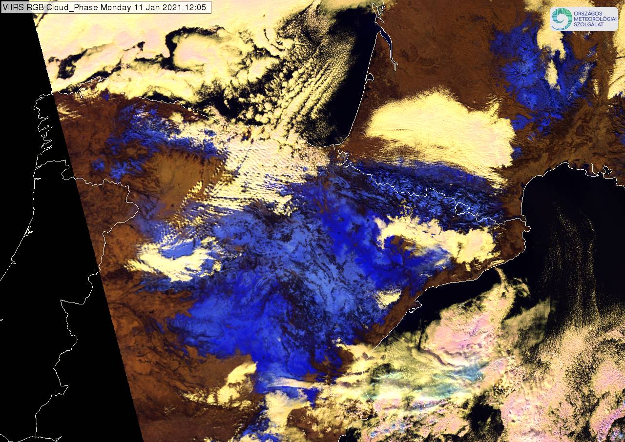 In the Cloud Phase RGB image (Figure 7), snowy areas appear light/medium/dark blue. It is light blue over the Iberian Mountain Chain, where the snow is very likely fine and almost continuous.